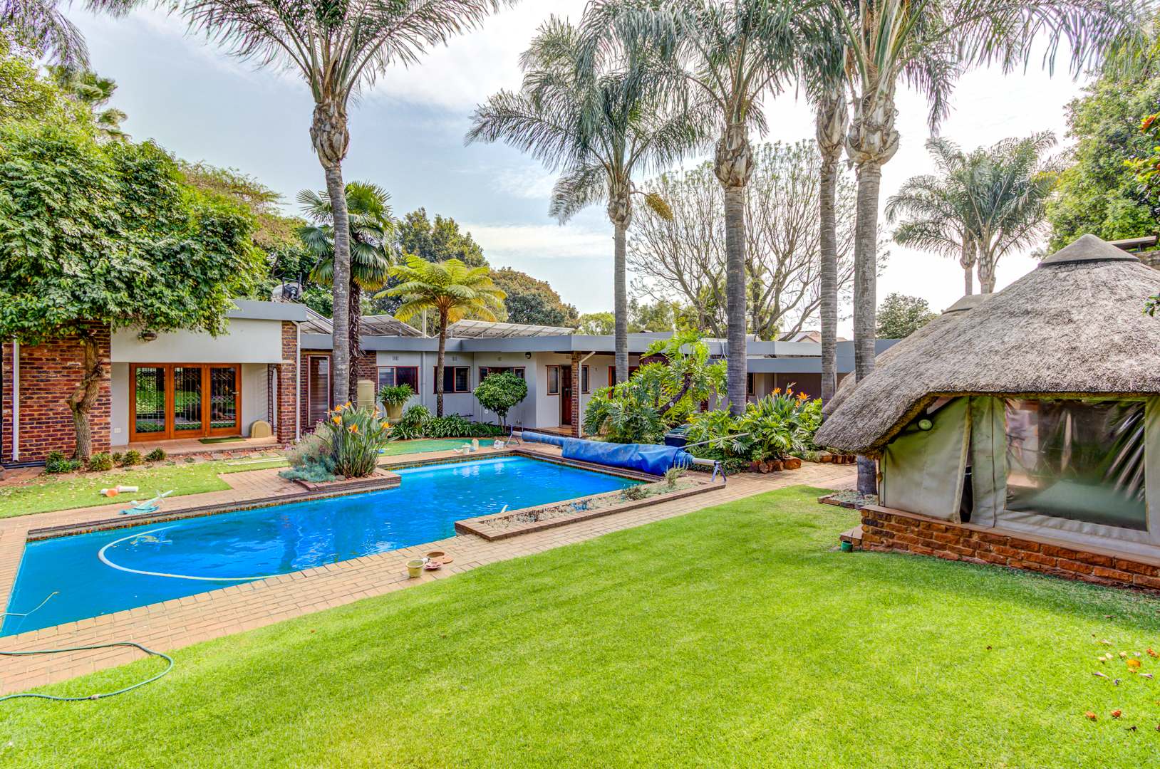 Discover this spacious 4-bedroom, 3-bathroom family home situated on a generous 1650 sqm erf in the desirable suburban area of Glen Marais, Kempton Park, South Africa. The property immediately impresses with its inviting curb appeal, featuring a beautifully landscaped tropical garden, complete with a rock waterfall and pond, leading to an attractive entrance with brick pillars and wooden double doors, secured by security gates.