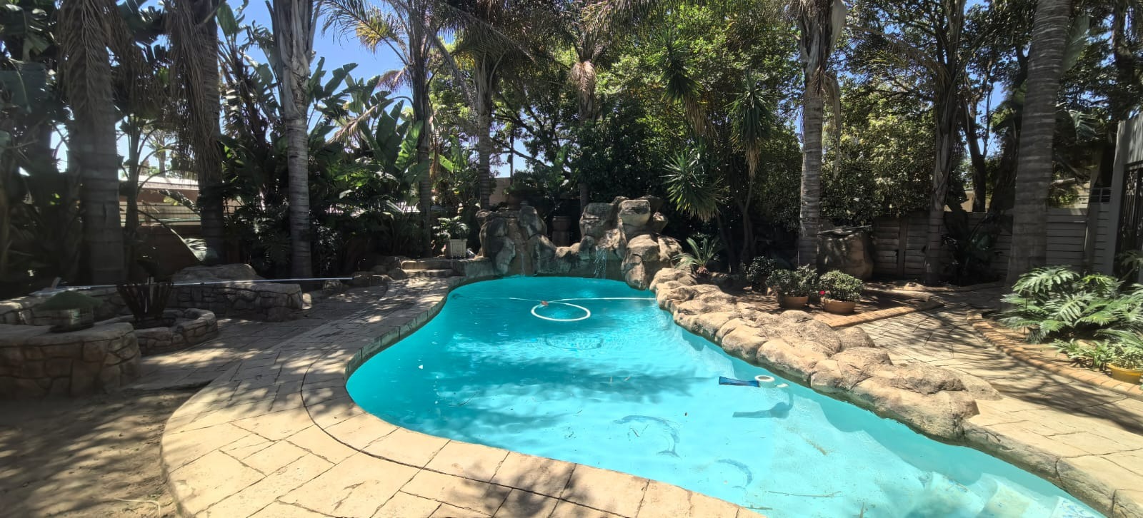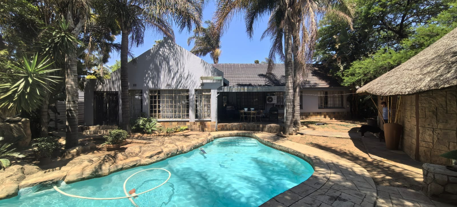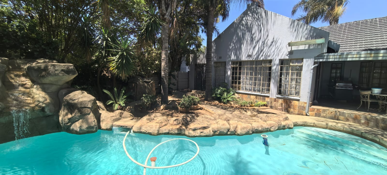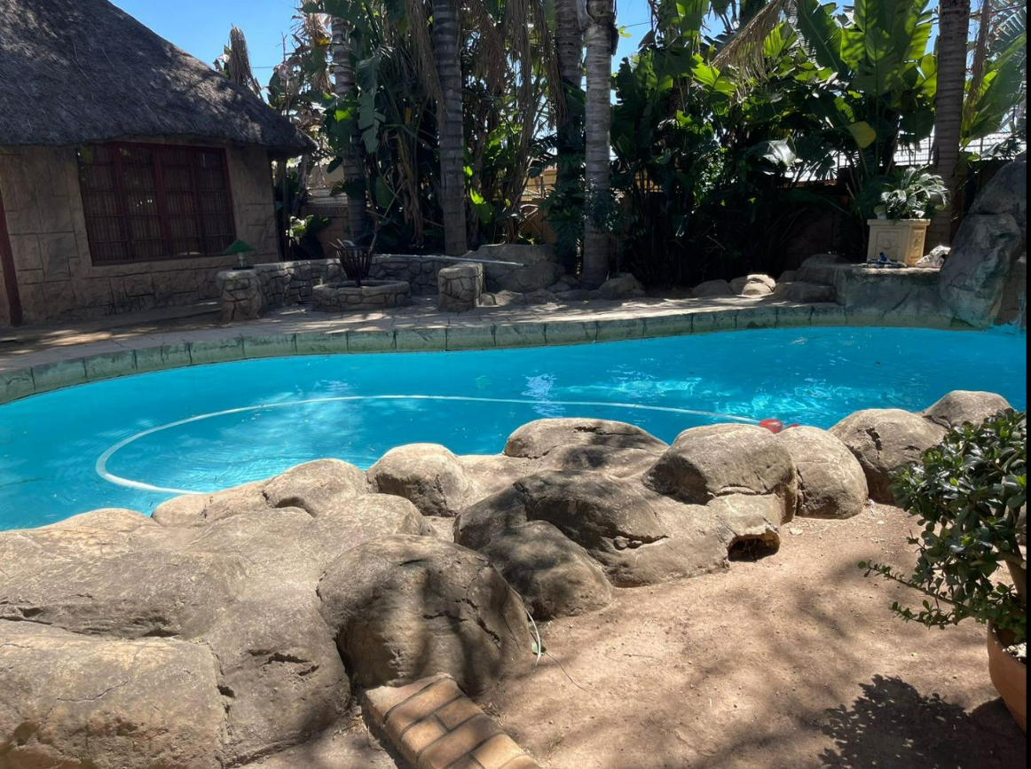 Discover this inviting 4-bedroom, 2-bathroom family home situated in a secure gated community in Glen Marais, Kempton Park. Boasting a generous 400 sqm under roof on a 1060 sqm erf, this property offers ample space for comfortable living. The interior features an open-plan design, two lounges, a dedicated dining room, and a family/TV room, providing versatile living areas. The well-appointed kitchen is equipped with rich wooden cabinetry, granite countertops, a built-in oven and hob, and a convenient pantry, all illuminated by natural light. An additional study and entrance hall complete the functional layout. The four spacious bedrooms are complemented by two bathrooms, including a private en-suite, ensuring comfort and privacy for the entire family. Step outside to a private oasis designed for relaxation and entertainment. The property features a refreshing swimming pool with a charming rock waterfall, a covered patio perfect for outdoor dining, and a unique thatched-roof lapa complete with a built-in braai area. The lush garden and extensive paving create an appealing outdoor environment. Parking is abundant with a double garage and multiple carports, accommodating numerous vehicles securely. Security is paramount within this gated community, offering 24-hour security, a security post, and access gates. The home itself is fitted with burglar bars and security gates on sliding doors, providing peace of mind. Fibre connectivity is also available, catering to modern lifestyle needs. The property presents excellent kerb appeal with its large brick-paved driveway, mature trees, and attractive stone cladding accents, creating a welcoming first impression. Glen Marais is a sought-after residential suburb in Kempton Park, known for its family-friendly atmosphere and convenient access to amenities. Key Features: * 4 Bedrooms, 2 Bathrooms (1 En-suite) * 2 Lounges, Dining Room, Family/TV Room, Study * Spacious Kitchen with Granite Countertops and Pantry * Private Swimming Pool with Rock Waterfall * Covered Patio and Lapa with Built-in Braai Area * Double Garage and Ample Covered Parking * Gated Community with 24-Hour Security and Fibre * Large 1060 sqm Erf with Paved Driveway