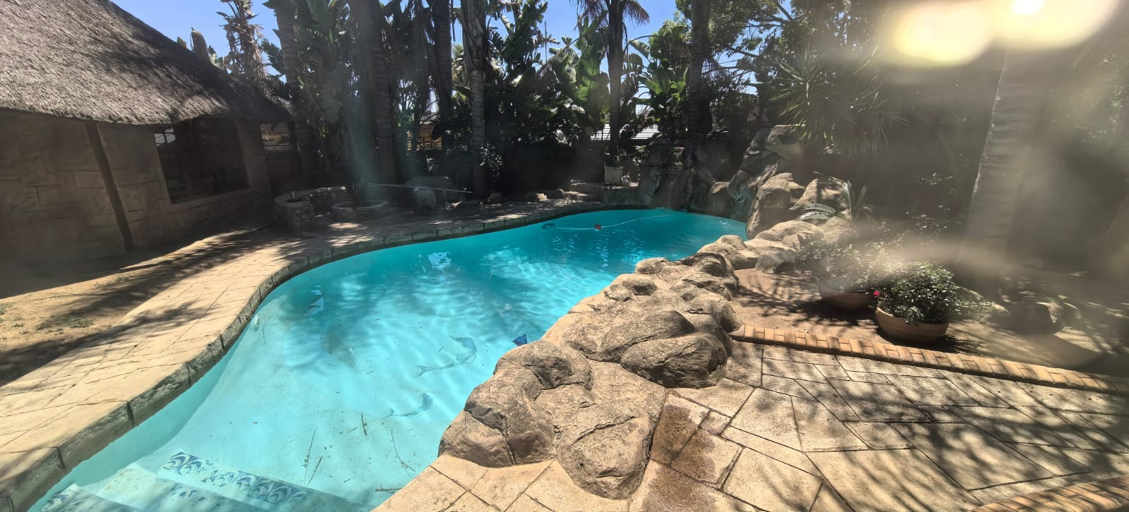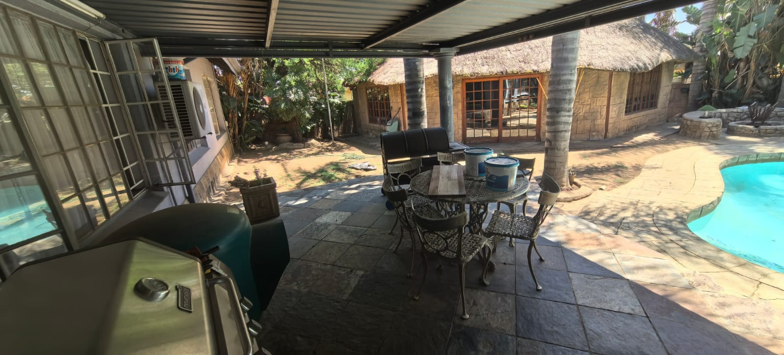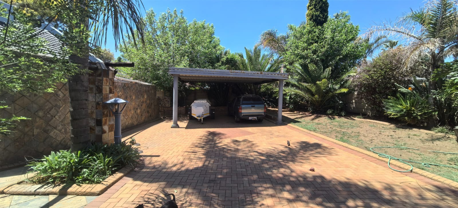 Discover this inviting 4-bedroom, 2-bathroom family home situated in a secure gated community in Glen Marais, Kempton Park. Boasting a generous 400 sqm under roof on a 1060 sqm erf, this property offers ample space for comfortable living. The interior features an open-plan design, two lounges, a dedicated dining room, and a family/TV room, providing versatile living areas. The well-appointed kitchen is equipped with rich wooden cabinetry, granite countertops, a built-in oven and hob, and a convenient pantry, all illuminated by natural light. An additional study and entrance hall complete the functional layout. The four spacious bedrooms are complemented by two bathrooms, including a private en-suite, ensuring comfort and privacy for the entire family. Step outside to a private oasis designed for relaxation and entertainment. The property features a refreshing swimming pool with a charming rock waterfall, a covered patio perfect for outdoor dining, and a unique thatched-roof lapa complete with a built-in braai area. The lush garden and extensive paving create an appealing outdoor environment. Parking is abundant with a double garage and multiple carports, accommodating numerous vehicles securely. Security is paramount within this gated community, offering 24-hour security, a security post, and access gates. The home itself is fitted with burglar bars and security gates on sliding doors, providing peace of mind. Fibre connectivity is also available, catering to modern lifestyle needs. The property presents excellent kerb appeal with its large brick-paved driveway, mature trees, and attractive stone cladding accents, creating a welcoming first impression. Glen Marais is a sought-after residential suburb in Kempton Park, known for its family-friendly atmosphere and convenient access to amenities. Key Features: * 4 Bedrooms, 2 Bathrooms (1 En-suite) * 2 Lounges, Dining Room, Family/TV Room, Study * Spacious Kitchen with Granite Countertops and Pantry * Private Swimming Pool with Rock Waterfall * Covered Patio and Lapa with Built-in Braai Area * Double Garage and Ample Covered Parking * Gated Community with 24-Hour Security and Fibre * Large 1060 sqm Erf with Paved Driveway