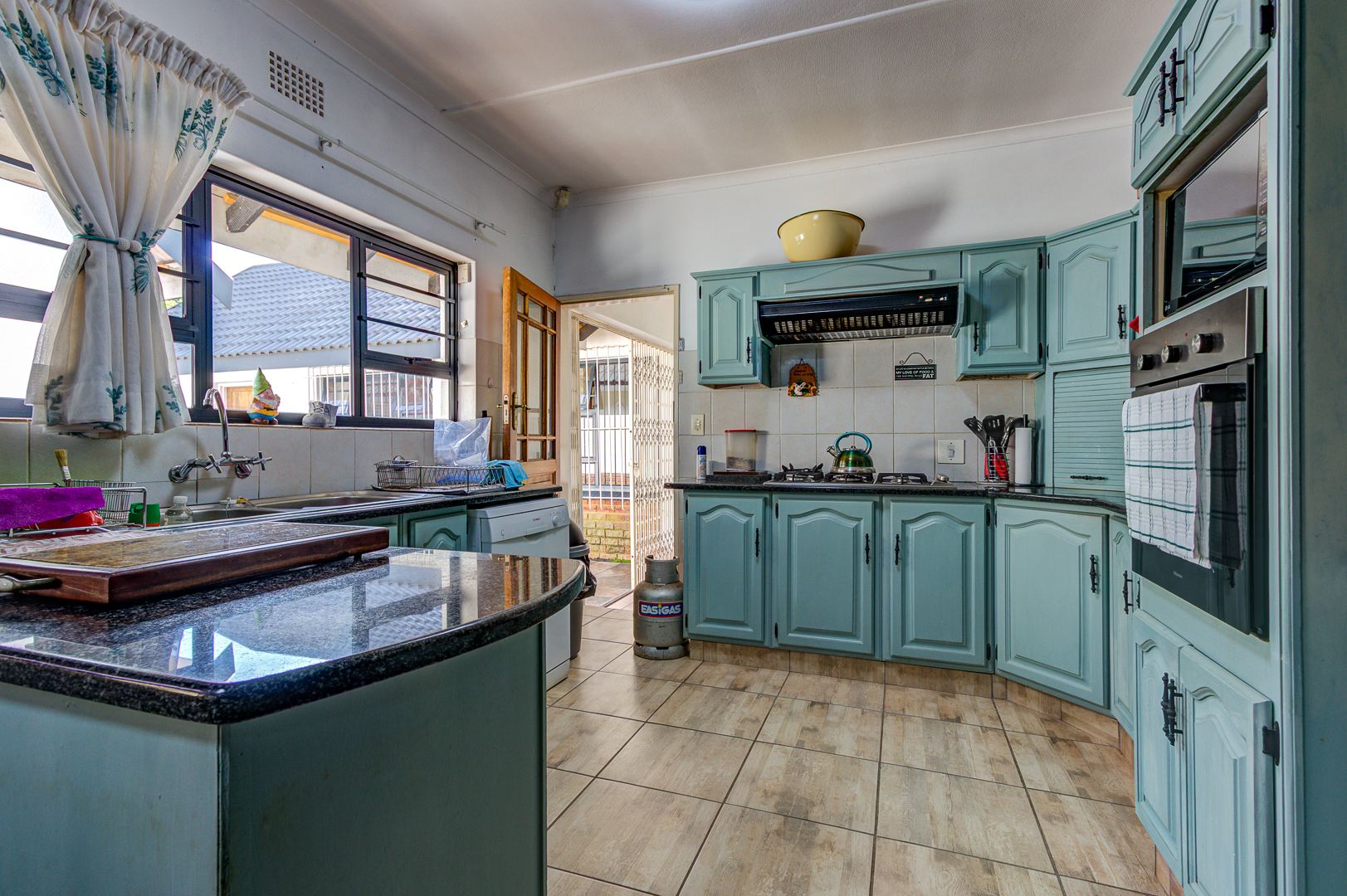The modern kitchen is designed for both practicality and style, boasting granite countertops, a breakfast nook, eye-level oven, and a 4-plate gas stove—perfect for family meals and entertaining.