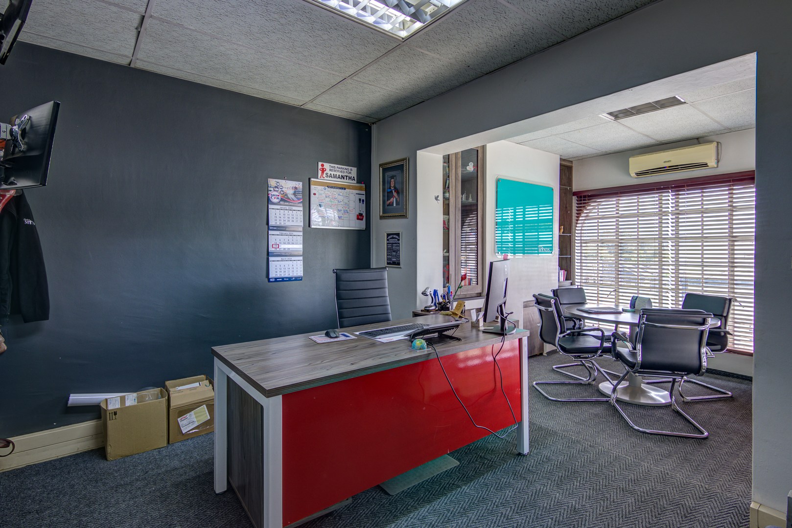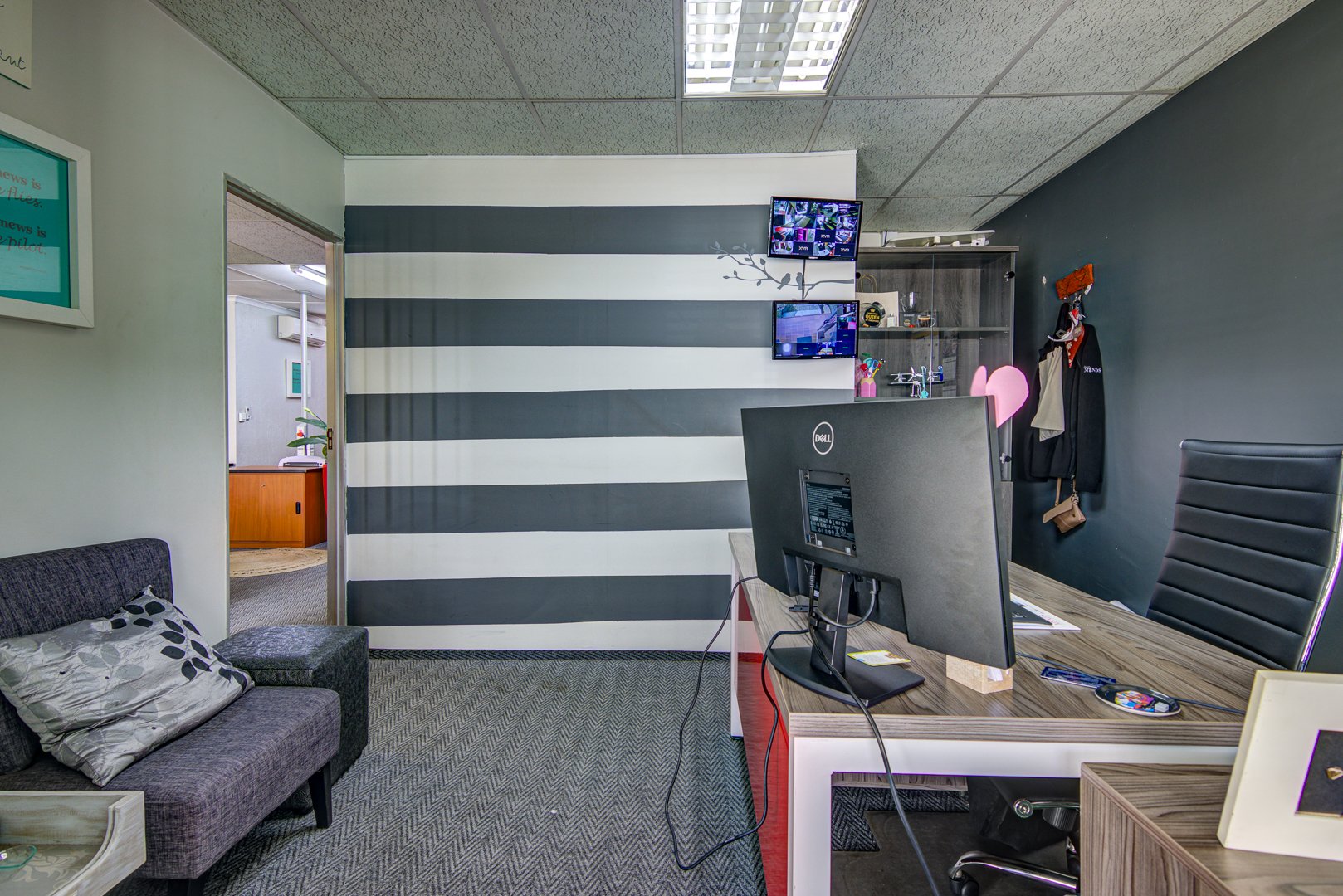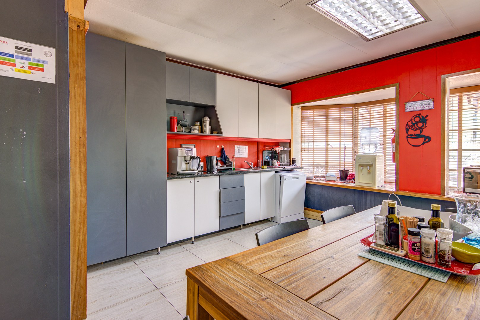 Carpeted reception area, open plan office with 3 working stations. 1 Large carpeted office (double volume) with aircon and blinds. 1 Server room or store room with inverter and battery. Large kitchen with zink, space for a dishwasher and built-in cupboards. 1 Bathroom
