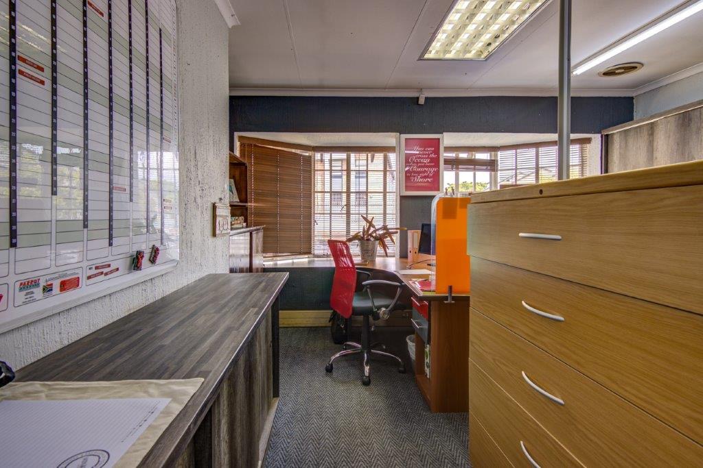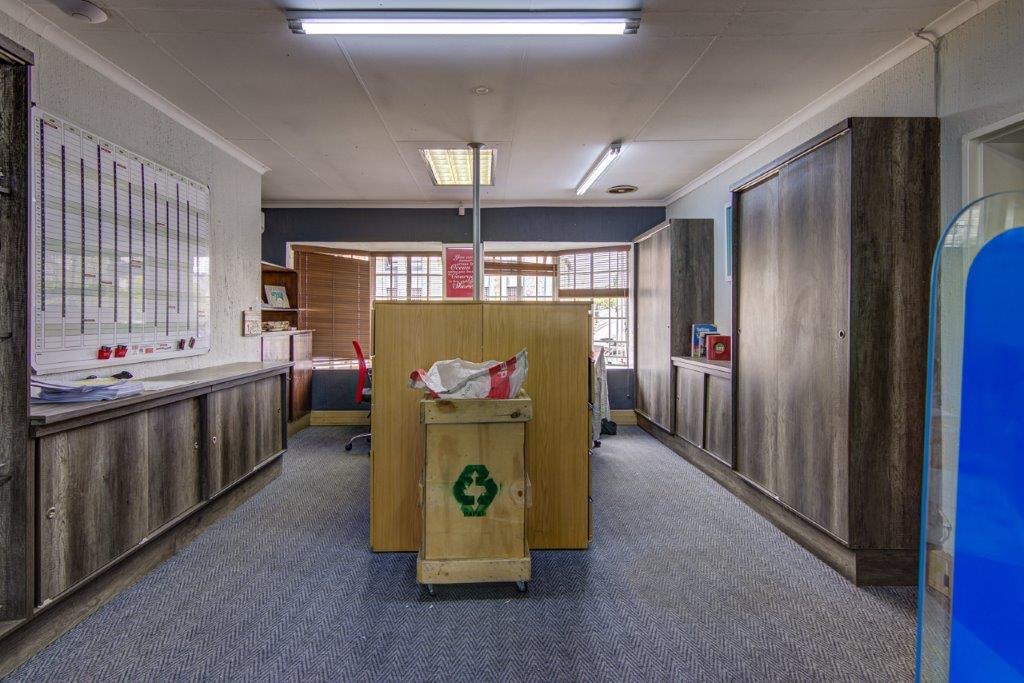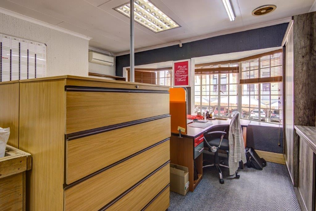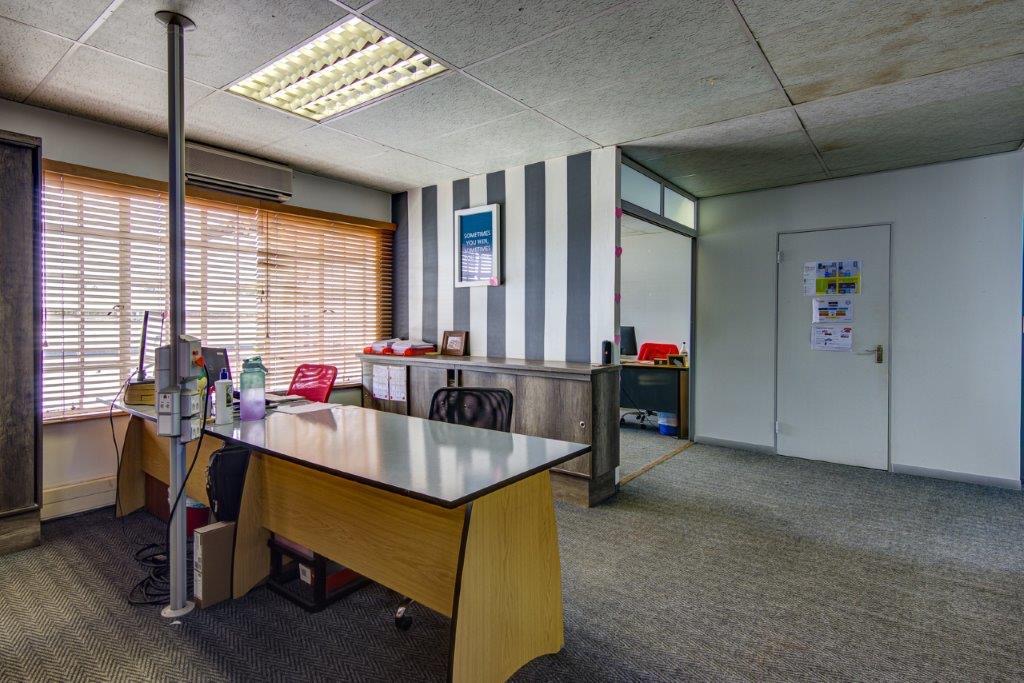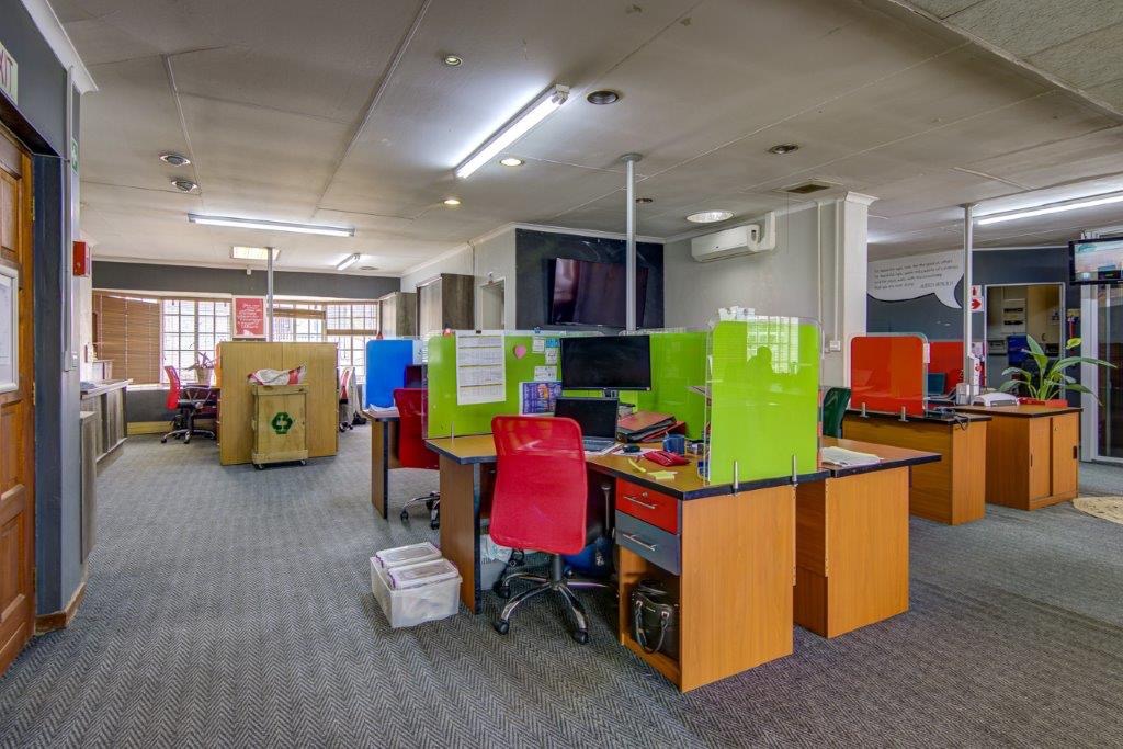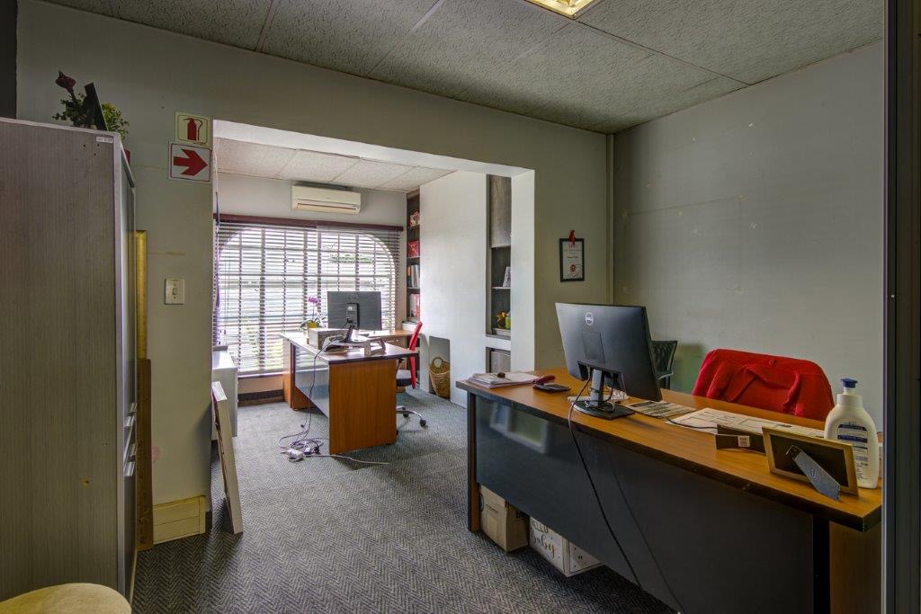 Carpeted reception area, open plan office with 3 working stations. 1 Large carpeted office (double volume) with aircon and blinds. 1 Server room or store room with inverter and battery. Large kitchen with zink, space for a dishwasher and built-in cupboards. 1 Bathroom.