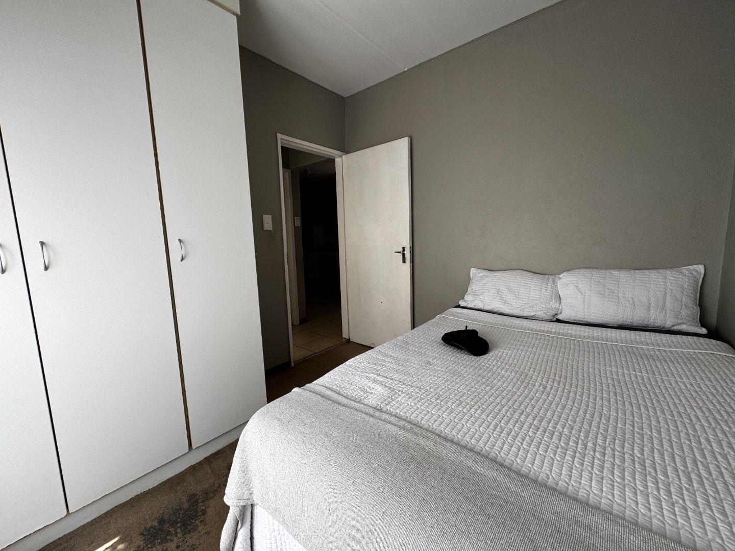 Accommodation consists of two carpeted bedrooms, both with built-in wardrobes. The main bedroom is generously sized, comfortably accommodating a larger bed and additional furniture, while the second bedroom is ideal as a guest room, child’s room, or home office. The bathroom is fully tiled and includes a bathtub, basin, and toilet, catering to both comfort and functionality.