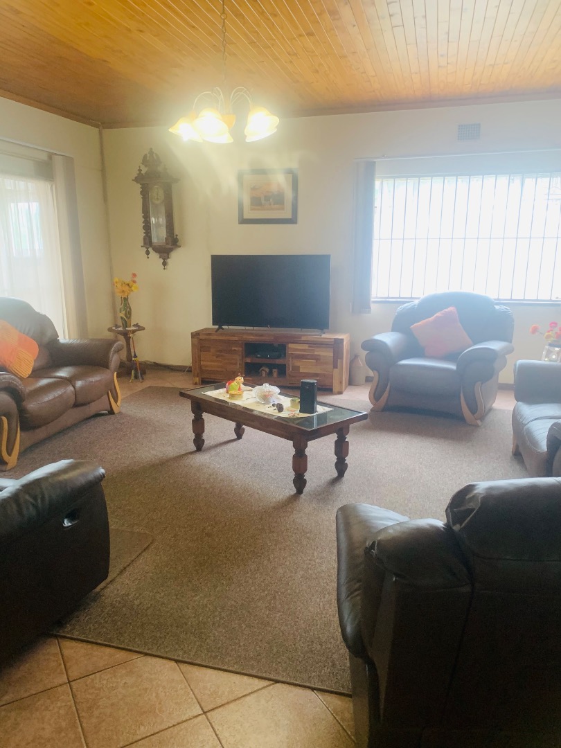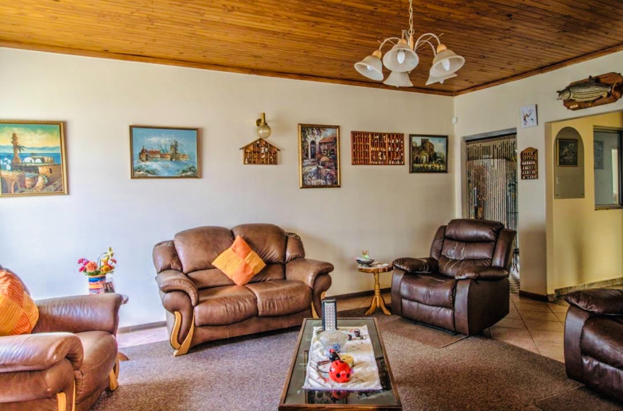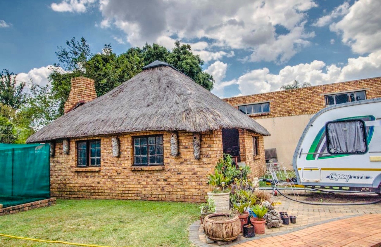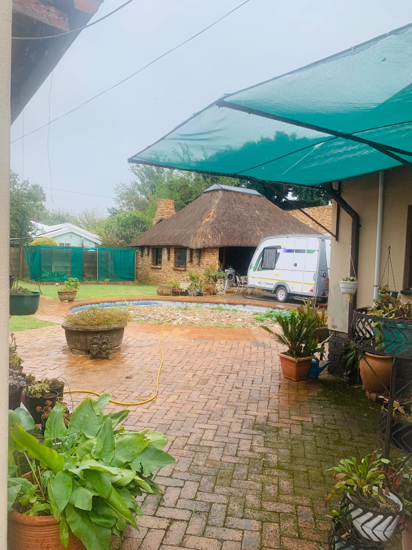 Step outside to a meticulously maintained garden and expansive paved areas, providing ample space for outdoor activities. The property boasts a large paved driveway leading to a covered carport and two garages, ensuring abundant parking for residents and guests. A distinctive thatched lapa and bachelor cottage.