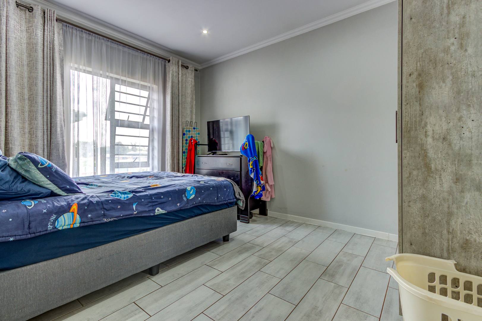 A spacious lounge provides a comfortable area for relaxation, complemented by an additional family TV room for versatile living. The dedicated entertainment area is a true highlight, perfect for hosting gatherings. It features a built-in braai and sliding doors that effortlessly extend the living space outdoors, creating an ideal indoor-outdoor flow for year-round enjoyment. Upstairs, three generously sized bedrooms offer peaceful retreats, accompanied by two full bathrooms, including a private ensuite.