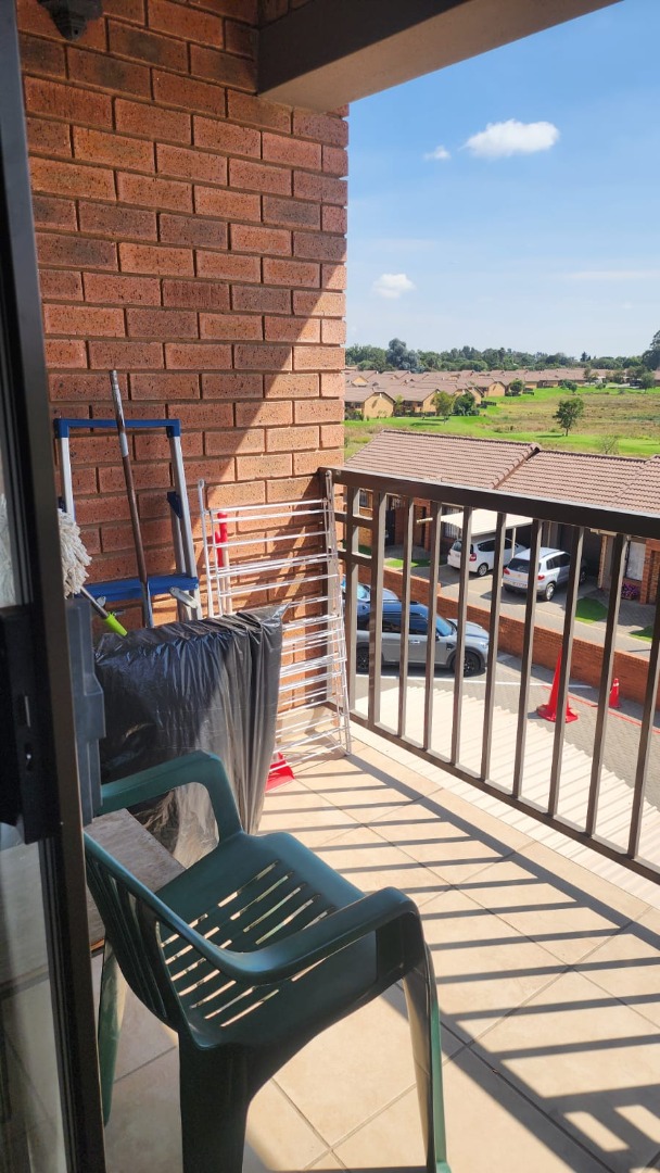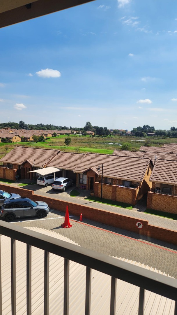 The modern kitchen is fitted with granite countertops, an under-counter oven, extractor fan, and space for a single fridge and one appliance. The lounge opens onto a private balcony through sliding doors, offering peaceful views over the village and a picturesque dam teeming with birdlife.