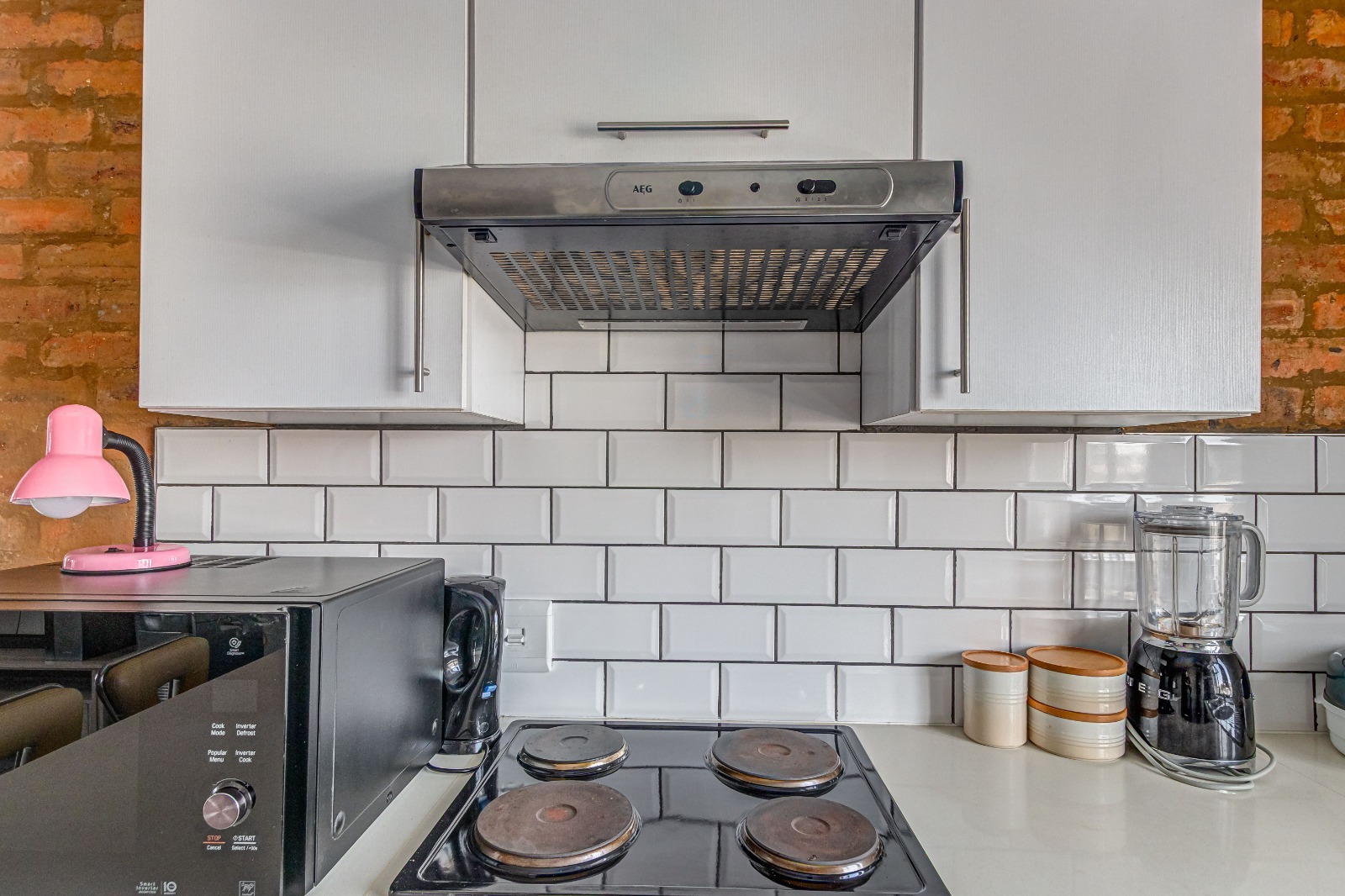 The well appointed kitchen boasts white cabinetry, a subway tile backsplash, and clean white caesar stone countertops. It comes equipped with an oven and hob. There is a convenient breakfast bar for casual dining. Natural light floods the space, enhancing the bright and airy feel, while the living area provides a comfortable setting for relaxation.