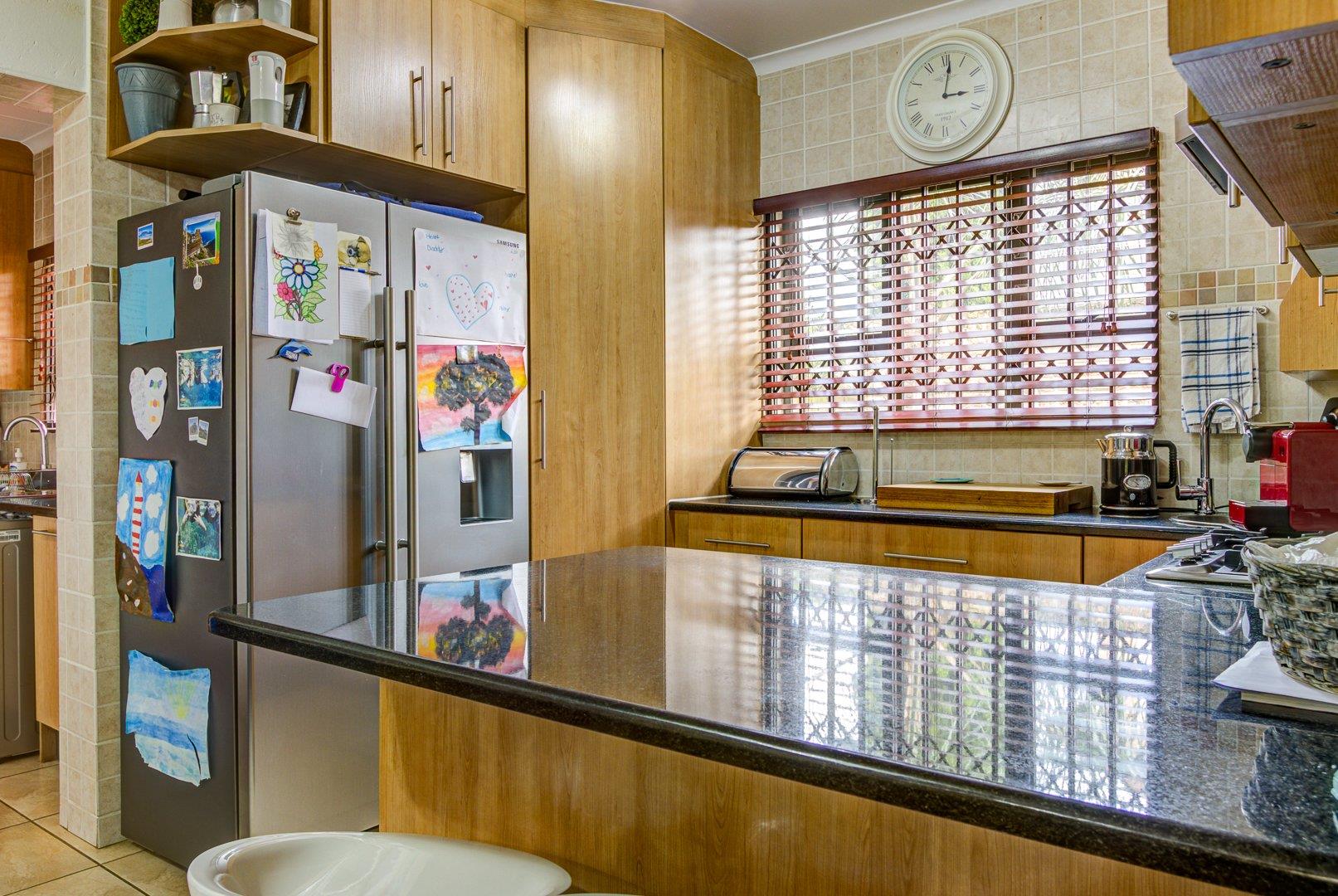When entering the home you are greeted with a very spacious, tiled open plan lounge and kitchen area. The lounge can also be used as a dining room, just depends on your needs. The kitchen is fitted with a gas stove, under counter oven, and space for a double fridge. Granite tops and a breakfast nook together with a separate scullery with space for all your appliances and a double sink. The lounge walks out onto an enclosed patio with a built-in braai and overlooking a solar heated sparkling pool and garden big enough for your kids and dogs or cats to enjoy.