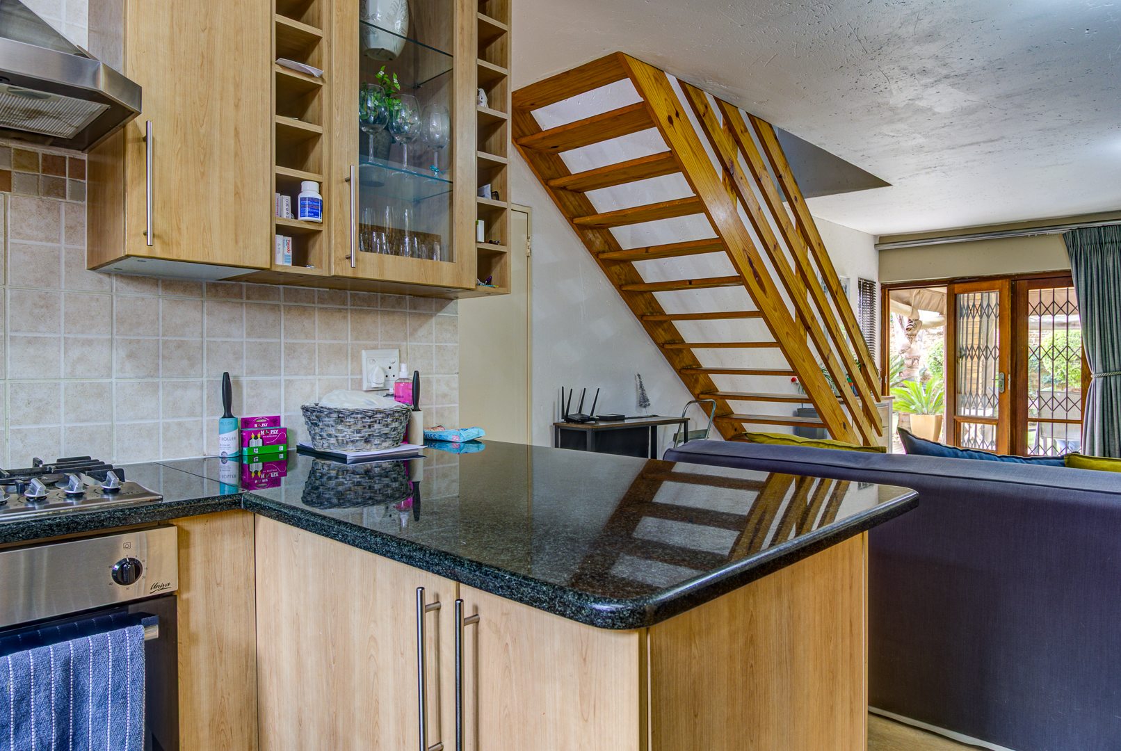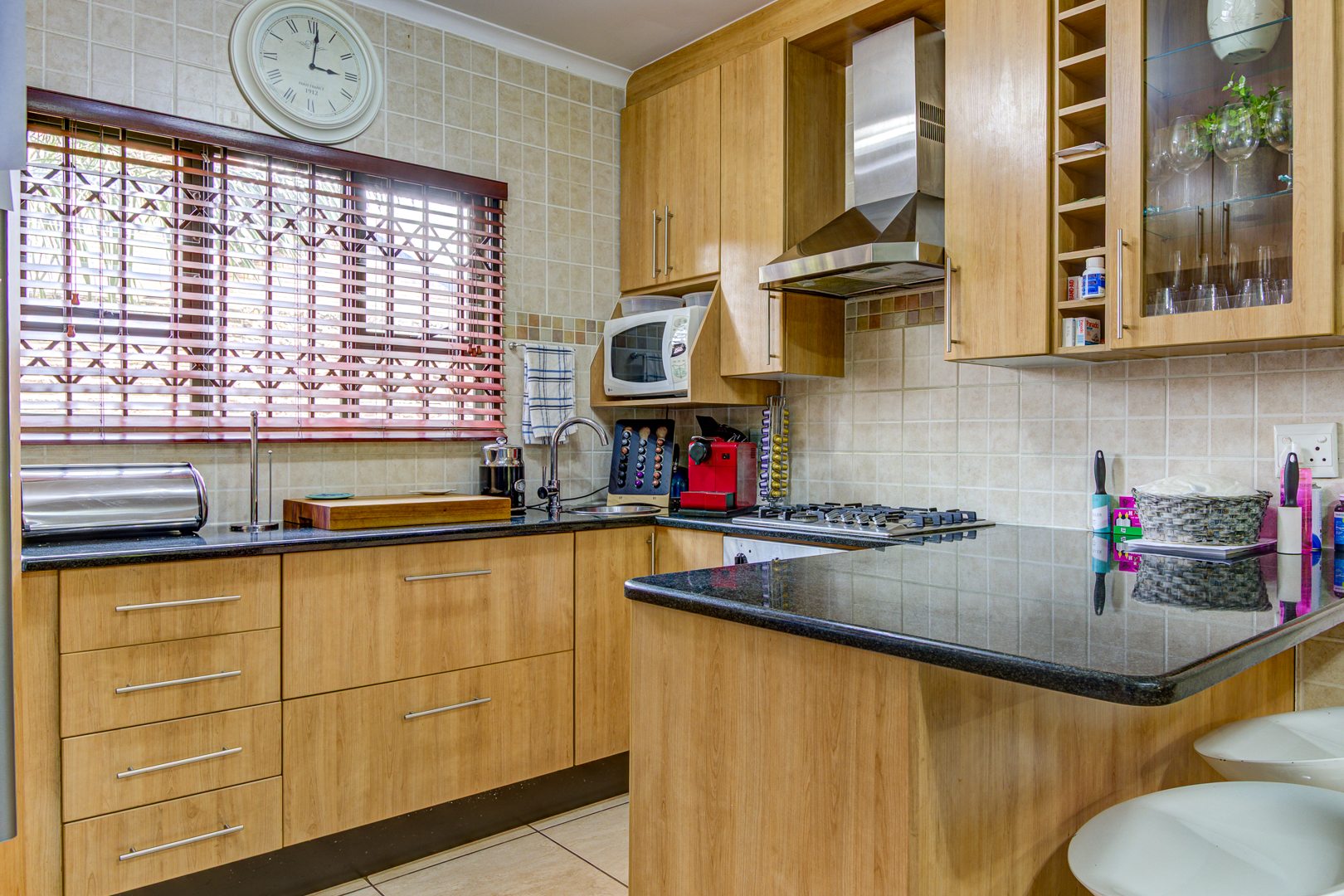 As you step inside, you are welcomed by a spacious tiled open-plan living area that combines the lounge and kitchen, creating a comfortable and versatile space. The lounge can easily double as a dining area, depending on your lifestyle needs. The kitchen is both practical and stylish, featuring granite countertops, a breakfast nook, a gas stove, and an undercounter oven. There is also space for a double-door refrigerator, while the separate scullery provides a double sink and room for all your appliances.