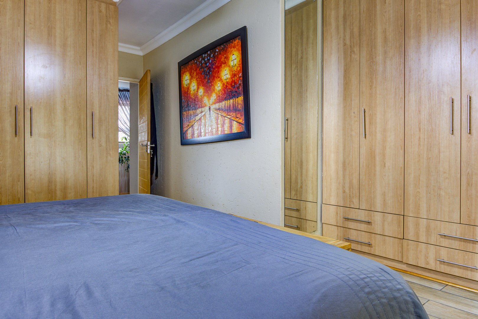 The home offers two spacious bedrooms with laminated flooring and built-in cupboards, which share a well-appointed bathroom. The main bedroom is impressively large and features a full en-suite bathroom. There is also enough space to accommodate a small lounge area, where you can relax while enjoying views of the garden from the balcony.