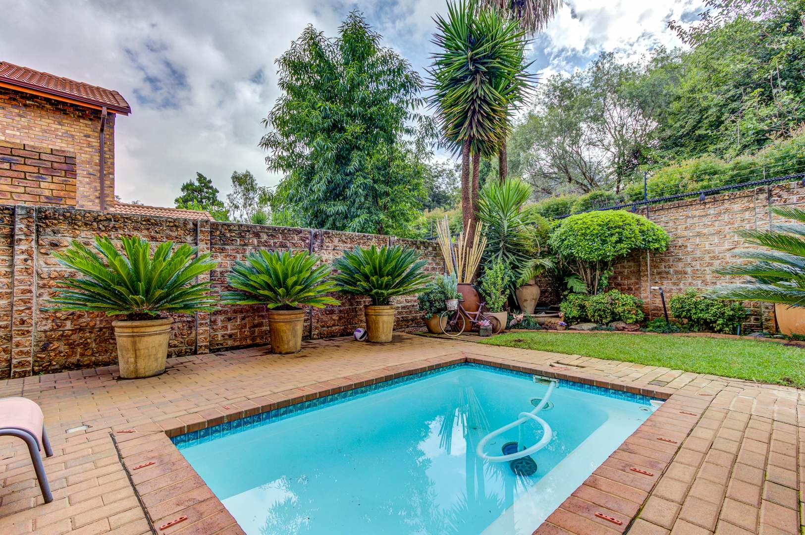 The lounge opens onto an enclosed patio with a built-in braai, making it an ideal space for entertaining. From here you can enjoy views of the sparkling solar-heated swimming pool and a generously sized garden, perfect for children and pets to play and enjoy the outdoors.