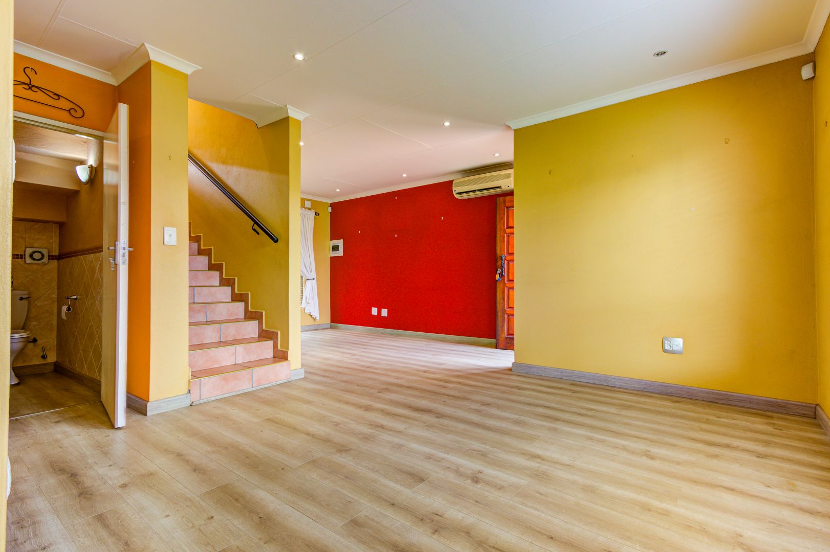 On the ground floor, you’ll find a spacious TV room with tiled flooring that leads to an enclosed patio fitted with roll-up canvas blinds, creating an inviting, all-season entertainment space. The warm and elegant lounge features laminated floors and blinds, while the dining room offers the same refined flooring, additional blinds and an air-conditioning unit for year-round comfort. A guest bathroom serves the living areas, and the modern kitchen is fitted with granite countertops, an under-counter oven with