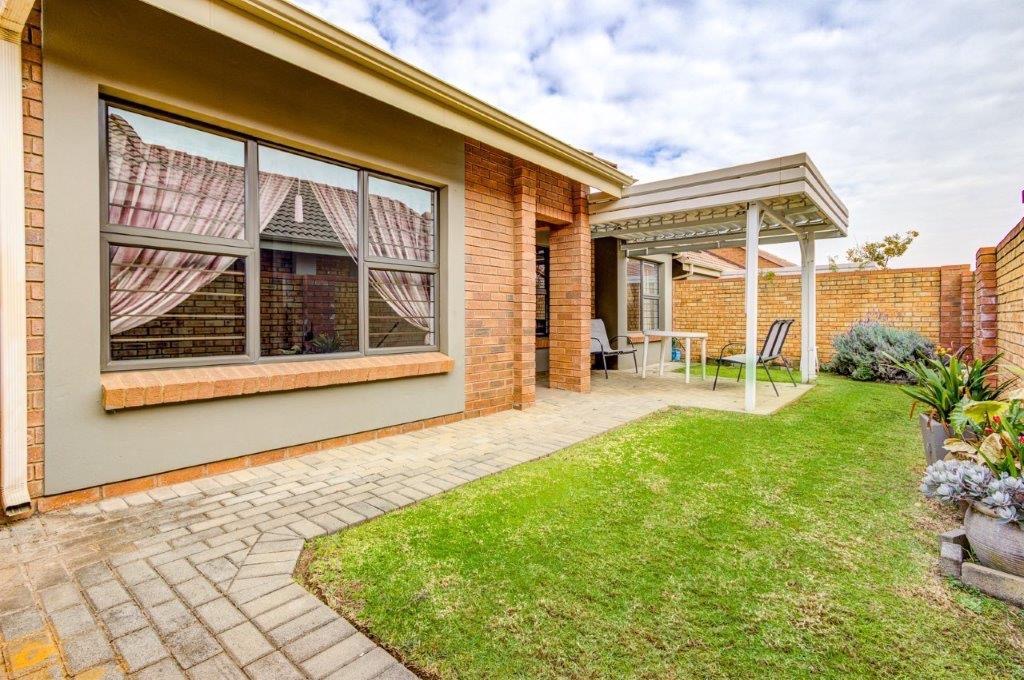 This neat home offers 3 carpeted bedrooms with built-in cupboards and 2 tiled bathrooms, 1 with bath and other with shower (en-suite). Tiled open plan lounge / dining and kitchen. Kitchen with built-in cupboards, under counter oven with extractor fan, space under counter for appliances and breakfast counter. Small private garden with paved patio. Single garage with automated roll-up doors.