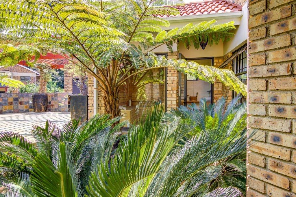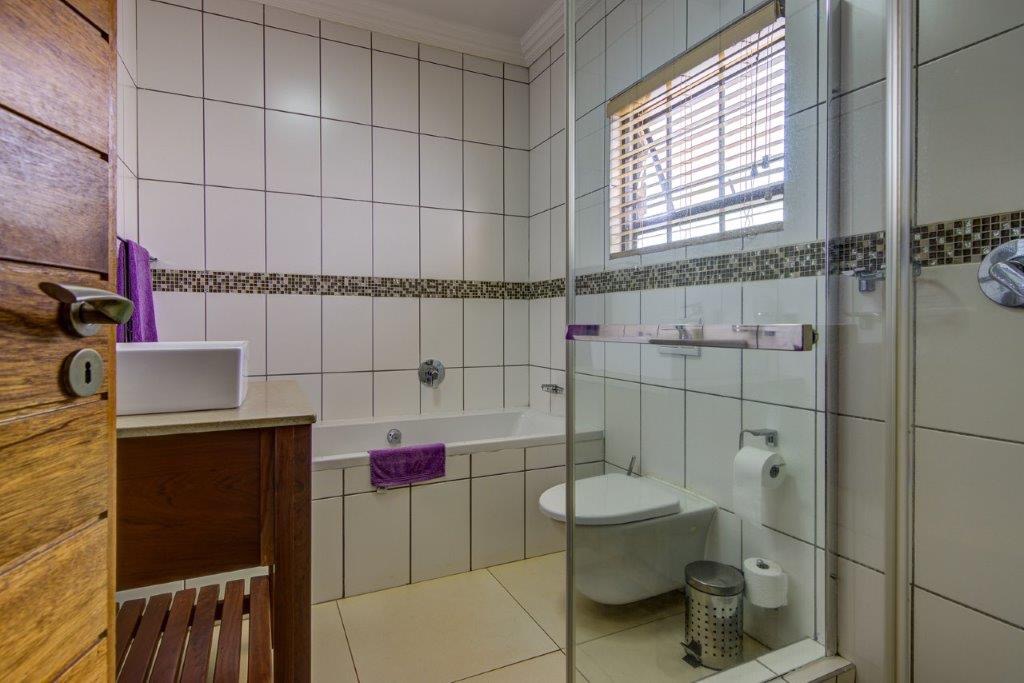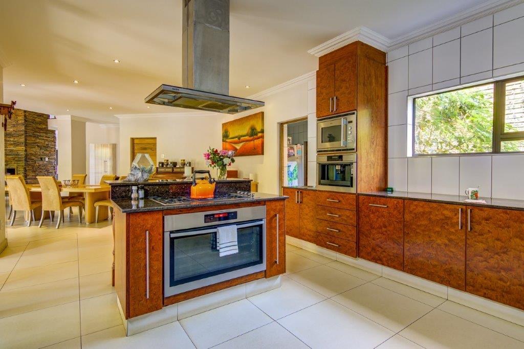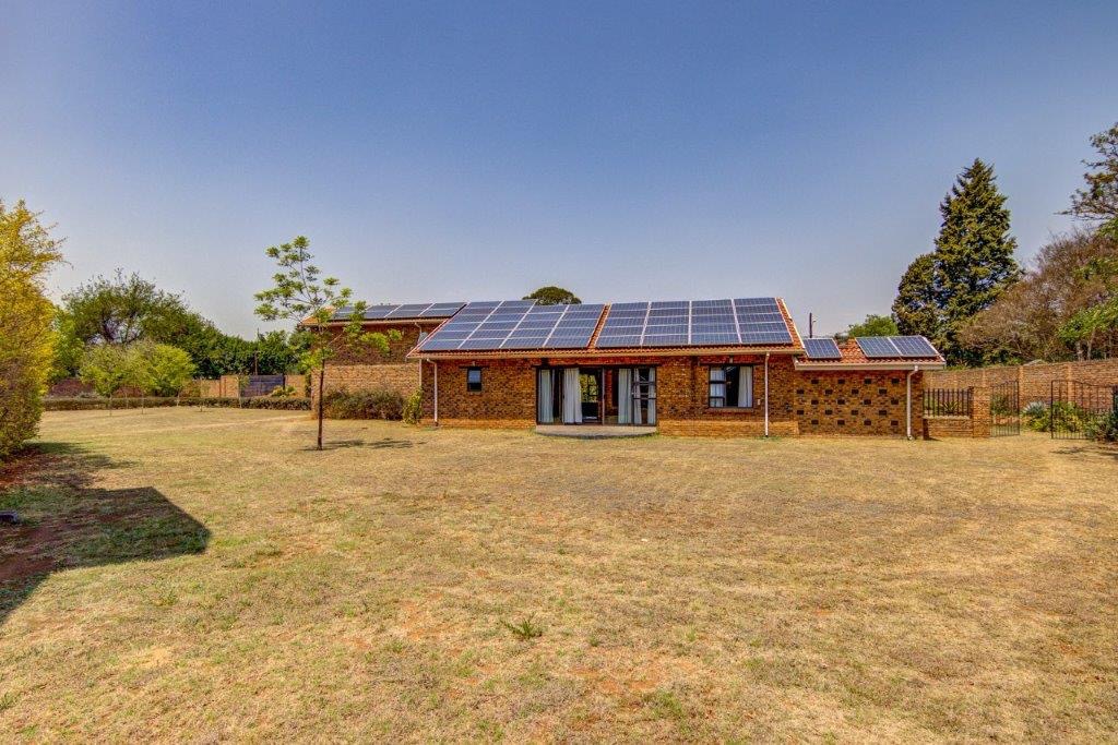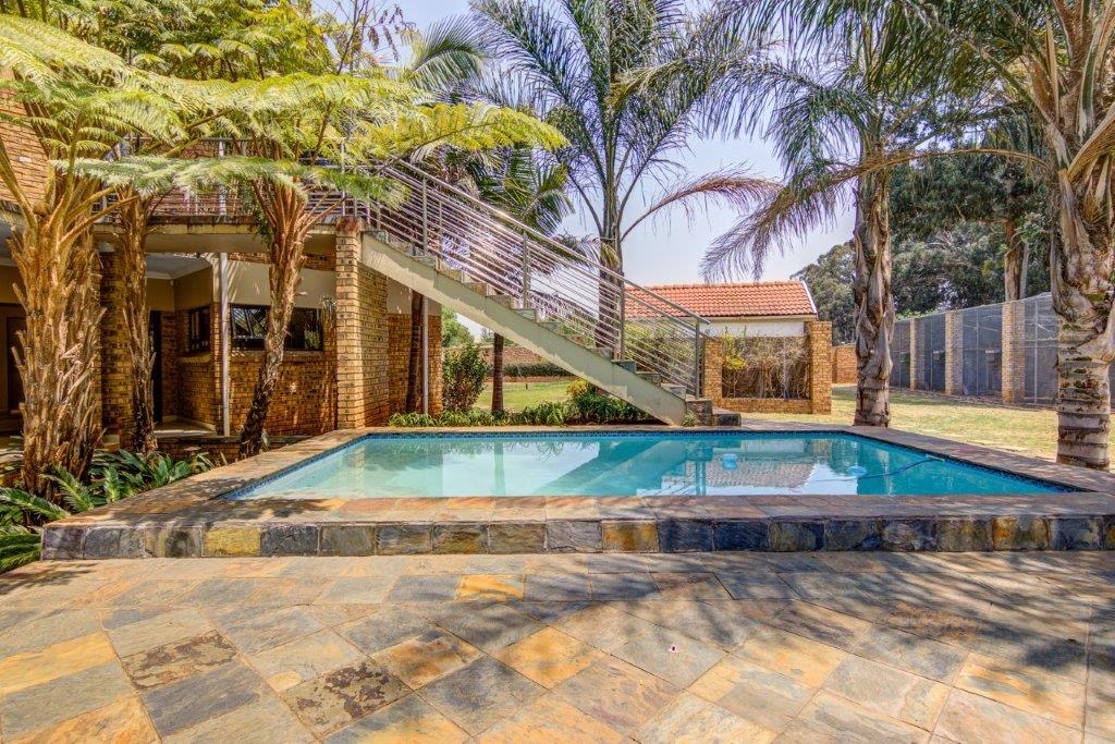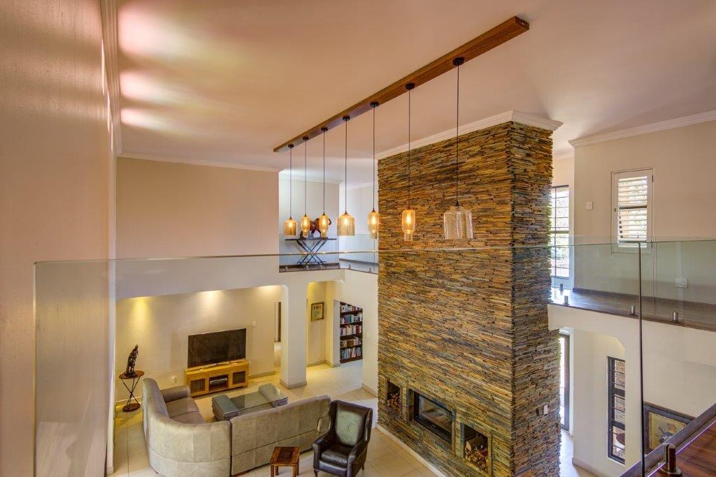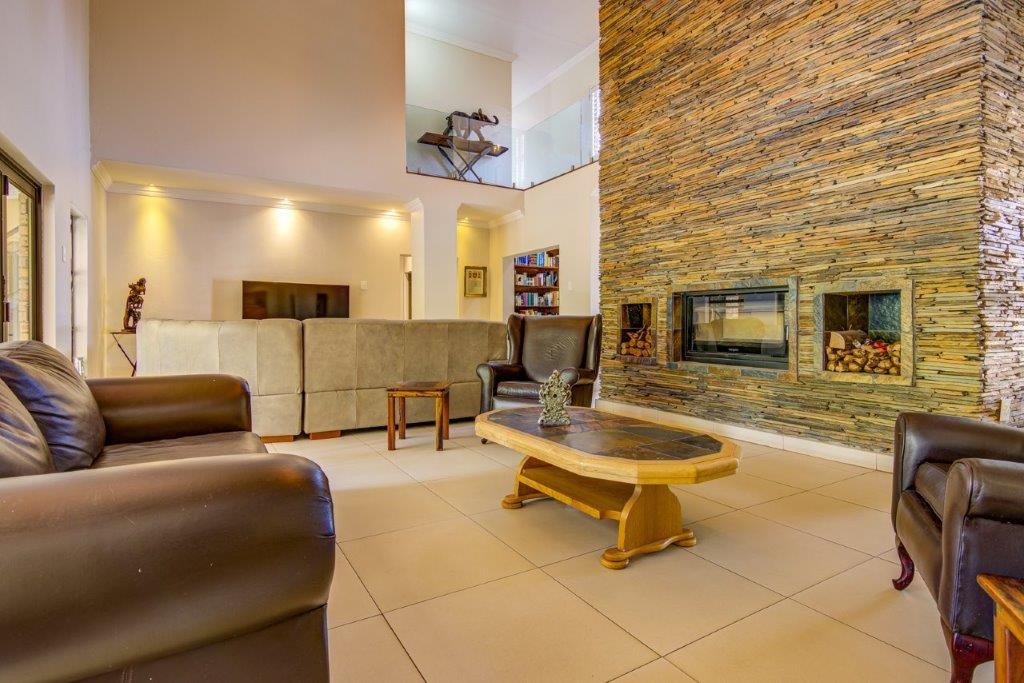 Main house: As you enter the double storey house, you are overwhelmed by the finest and modern finishes. An impressive cladded wall stretching up to the double volume ceiling, greets you! The Architectural design with the high ceiling, natural light and open plan areas is absolutely stunning. A large tiled open plan lounge and dining area with a shared Hergom fireplace perfectly placed. Stacker doors opens up to the covered patio and access to the sauna room, pool and braai patio area. Adjoining is an impressive open plan gourmet chef kitchen with top of the range appliances. A private wine cellar, scullery with indoor garden and water feature is just some of the unexpected extras to be found leading off the kitchen. Further on the ground floor, you will find a well placed library, tiled study room, tiled guest bathroom, walk -in linen cupboard, a large tiled bedroom which opens to the garden, an en-suite with oval bath and shower. Stylish wooden stairs (with roller shutter security gate) leads you to the top floor with a left and right wing! At the left wing you will find a spacious open plan lounge overlooking the impressive lounge and dining room with the impressive view of the fireplace, cladded wall towering to the ceiling. Fitted with a small kitchenette and bar fridge. A double volume bedroom with a door leading to a balcony, fitted with American shutter blinds, large dressing room, en-suite with large oval bathtub, shower and a his-and-hers vanity. Another bedroom, a large study room with own balcony and en-suite bathroom. On the right wing you will find 2 large bedrooms with access to the balcony and en-suite. The house is almost entirely off the grid with it's 60 solar panels, invertor and Lithium battery system. Extras such as borehole, Jojo water tank, store room, servants room with bathroom and pool.