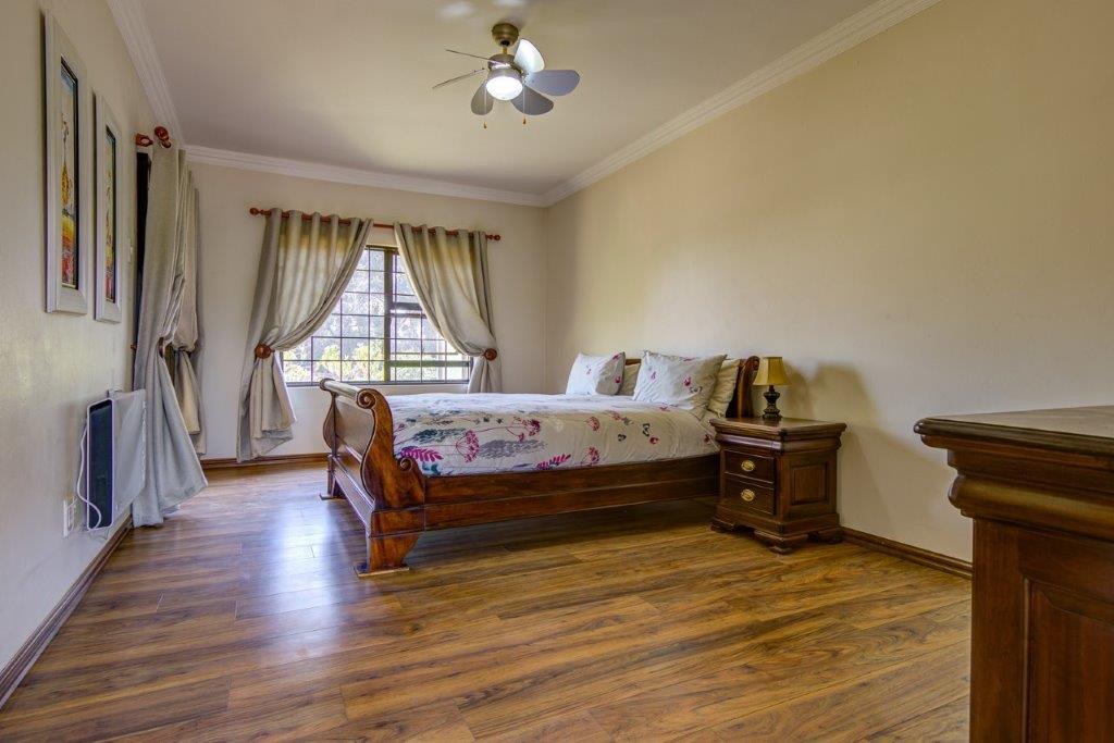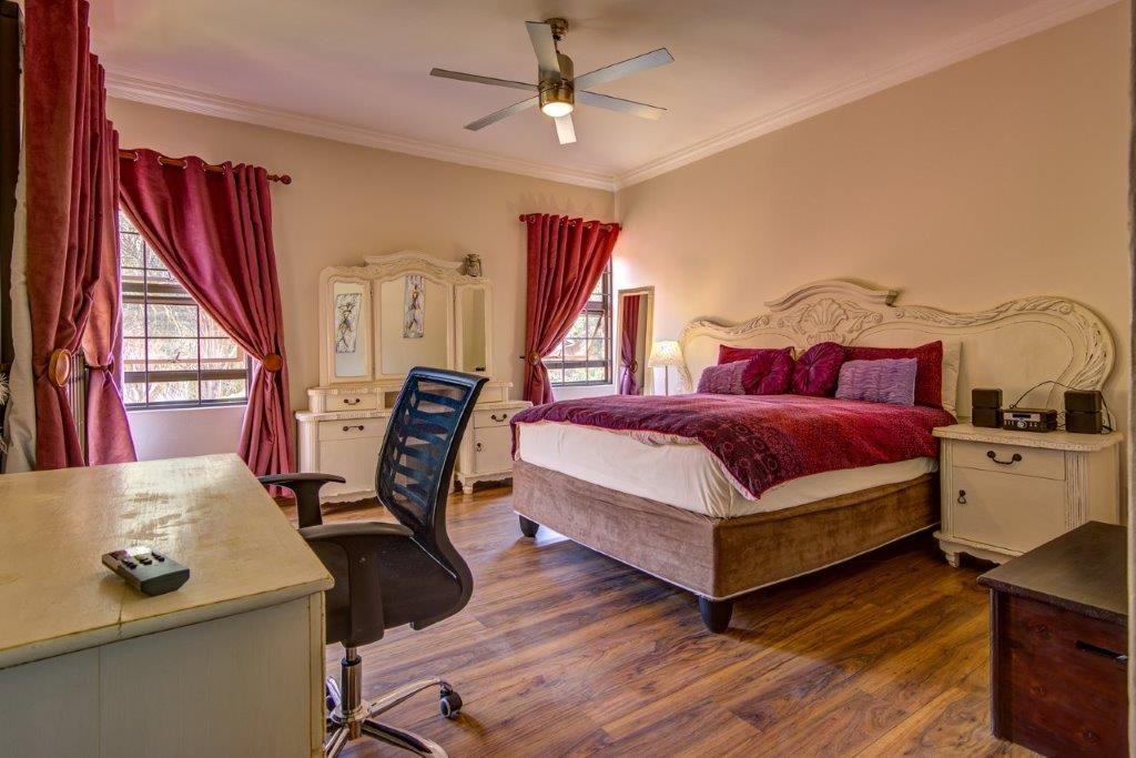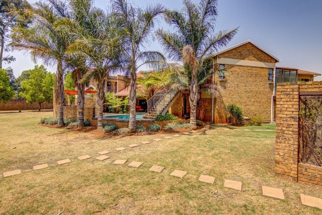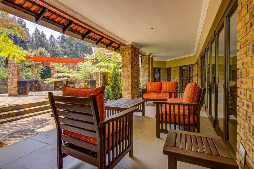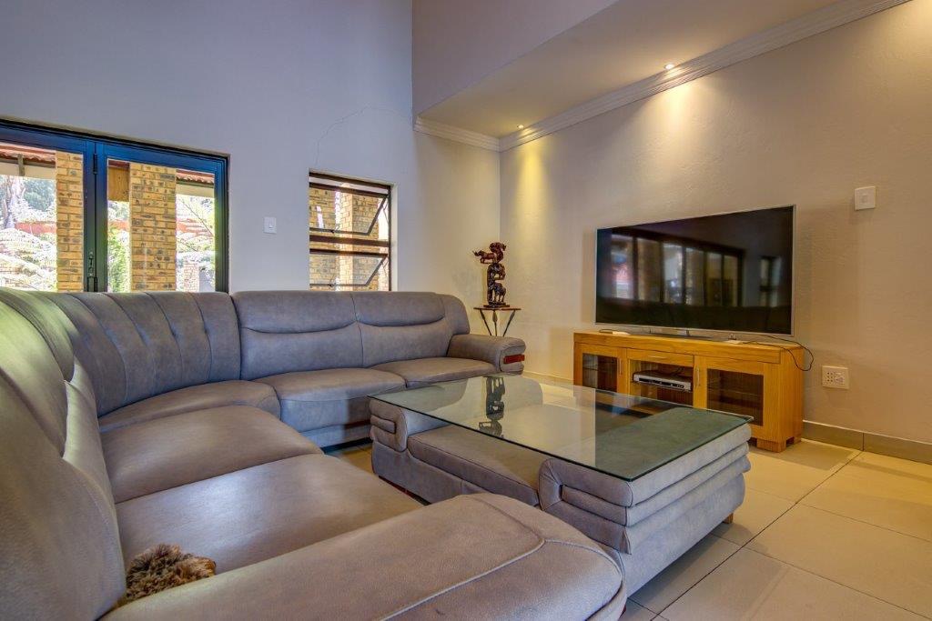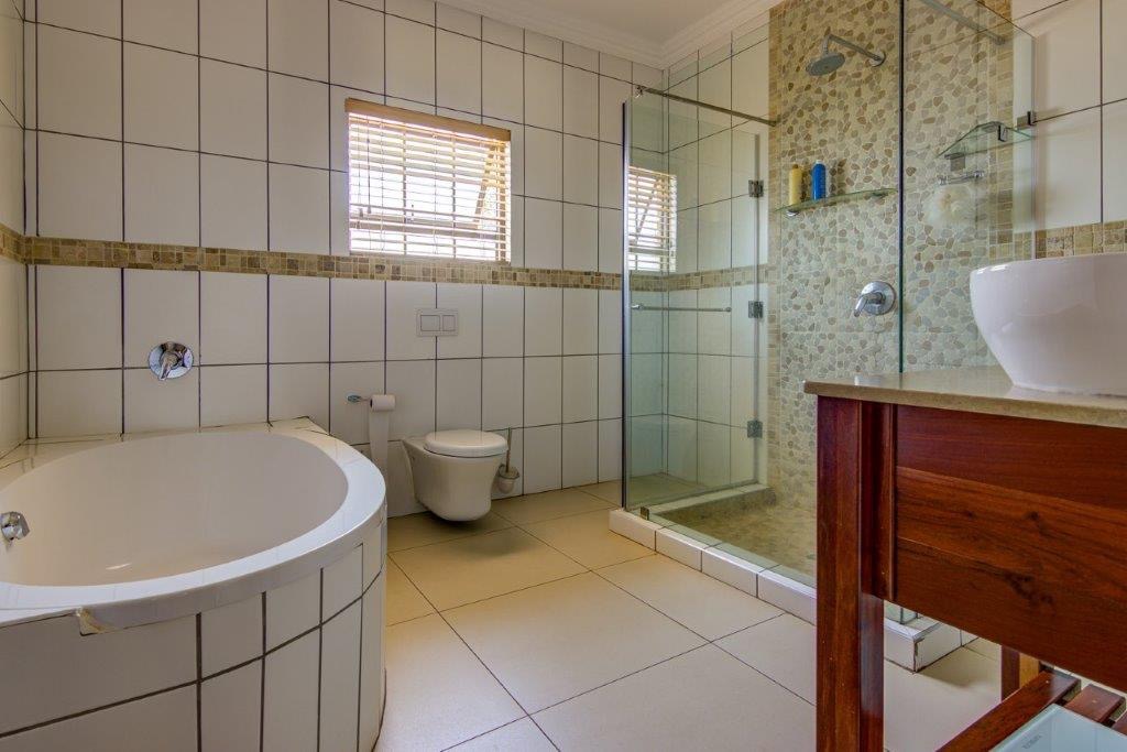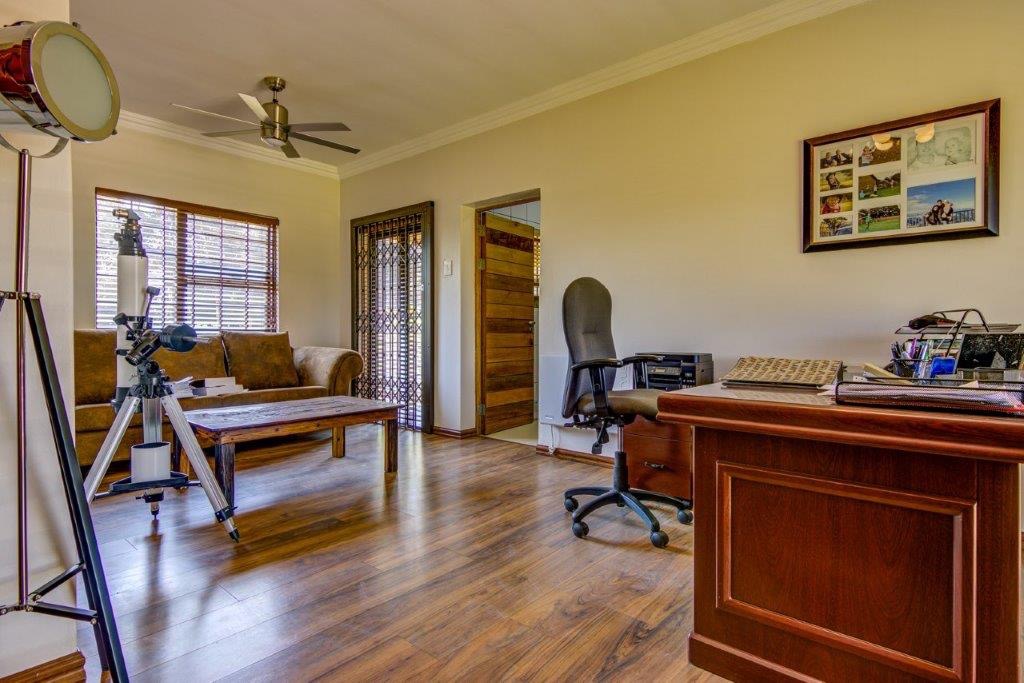 Main house: As you enter the double storey house, you are overwhelmed by the finest and modern finishes. An impressive cladded wall stretching up to the double volume ceiling, greets you! The Architectural design with the high ceiling, natural light and open plan areas is absolutely stunning. A large tiled open plan lounge and dining area with a shared Hergom fireplace perfectly placed. Stacker doors opens up to the covered patio and access to the sauna room, pool and braai patio area. Adjoining is an impressive open plan gourmet chef kitchen with top of the range appliances. A private wine cellar, scullery with indoor garden and water feature is just some of the unexpected extras to be found leading off the kitchen. Further on the ground floor, you will find a well placed library, tiled study room, tiled guest bathroom, walk -in linen cupboard, a large tiled bedroom which opens to the garden, an en-suite with oval bath and shower. Stylish wooden stairs (with roller shutter security gate) leads you to the top floor with a left and right wing! At the left wing you will find a spacious open plan lounge overlooking the impressive lounge and dining room with the impressive view of the fireplace, cladded wall towering to the ceiling. Fitted with a small kitchenette and bar fridge. A double volume bedroom with a door leading to a balcony, fitted with American shutter blinds, large dressing room, en-suite with large oval bathtub, shower and a his-and-hers vanity. Another bedroom, a large study room with own balcony and en-suite bathroom. On the right wing you will find 2 large bedrooms with access to the balcony and en-suite. The house is almost entirely off the grid with it's 60 solar panels, invertor and Lithium battery system. Extras such as borehole, Jojo water tank, store room, servants room with bathroom and pool.