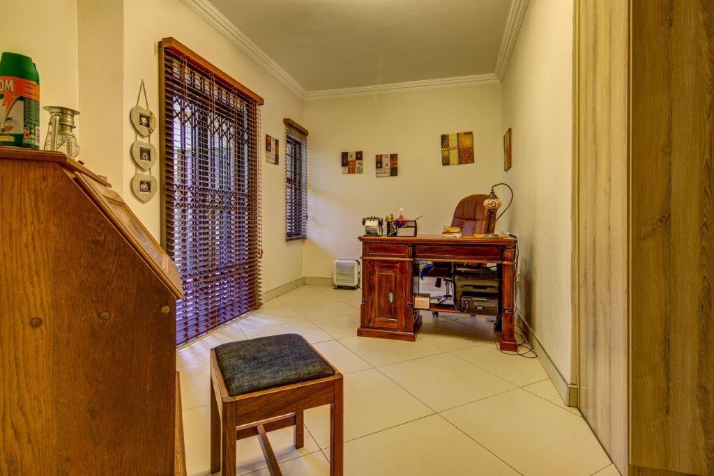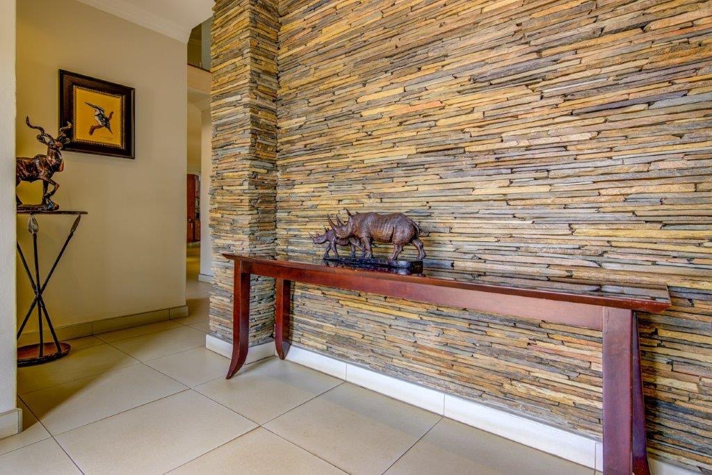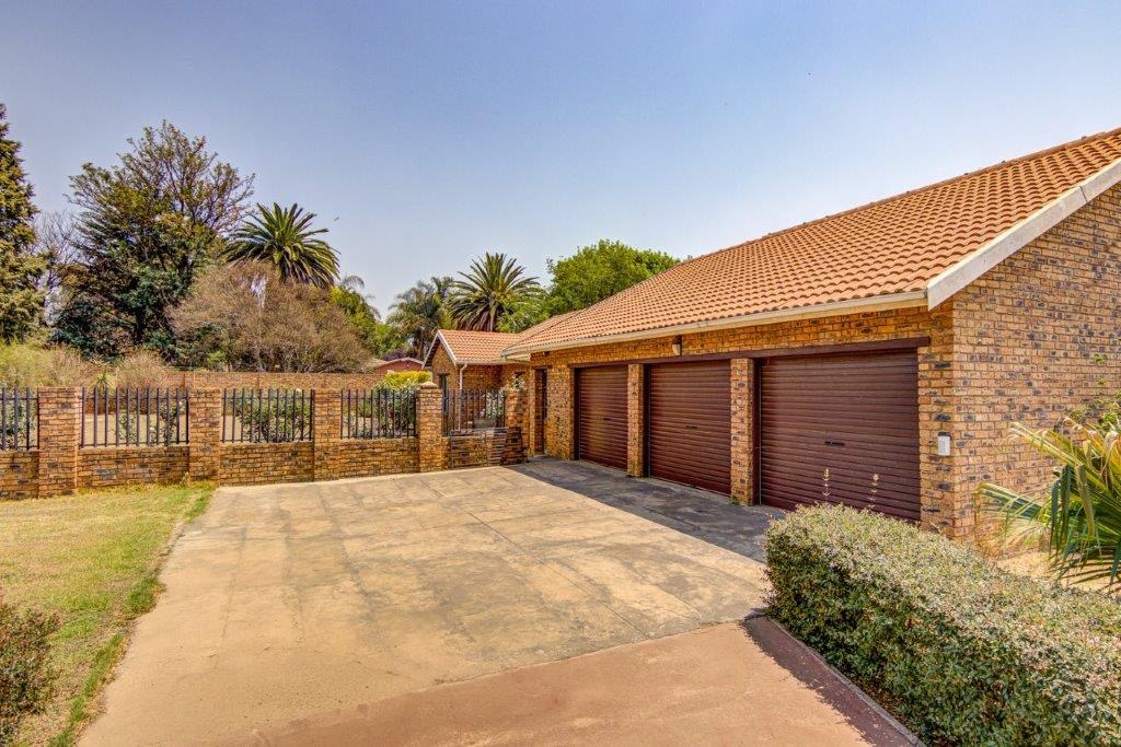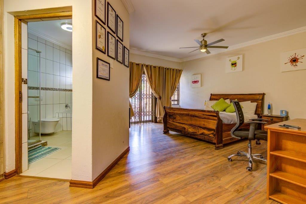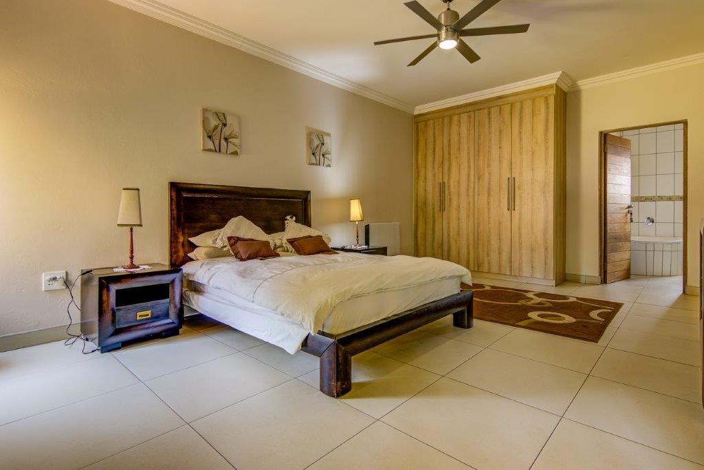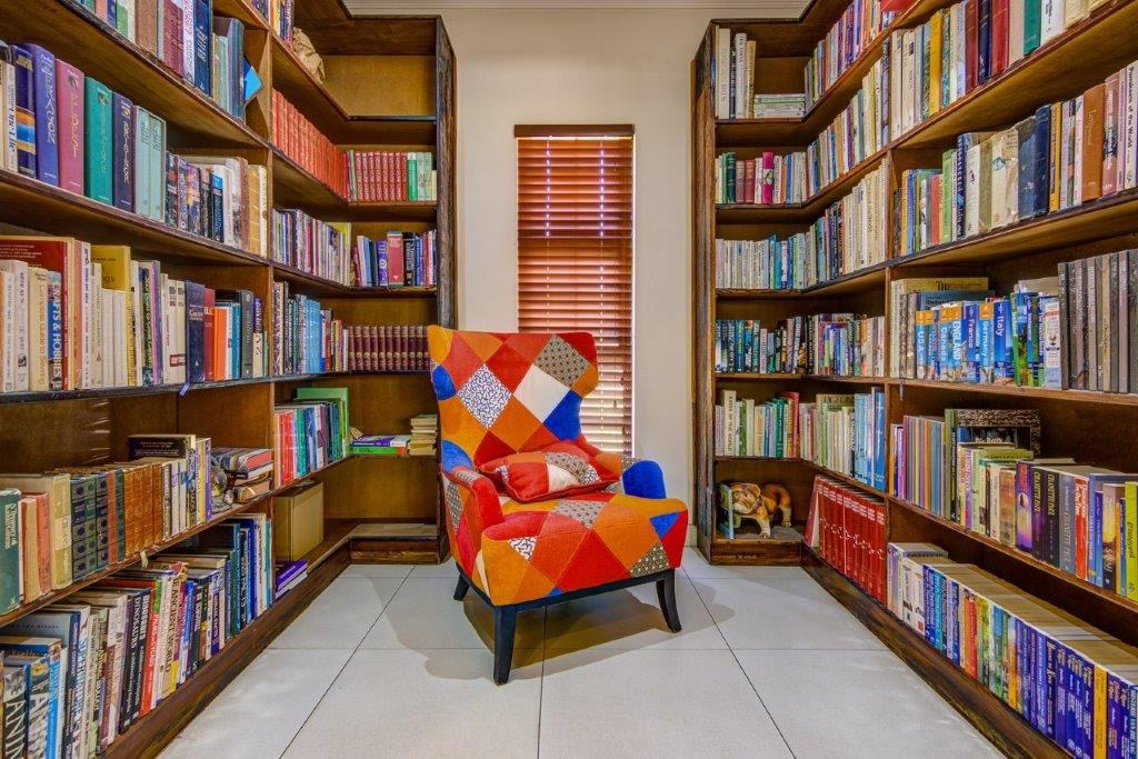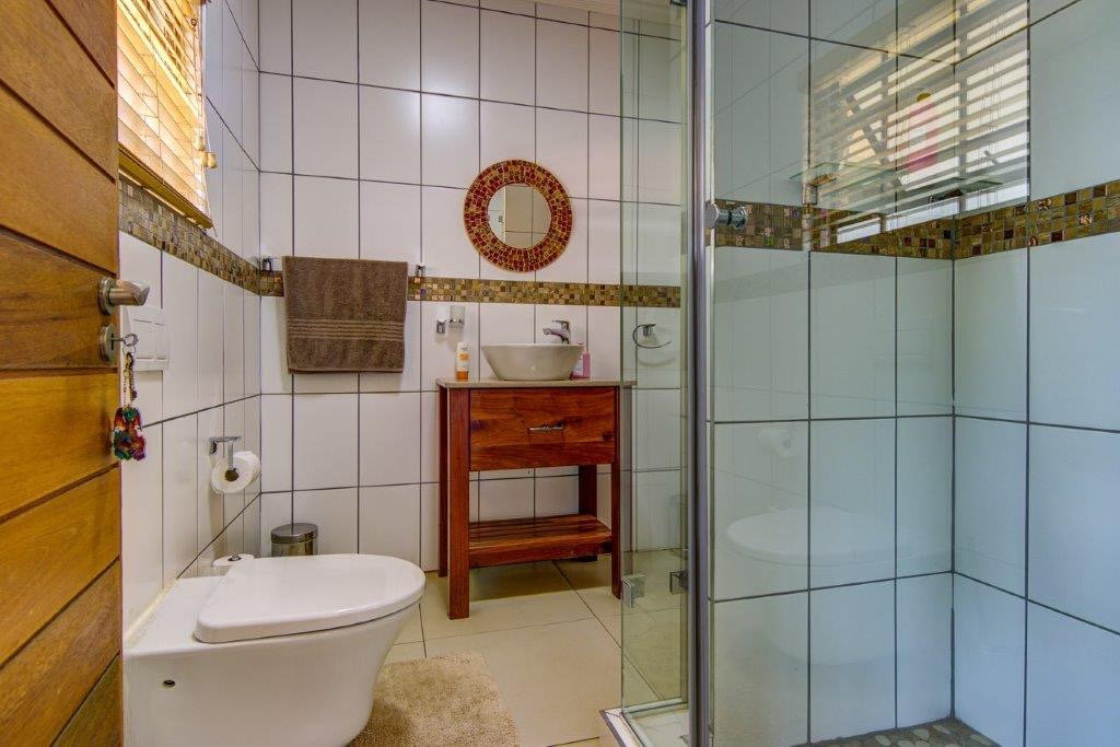 Main house: As you enter the double storey house, you are overwhelmed by the finest and modern finishes. An impressive cladded wall stretching up to the double volume ceiling, greets you! The Architectural design with the high ceiling, natural light and open plan areas is absolutely stunning. A large tiled open plan lounge and dining area with a shared Hergom fireplace perfectly placed. Stacker doors opens up to the covered patio and access to the sauna room, pool and braai patio area. Adjoining is an impressive open plan gourmet chef kitchen with top of the range appliances. A private wine cellar, scullery with indoor garden and water feature is just some of the unexpected extras to be found leading off the kitchen. Further on the ground floor, you will find a well placed library, tiled study room, tiled guest bathroom, walk -in linen cupboard, a large tiled bedroom which opens to the garden, an en-suite with oval bath and shower. Stylish wooden stairs (with roller shutter security gate) leads you to the top floor with a left and right wing! At the left wing you will find a spacious open plan lounge overlooking the impressive lounge and dining room with the impressive view of the fireplace, cladded wall towering to the ceiling. Fitted with a small kitchenette and bar fridge. A double volume bedroom with a door leading to a balcony, fitted with American shutter blinds, large dressing room, en-suite with large oval bathtub, shower and a his-and-hers vanity. Another bedroom, a large study room with own balcony and en-suite bathroom. On the right wing you will find 2 large bedrooms with access to the balcony and en-suite. The house is almost entirely off the grid with it's 60 solar panels, invertor and Lithium battery system. Extras such as borehole, Jojo water tank, store room, servants room with bathroom and pool.