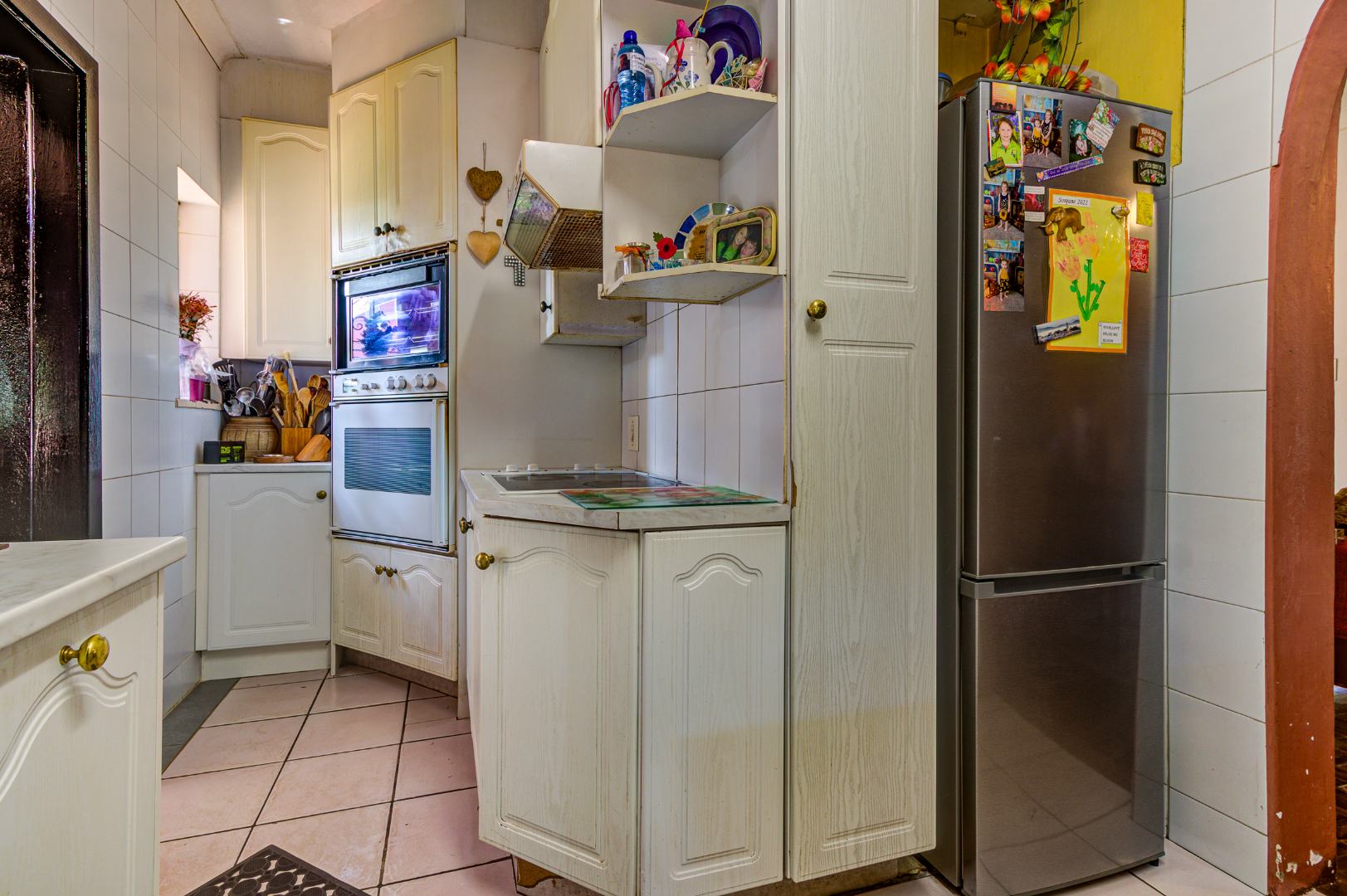 The functional kitchen is well-equipped with ample cream-coloured cupboards, generous counter space, a double sink, built-in oven, microwave, and plenty of natural light. A separate laundry area adds to the home’s practicality.