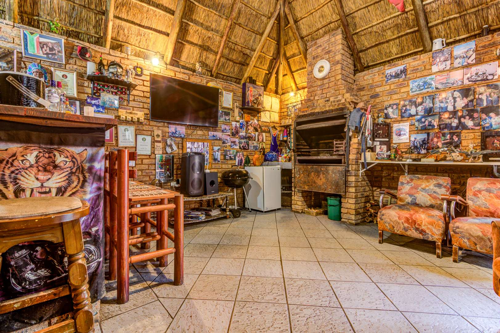 Inside, the property boasts two spacious lounges, each with its own character. One lounge features an exposed brick accent wall, checkerboard tiled flooring, and abundant natural light, while the second lounge offers parquet flooring and a striking stone fireplace — perfect for cosy evenings. An arched doorway leads seamlessly into a dedicated dining area.