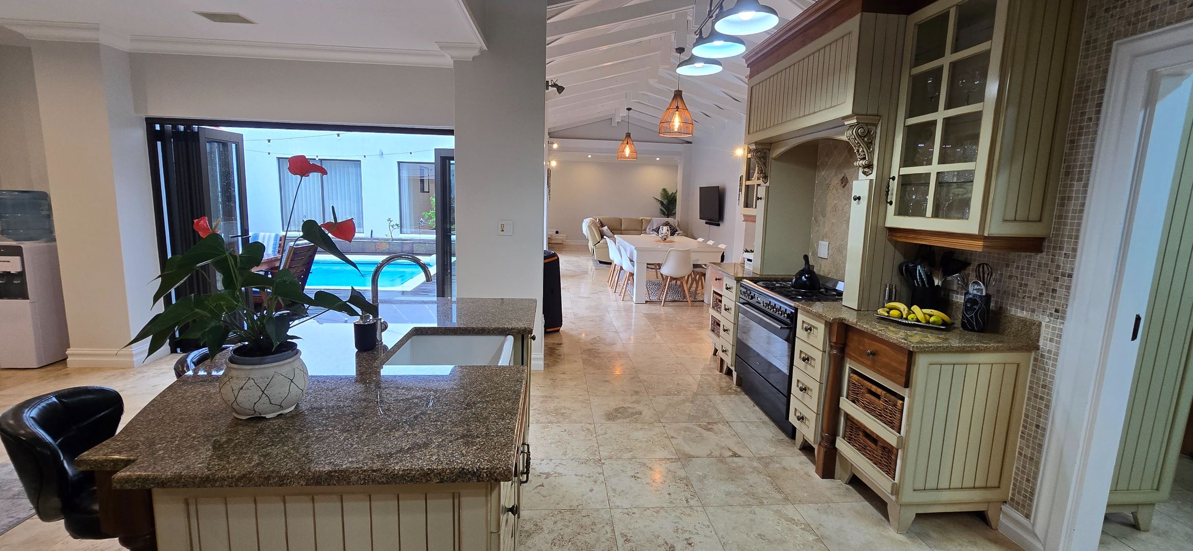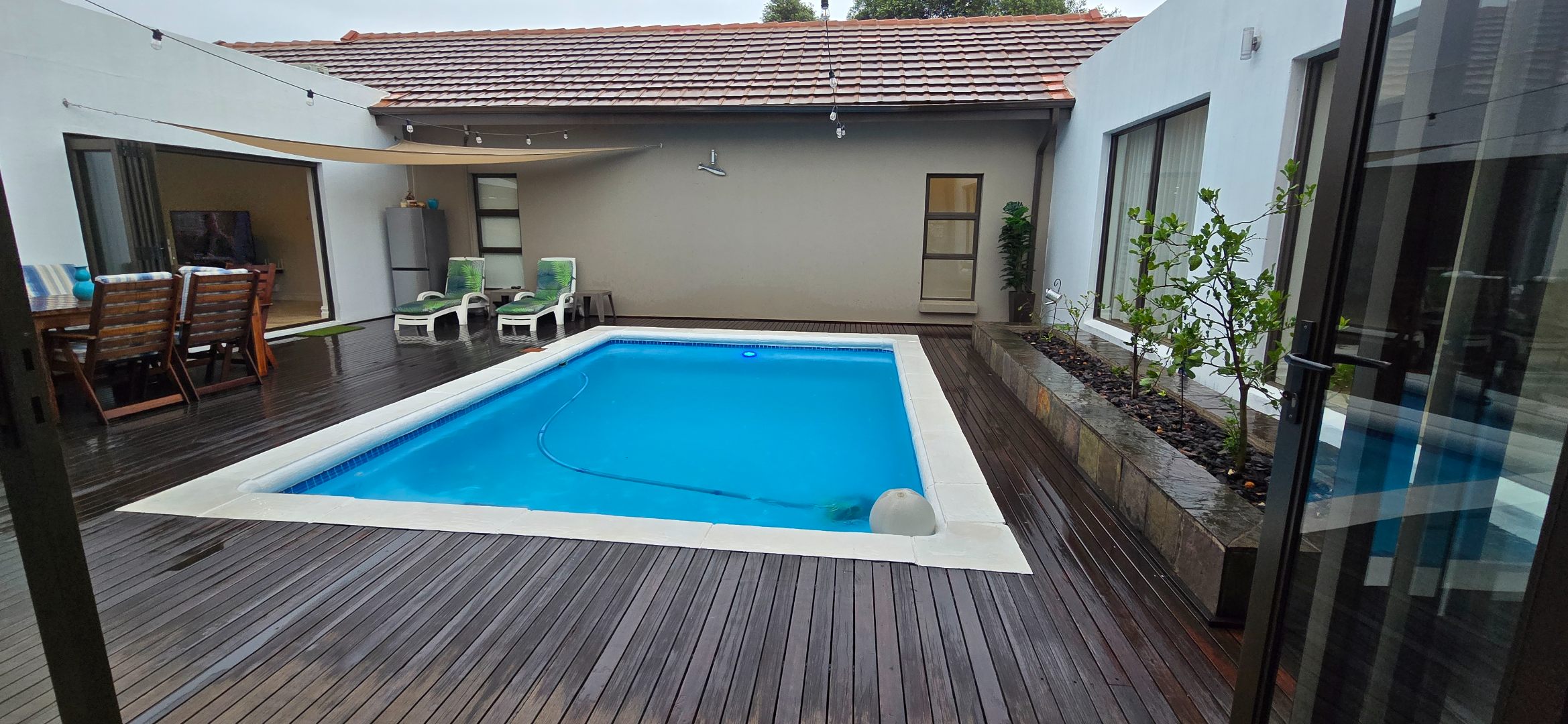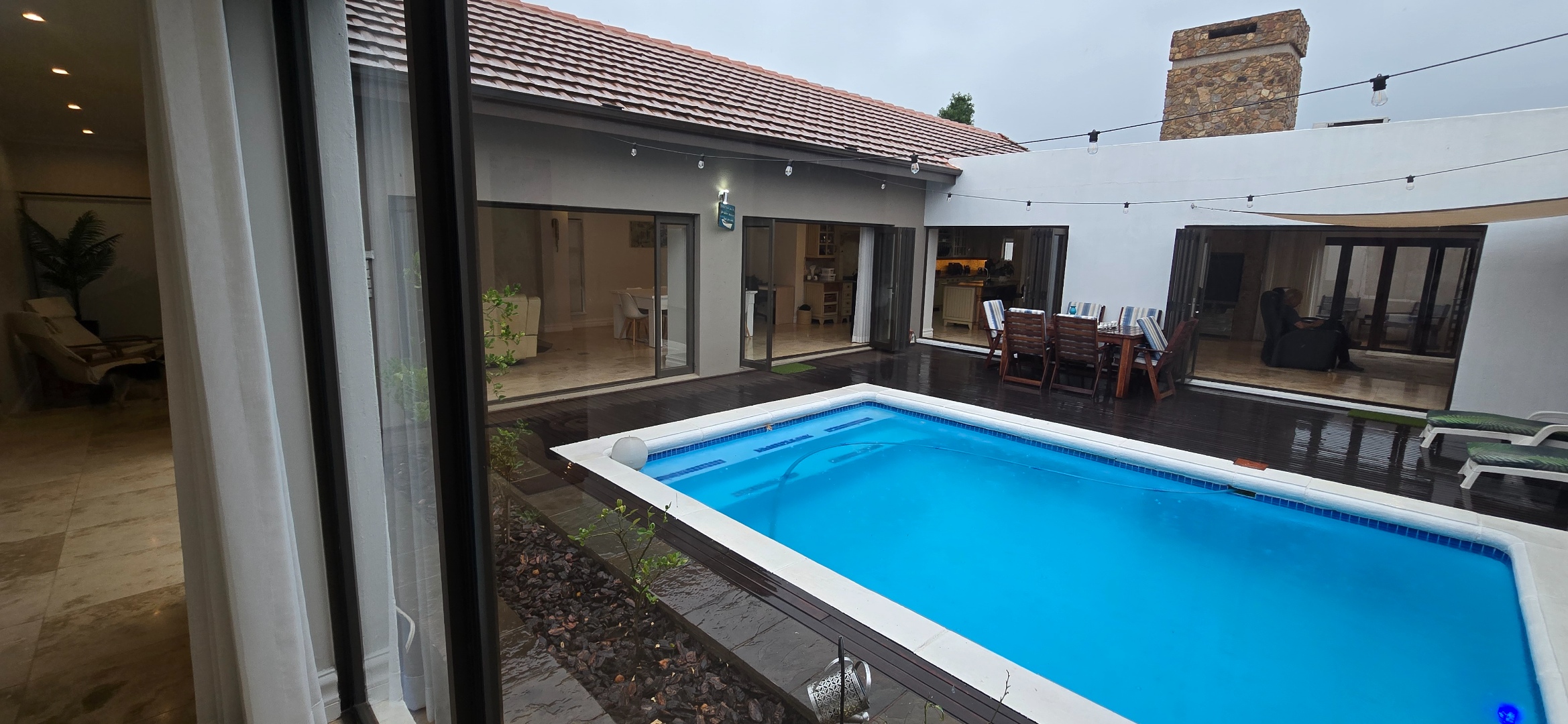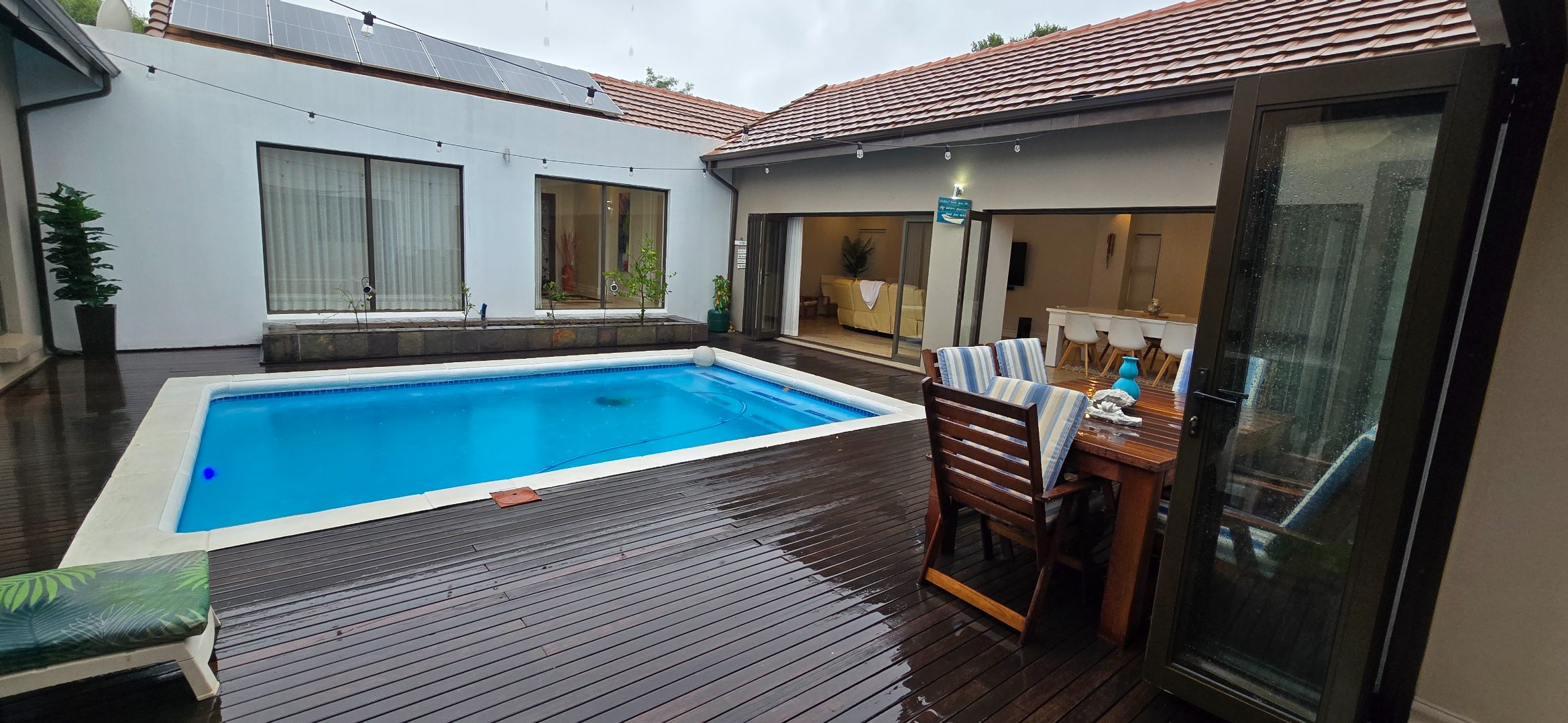 Experience exceptional indoor-outdoor living with large glass sliding doors opening directly to a private swimming pool and a spacious wooden deck, perfect for entertaining with dedicated dining and lounging areas. The property includes a well-maintained garden with an irrigation system, two garages, and two additional parking spaces. Security is paramount with 24-hour estate security. Modern conveniences include fibre internet connectivity, a battery inverter, and solar panels, ensuring energy efficiency. Additional staff quarters and access to a clubhouse complete this desirable offering.
