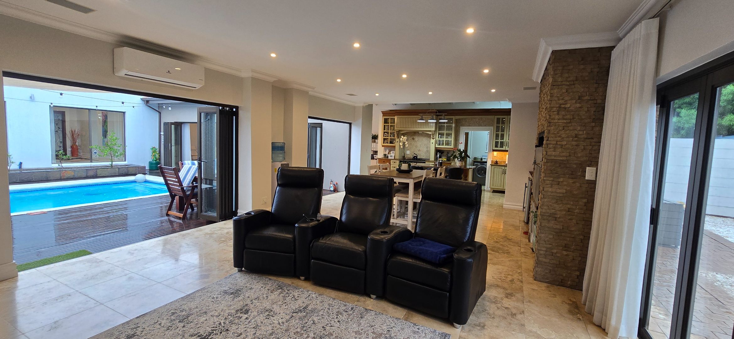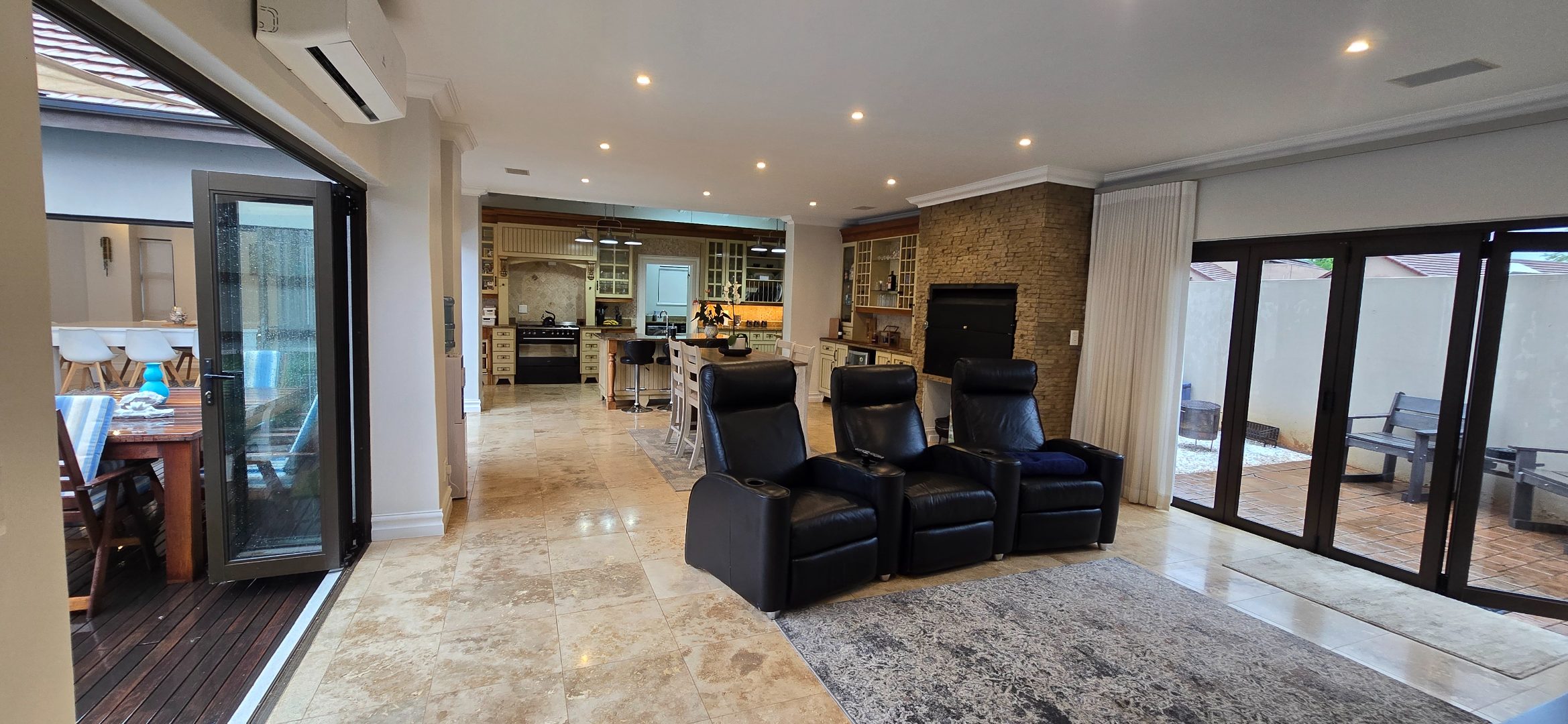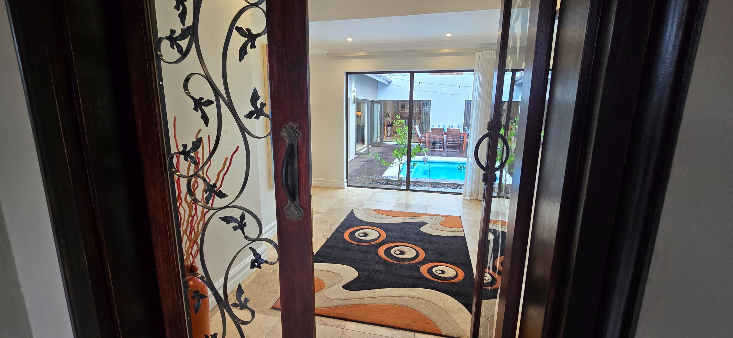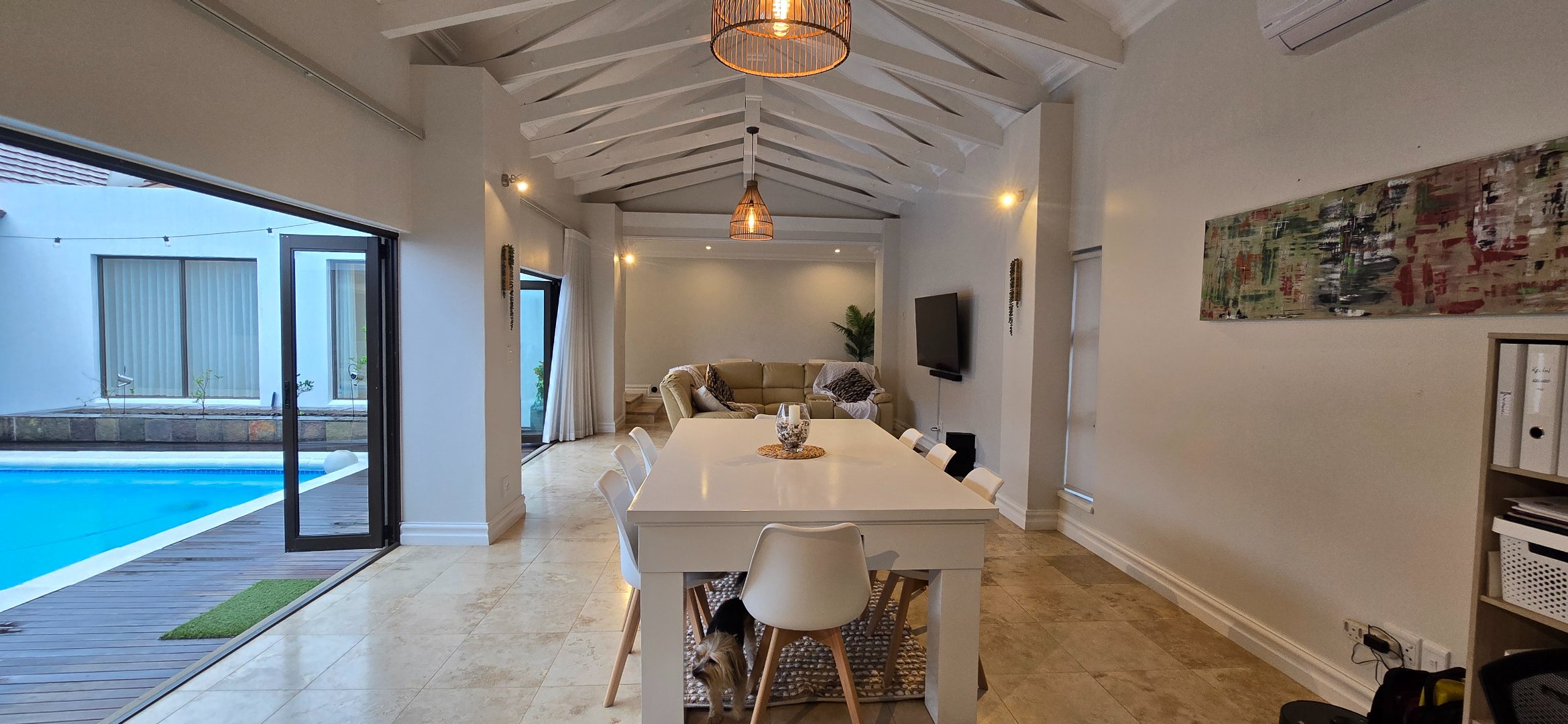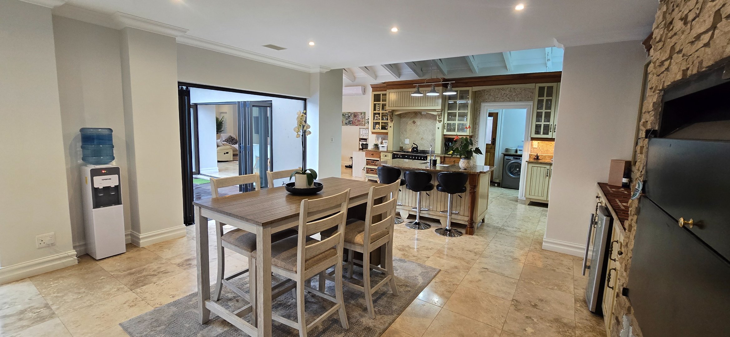 Experience exceptional indoor-outdoor living with large glass sliding doors opening directly to a private swimming pool and a spacious wooden deck, perfect for entertaining with dedicated dining and lounging areas. The property includes a well-maintained garden with an irrigation system, two garages, and two additional parking spaces. Security is paramount with 24-hour estate security. Modern conveniences include fibre internet connectivity, a battery inverter, and solar panels, ensuring energy efficiency. Additional staff quarters and access to a clubhouse complete this desirable offering.