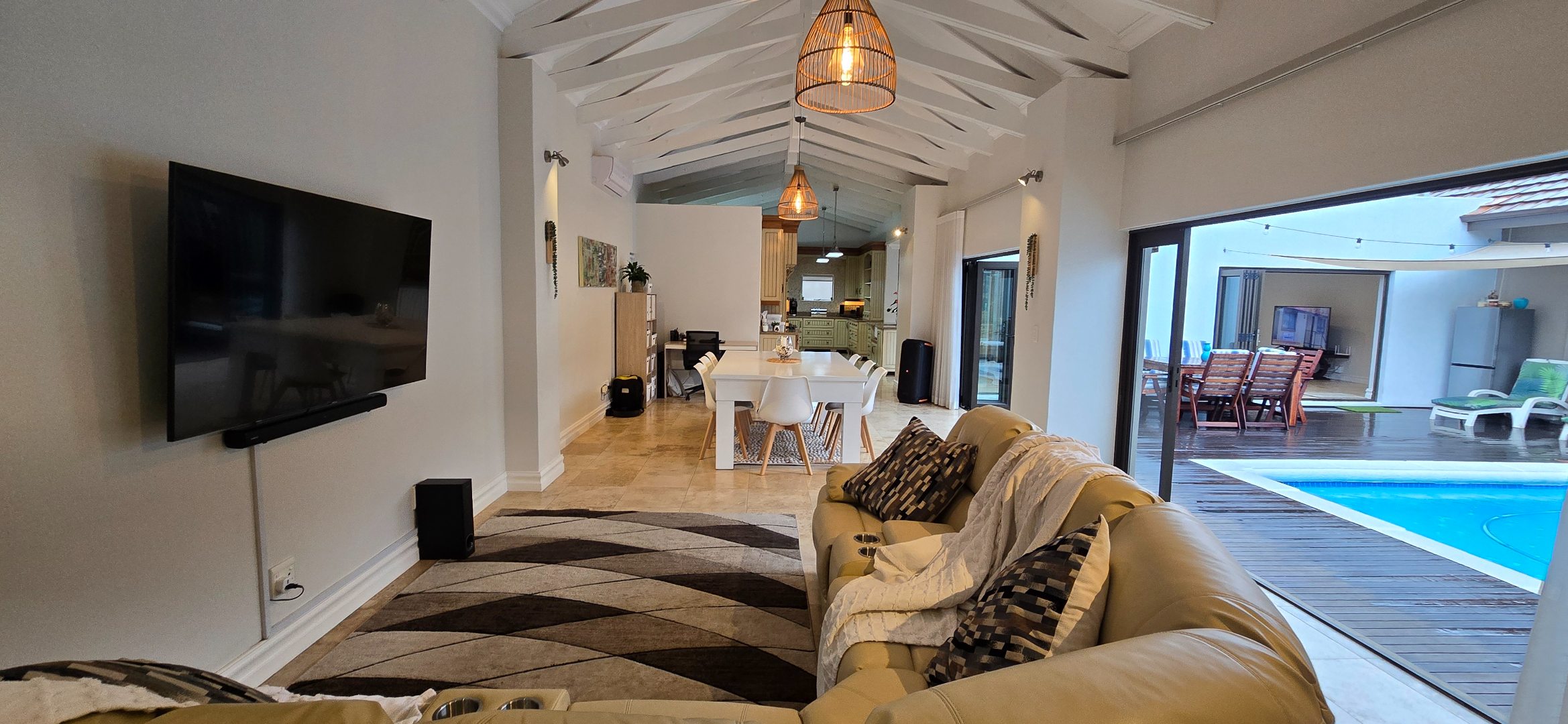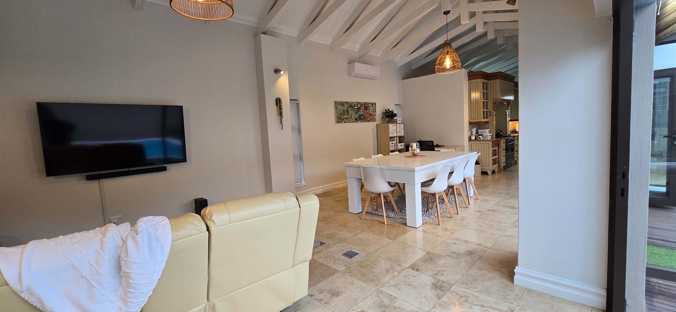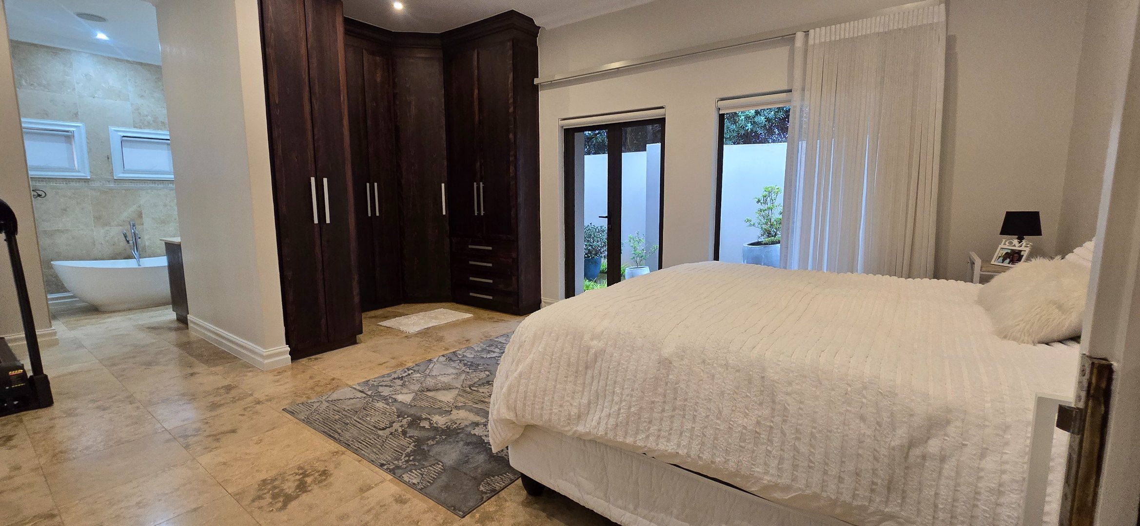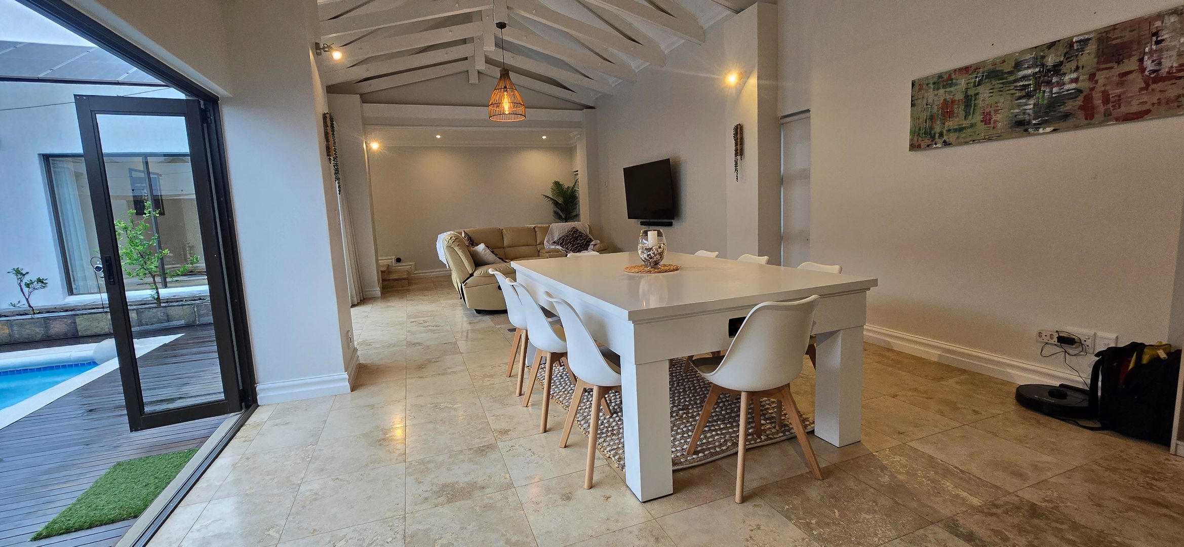 Experience exceptional indoor-outdoor living with large glass sliding doors opening directly to a private swimming pool and a spacious wooden deck, perfect for entertaining with dedicated dining and lounging areas. The property includes a well-maintained garden with an irrigation system, two garages, and two additional parking spaces. Security is paramount with 24-hour estate security. Modern conveniences include fibre internet connectivity, a battery inverter, and solar panels, ensuring energy efficiency. Additional staff quarters and access to a clubhouse complete this desirable offering.