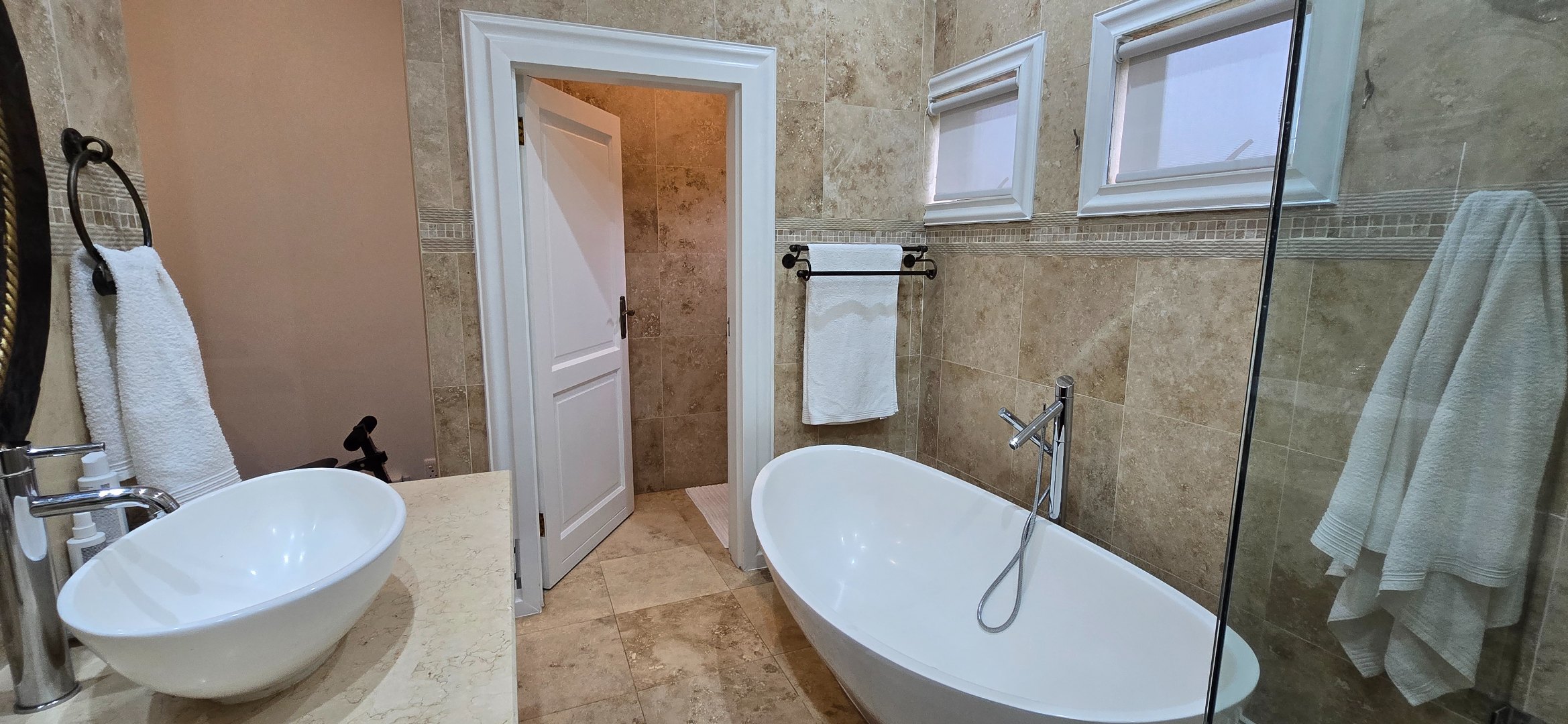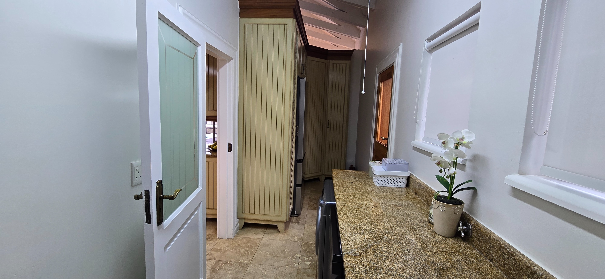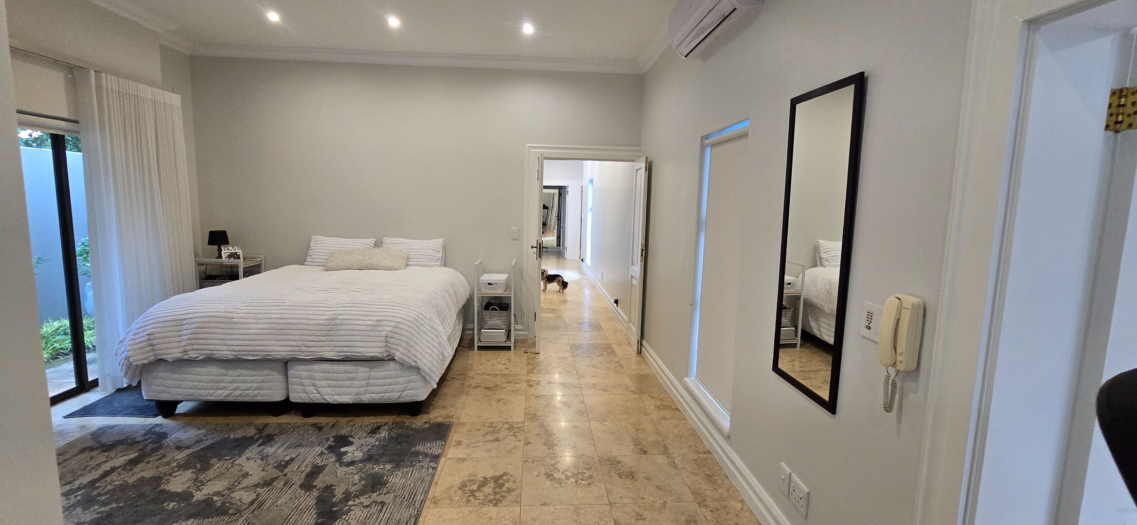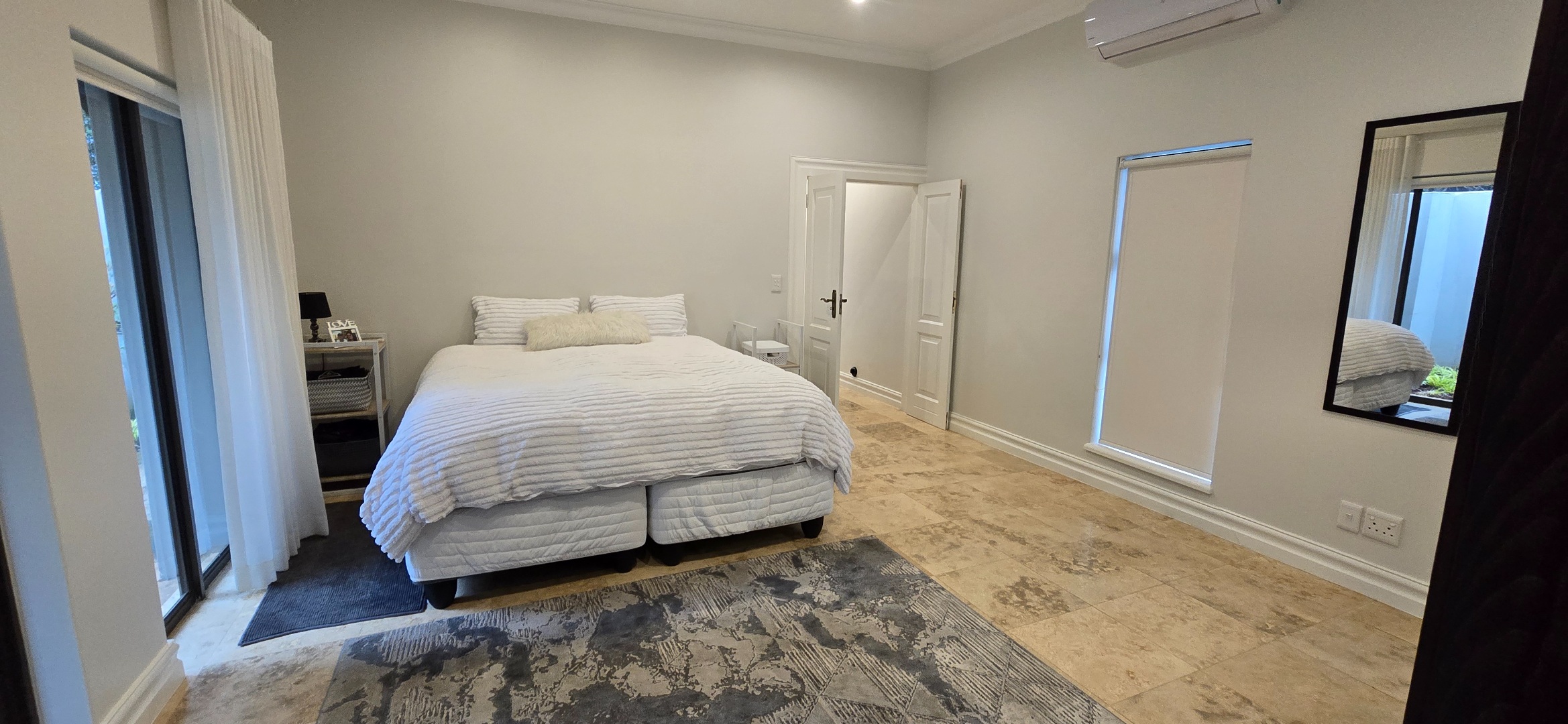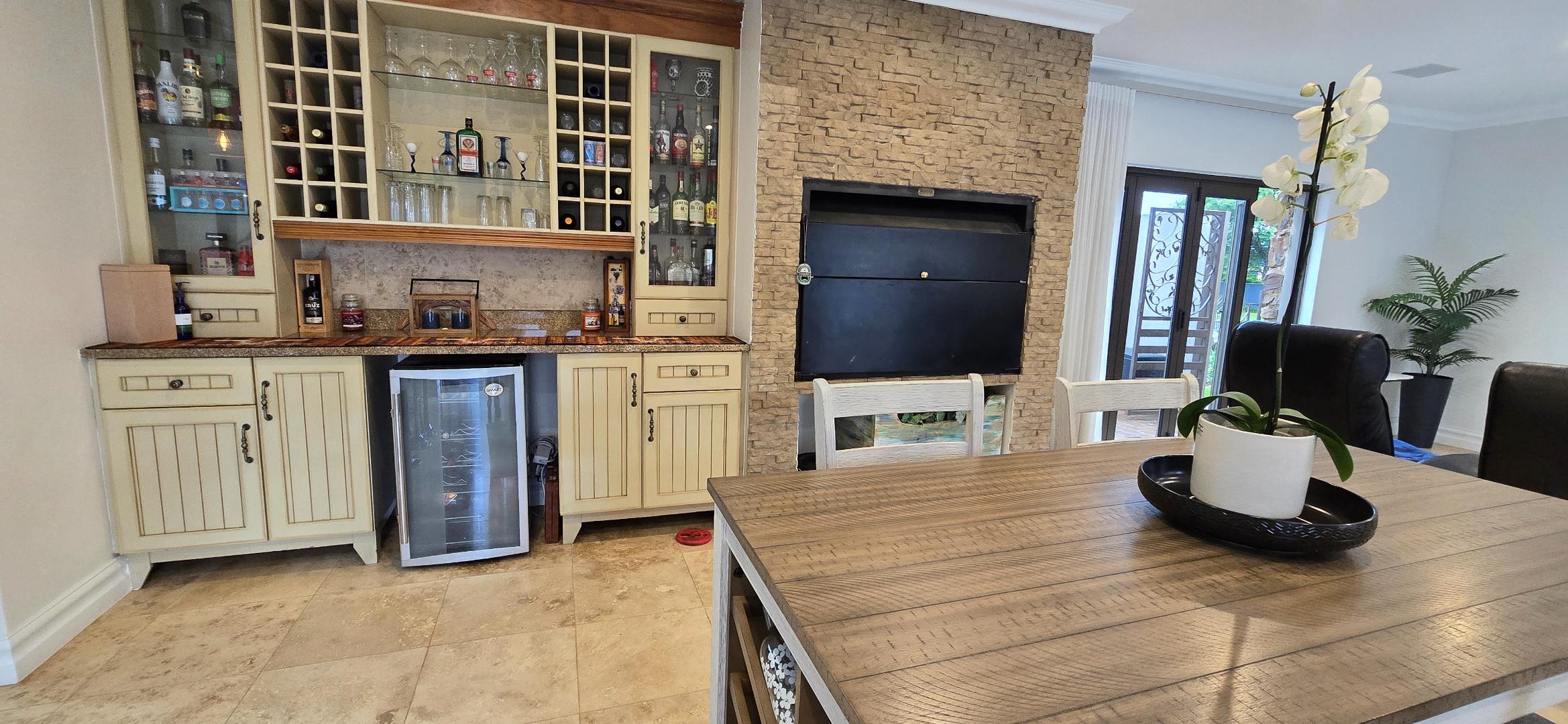 Experience exceptional indoor-outdoor living with large glass sliding doors opening directly to a private swimming pool and a spacious wooden deck, perfect for entertaining with dedicated dining and lounging areas. The property includes a well-maintained garden with an irrigation system, two garages, and two additional parking spaces. Security is paramount with 24-hour estate security. Modern conveniences include fibre internet connectivity, a battery inverter, and solar panels, ensuring energy efficiency. Additional staff quarters and access to a clubhouse complete this desirable offering.
