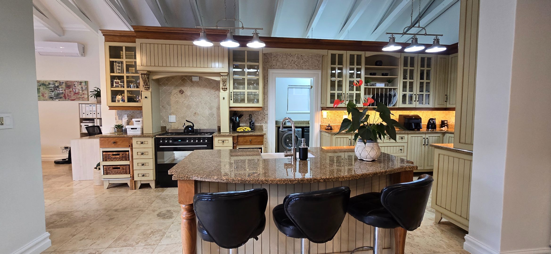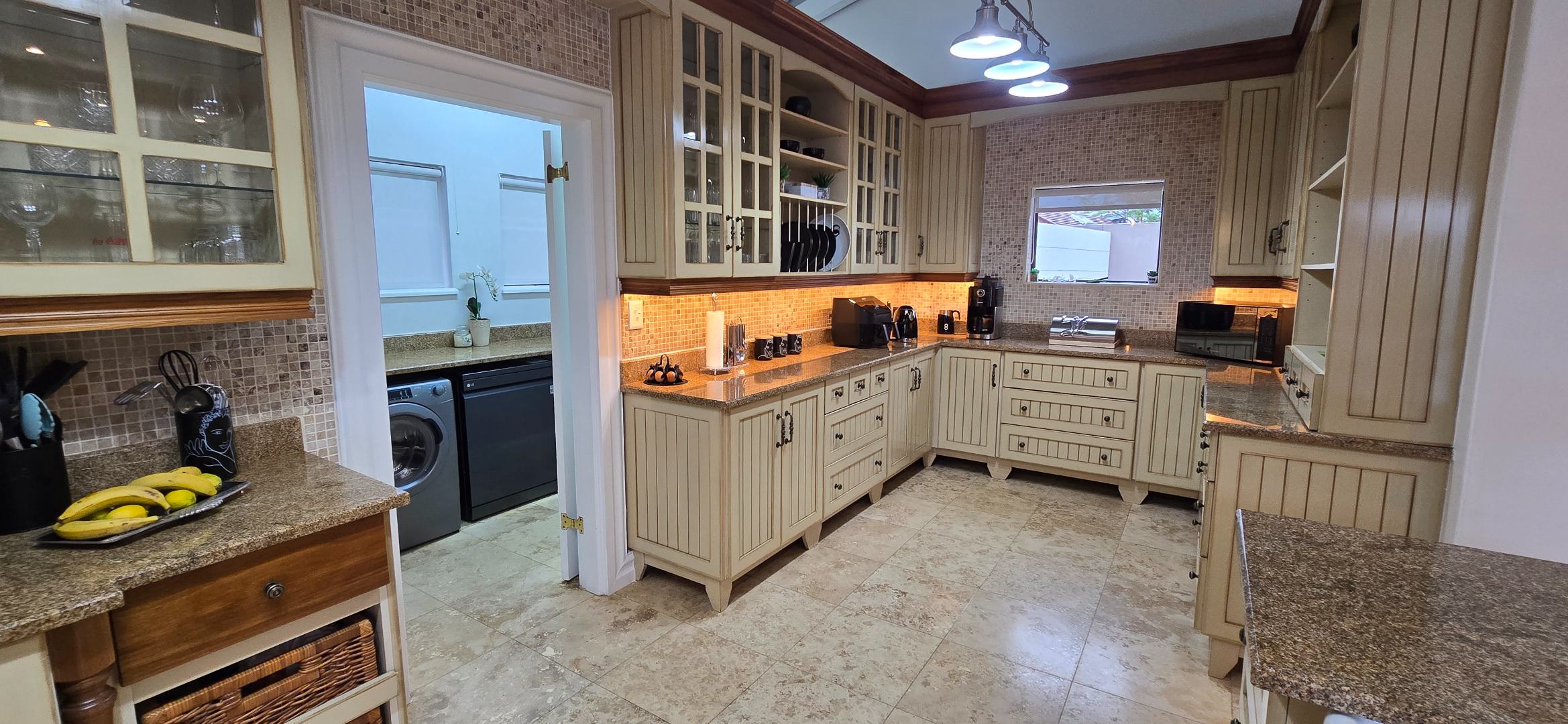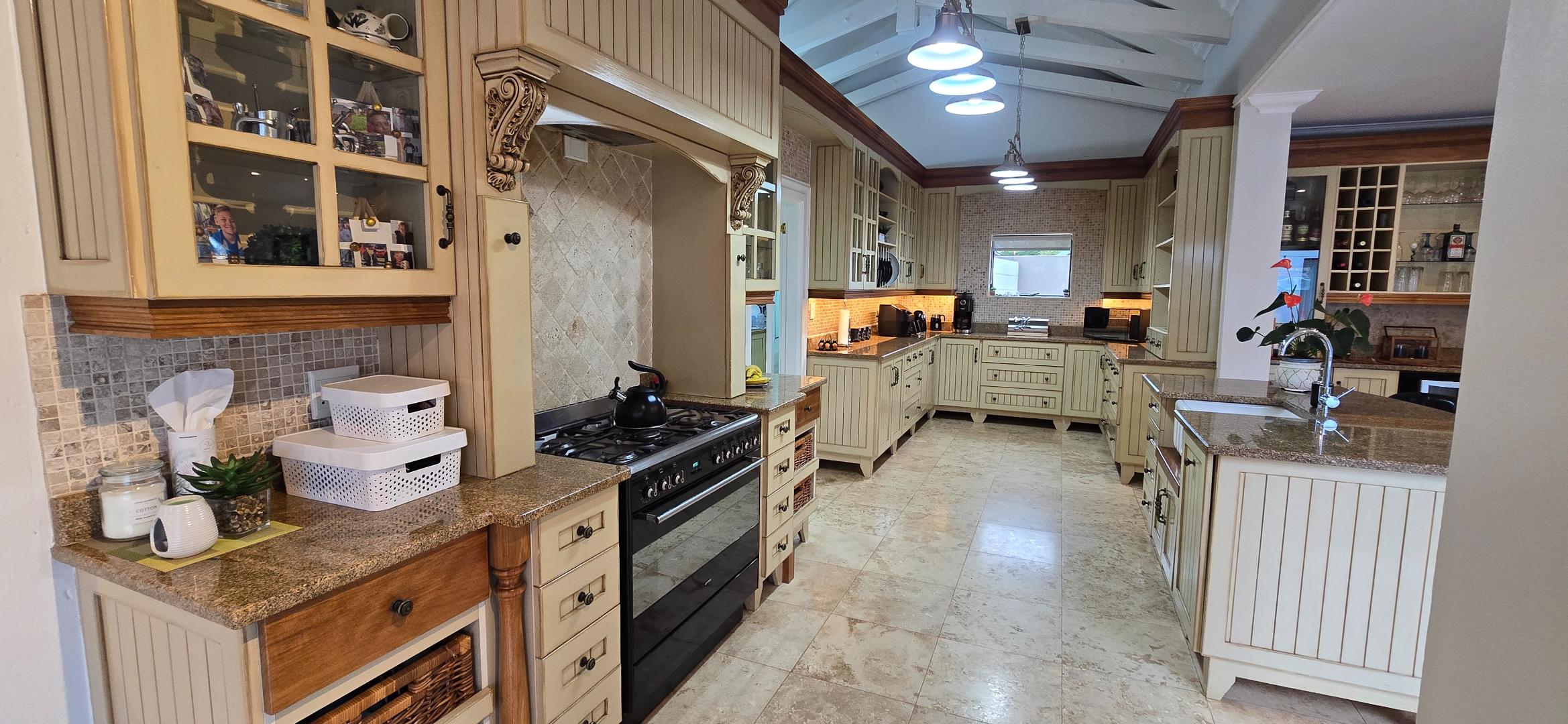 Step inside to discover a bright and spacious open-plan layout, seamlessly connecting the living, dining, and kitchen areas. High vaulted ceilings with exposed beams enhance the sense of space, complemented by durable tiled flooring and integrated air conditioning. The well-appointed kitchen features traditional cream cabinetry, granite countertops, a mosaic tile backsplash, a gas range, and a convenient pantry. Two comfortable lounges, including a family TV room, and a dedicated dining area ensure ample space for relaxation. The home offers three generously sized bedrooms, including two luxurious en-suites, plus a guest toilet.