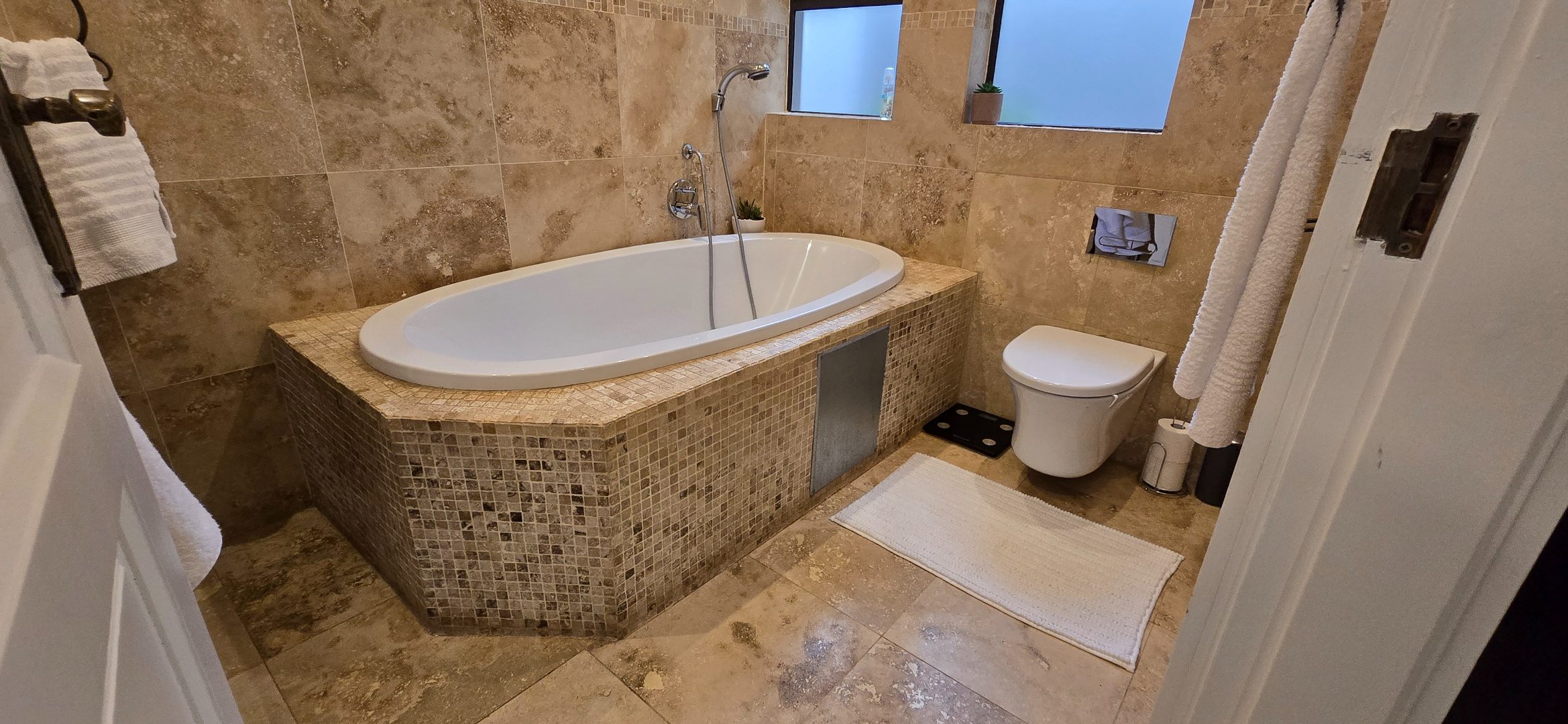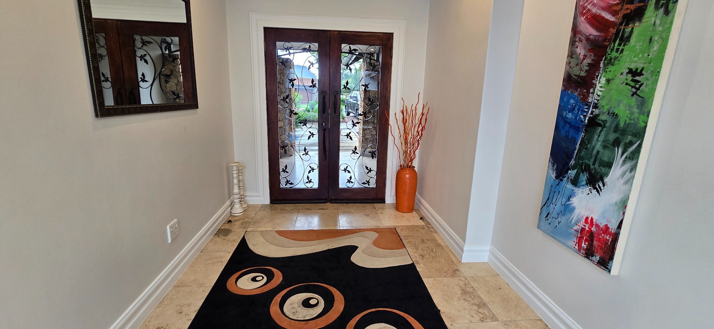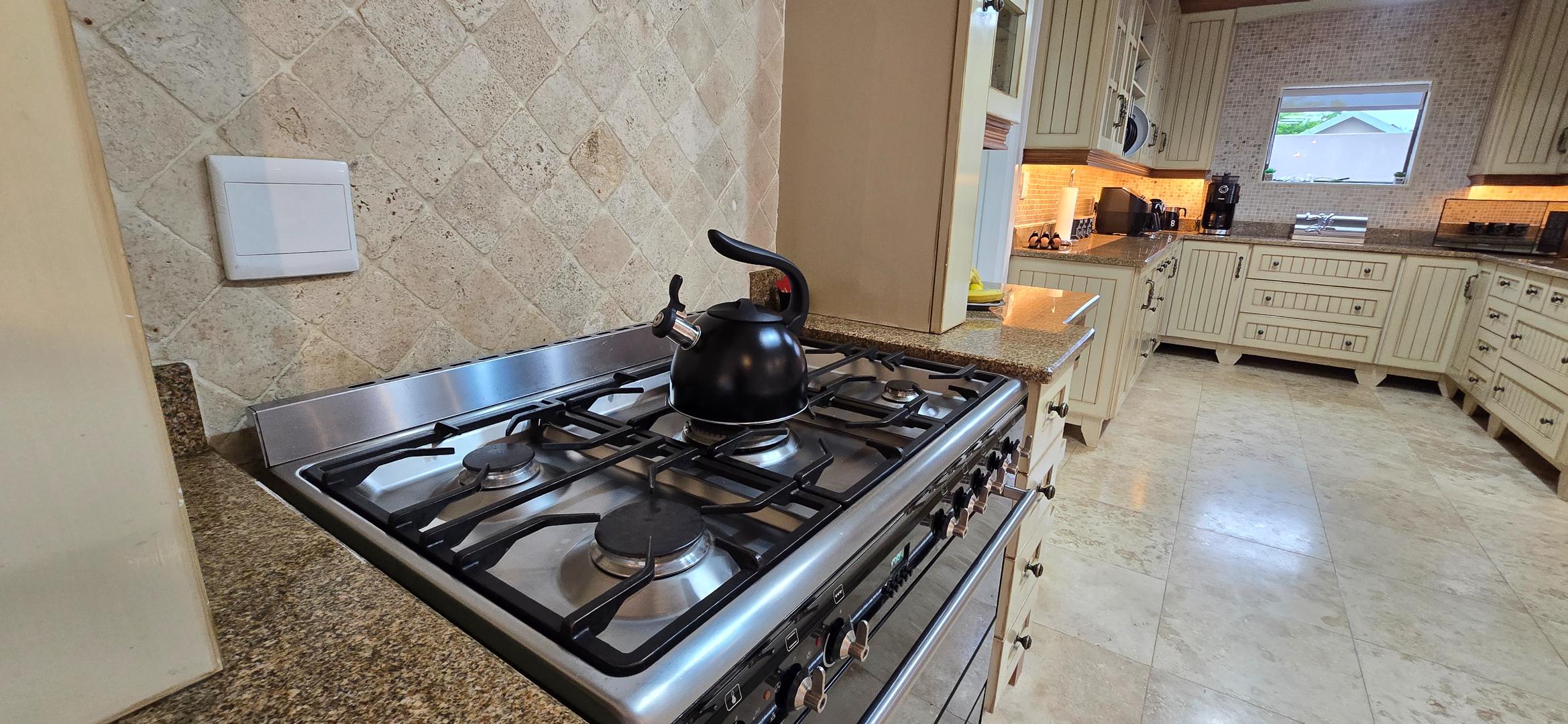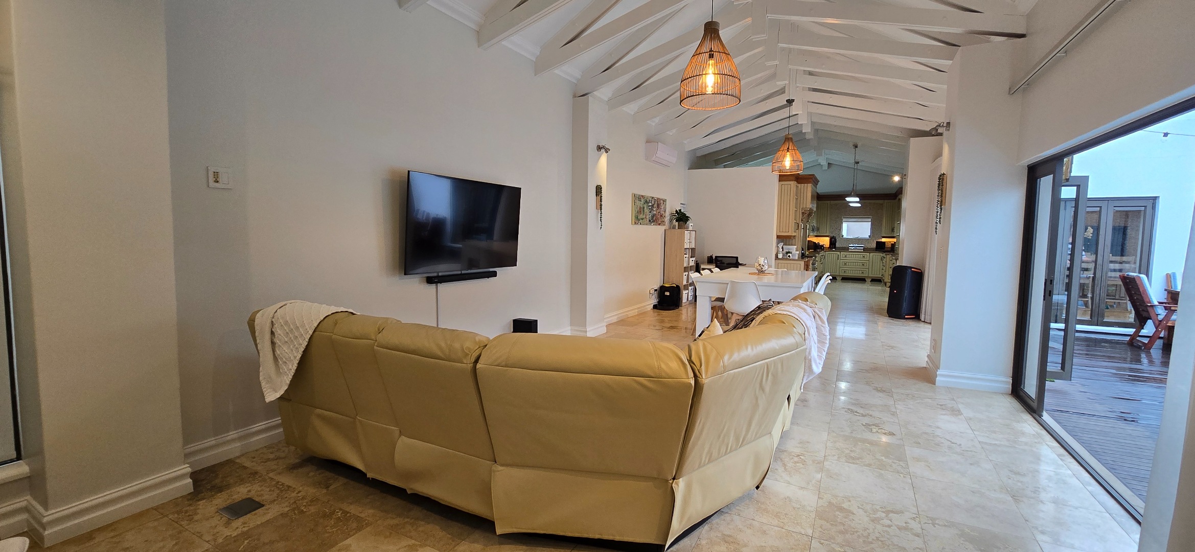 Step inside to discover a bright and spacious open-plan layout, seamlessly connecting the living, dining, and kitchen areas. High vaulted ceilings with exposed beams enhance the sense of space, complemented by durable tiled flooring and integrated air conditioning. The well-appointed kitchen features traditional cream cabinetry, granite countertops, a mosaic tile backsplash, a gas range, and a convenient pantry. Two comfortable lounges, including a family TV room, and a dedicated dining area ensure ample space for relaxation. The home offers three generously sized bedrooms, including two luxurious en-suites, plus a guest toilet.