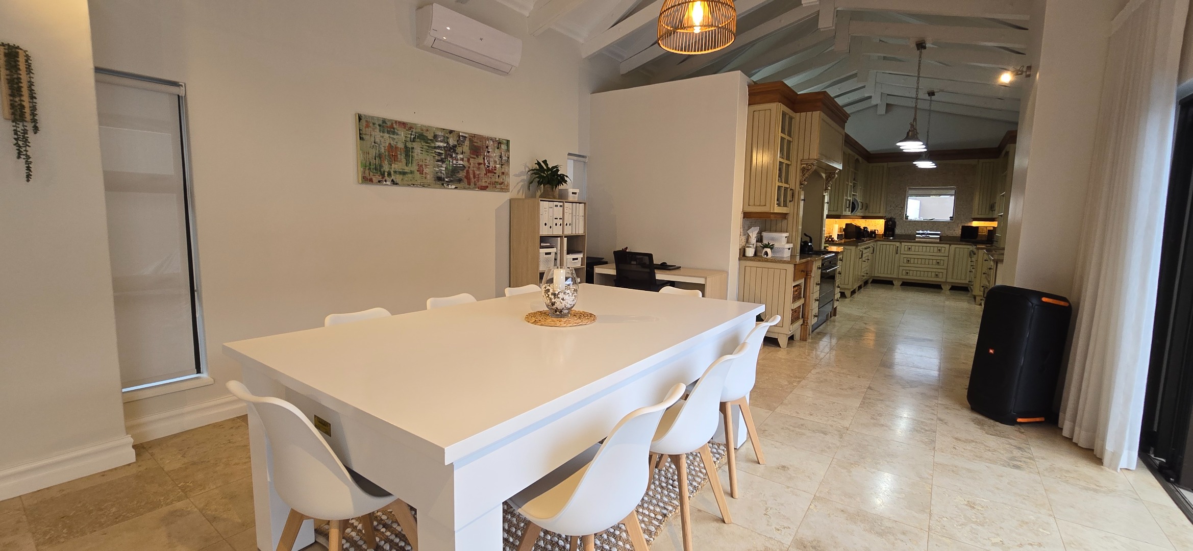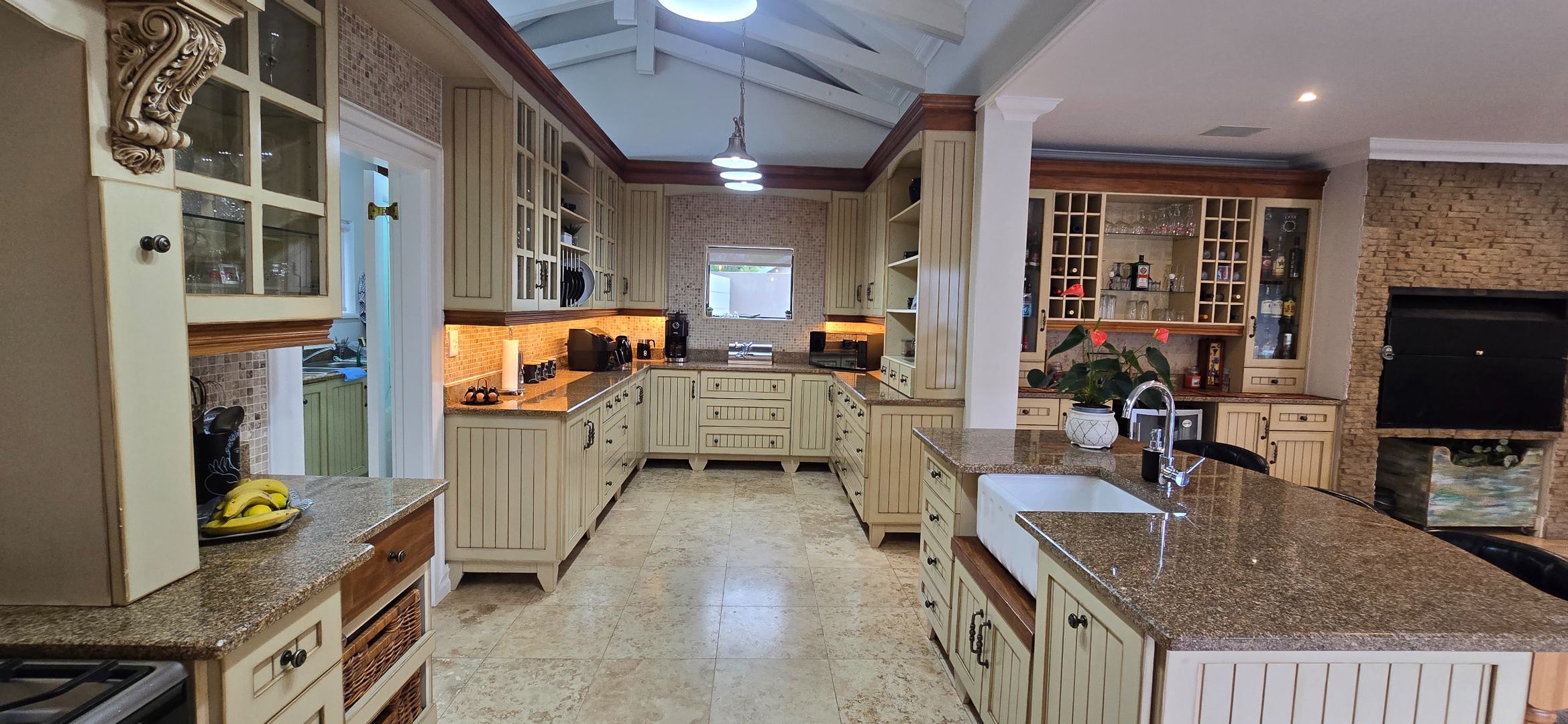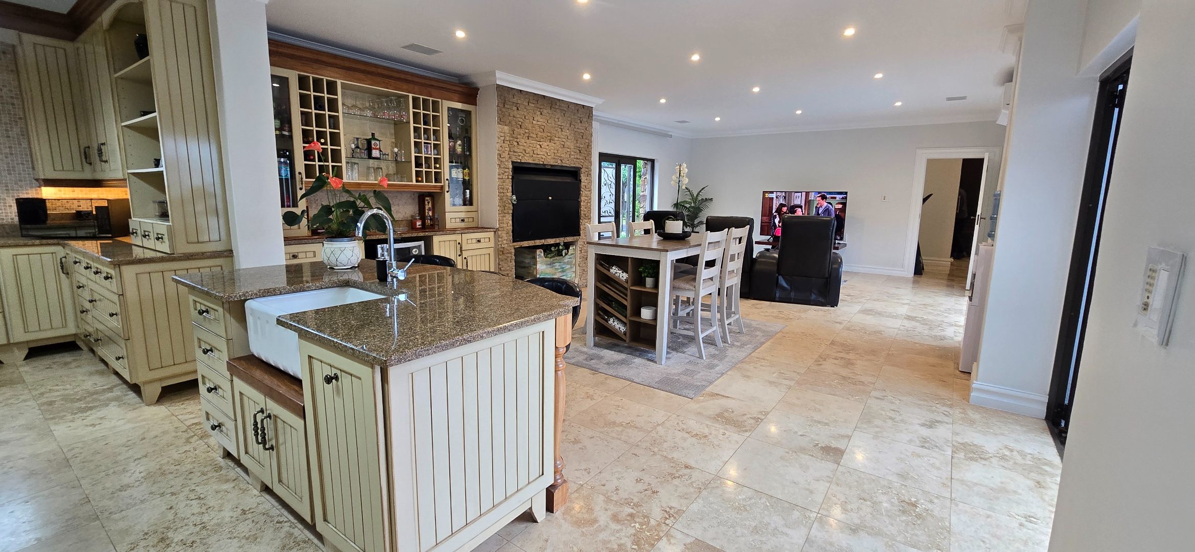 Step inside to discover a bright and spacious open-plan layout, seamlessly connecting the living, dining, and kitchen areas. High vaulted ceilings with exposed beams enhance the sense of space, complemented by durable tiled flooring and integrated air conditioning. The well-appointed kitchen features traditional cream cabinetry, granite countertops, a mosaic tile backsplash, a gas range, and a convenient pantry. Two comfortable lounges, including a family TV room, and a dedicated dining area ensure ample space for relaxation. The home offers three generously sized bedrooms, including two luxurious en-suites, plus a guest toilet.