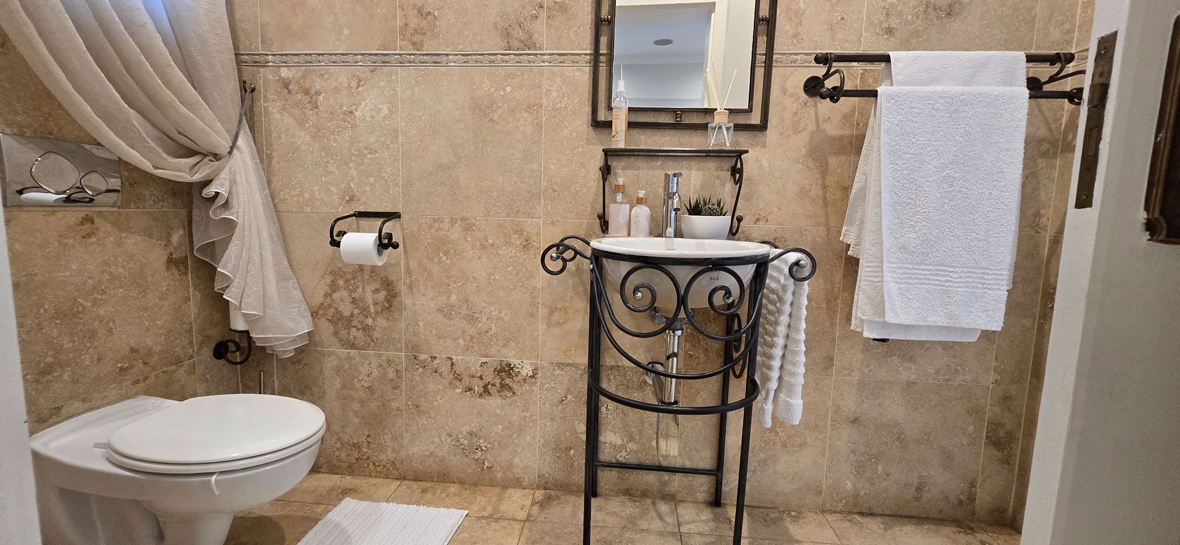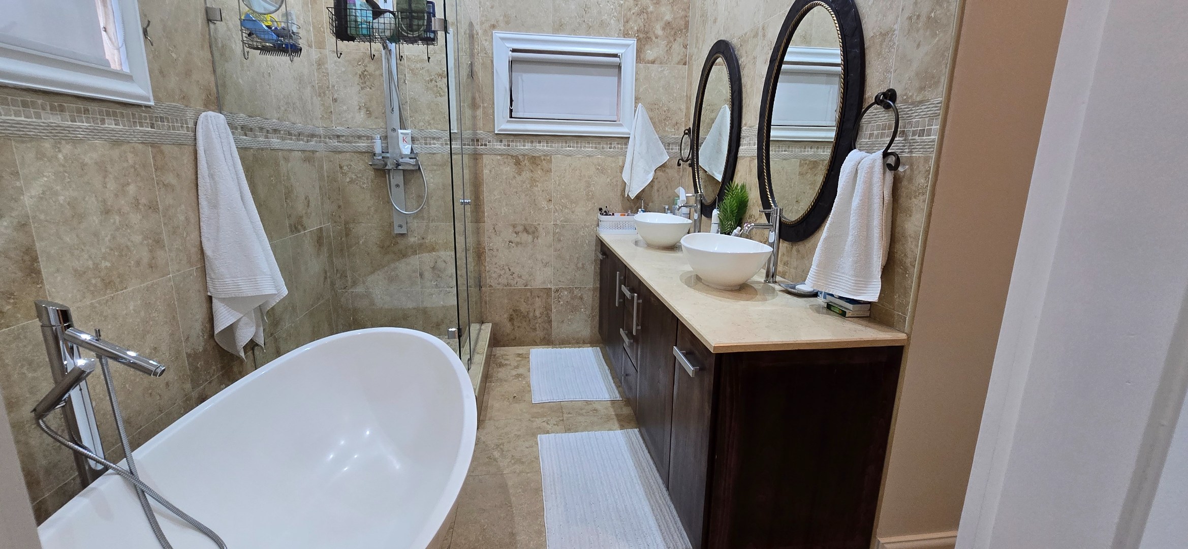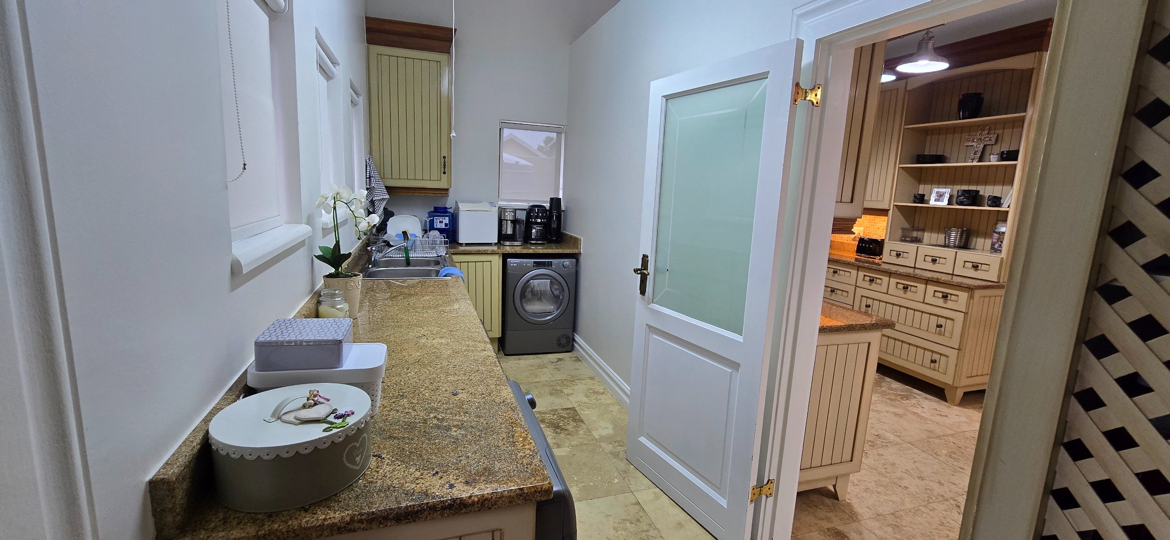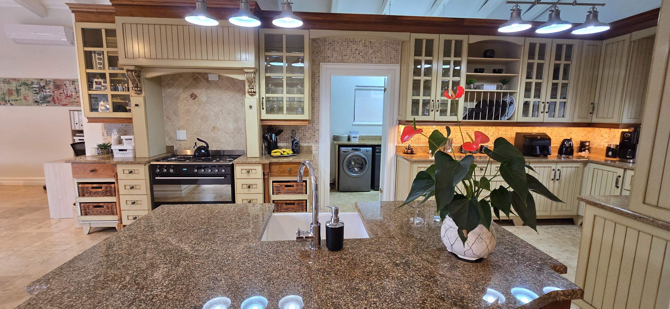 Step inside to discover a bright and spacious open-plan layout, seamlessly connecting the living, dining, and kitchen areas. High vaulted ceilings with exposed beams enhance the sense of space, complemented by durable tiled flooring and integrated air conditioning. The well-appointed kitchen features traditional cream cabinetry, granite countertops, a mosaic tile backsplash, a gas range, and a convenient pantry. Two comfortable lounges, including a family TV room, and a dedicated dining area ensure ample space for relaxation. The home offers three generously sized bedrooms, including two luxurious en-suites, plus a guest toilet.