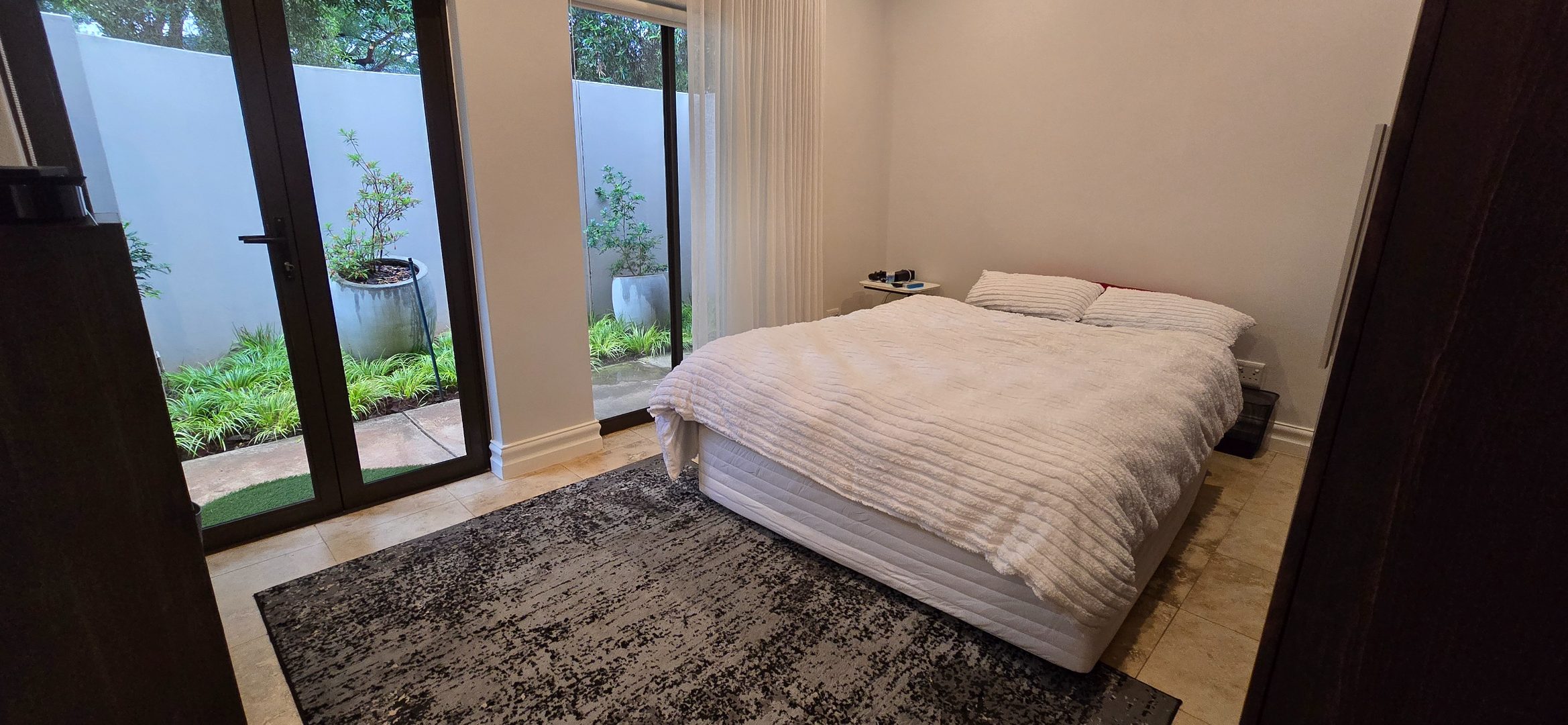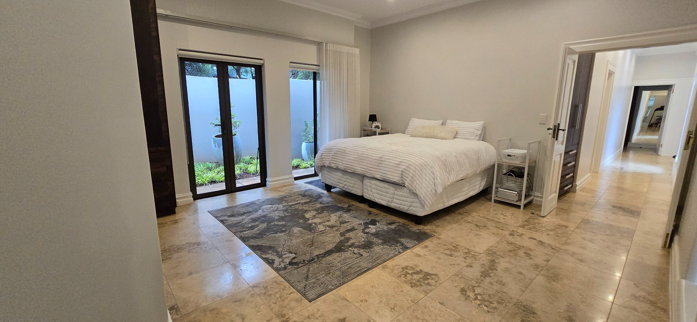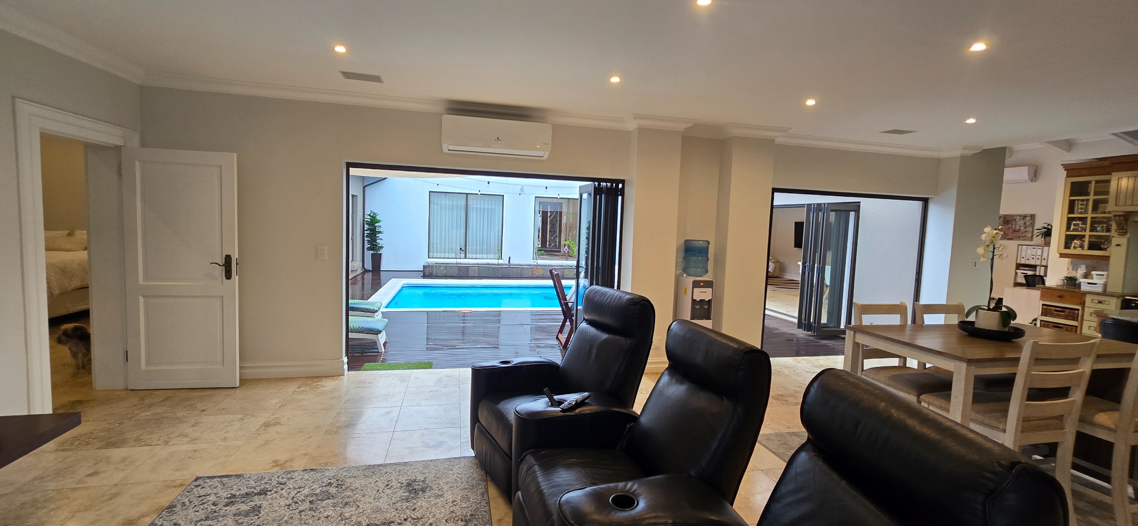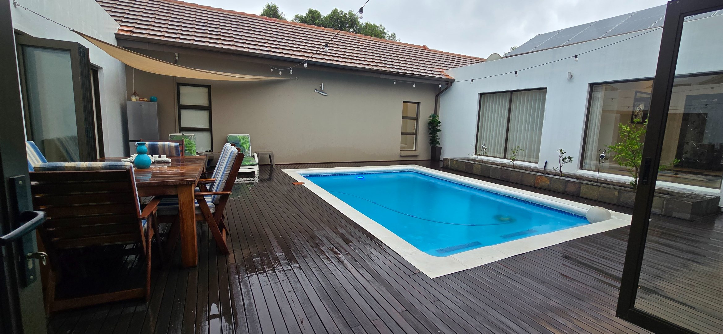 Experience exceptional indoor-outdoor living with large glass sliding doors opening directly to a private swimming pool and a spacious wooden deck, perfect for entertaining with dedicated dining and lounging areas. The property includes a well-maintained garden with an irrigation system, two garages, and two additional parking spaces. Security is paramount with 24-hour estate security. Modern conveniences include fibre internet connectivity, a battery inverter, and solar panels, ensuring energy efficiency. Additional staff quarters and access to a clubhouse complete this desirable offering.