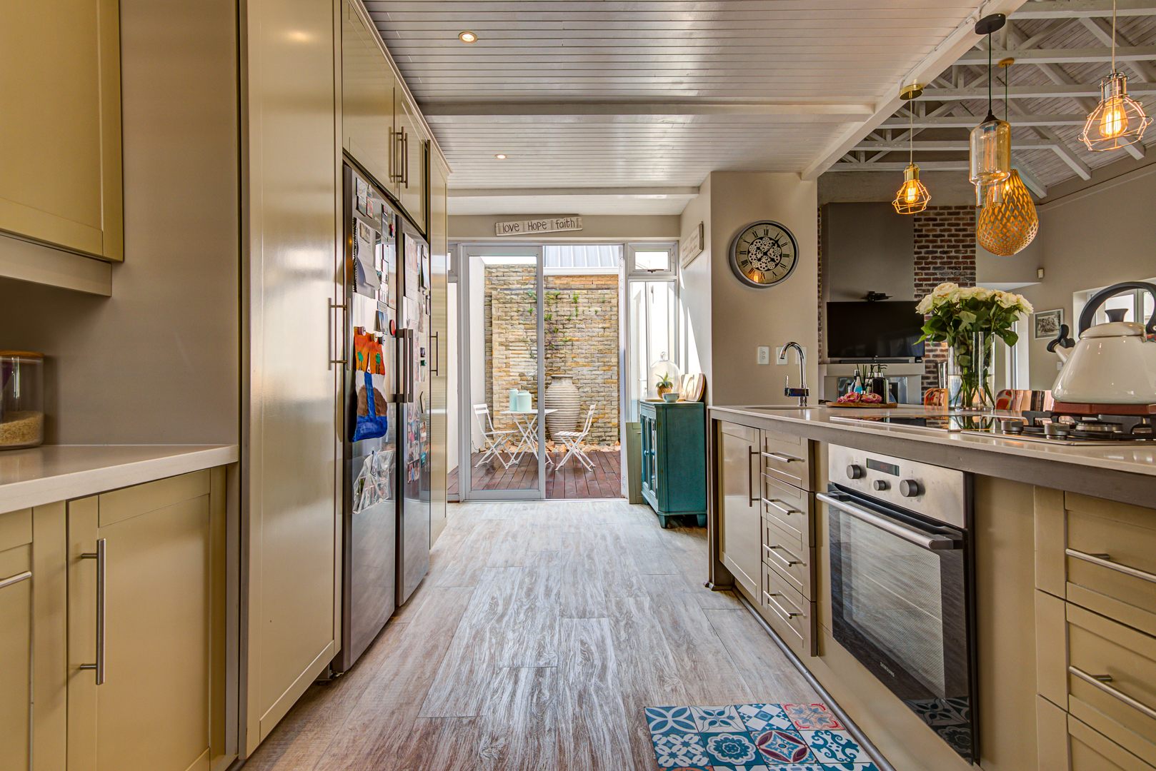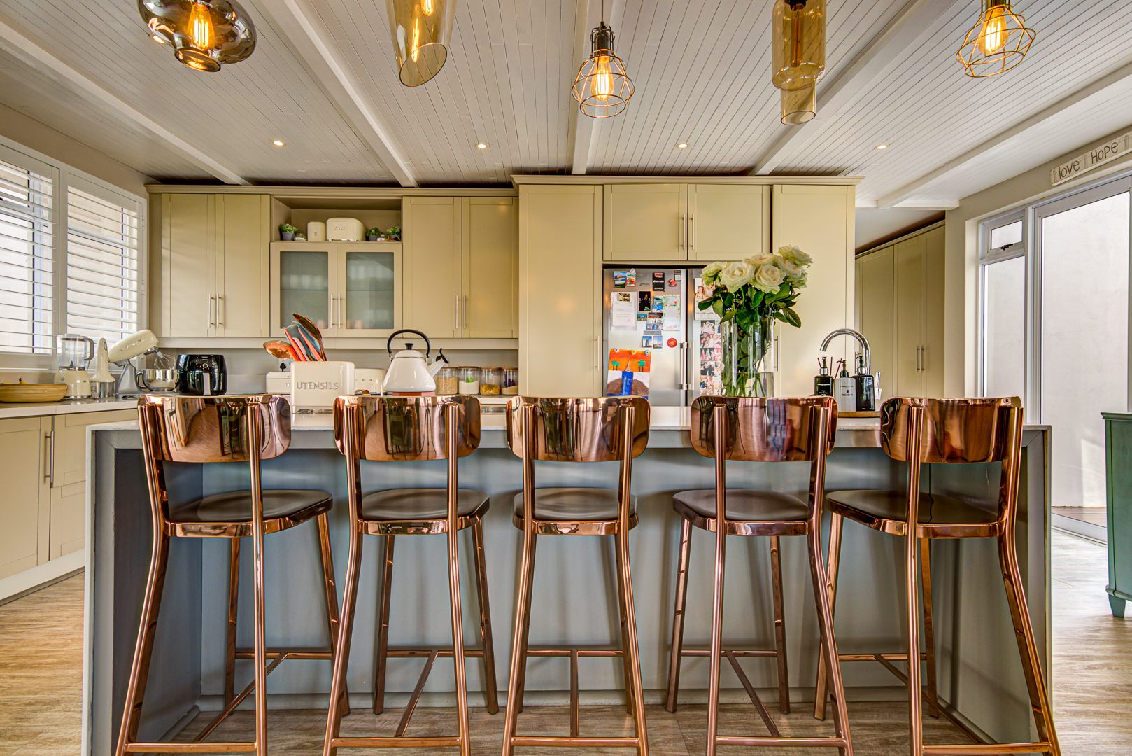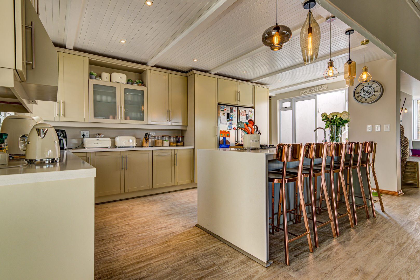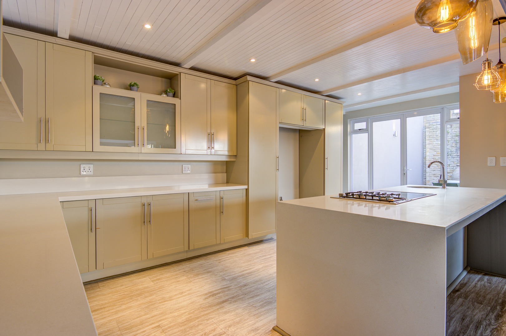 - Open plan Caesarstone kitchen with breakfast nook, gas hob and electric oven