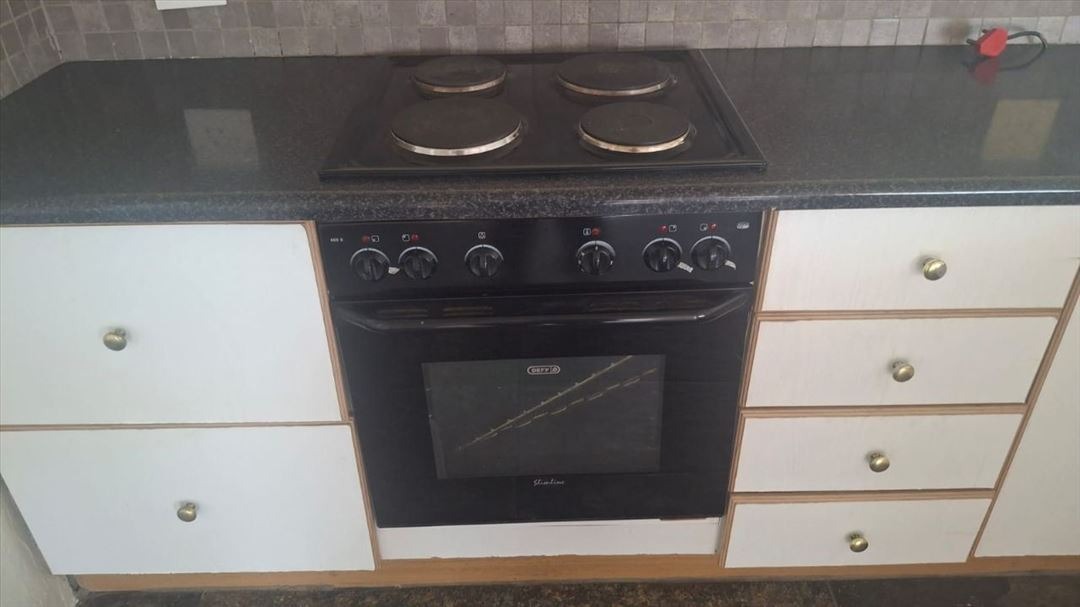Kitchen: A spacious open-plan melamine kitchen with tiled floors and walls, offering ample prep and storage space.