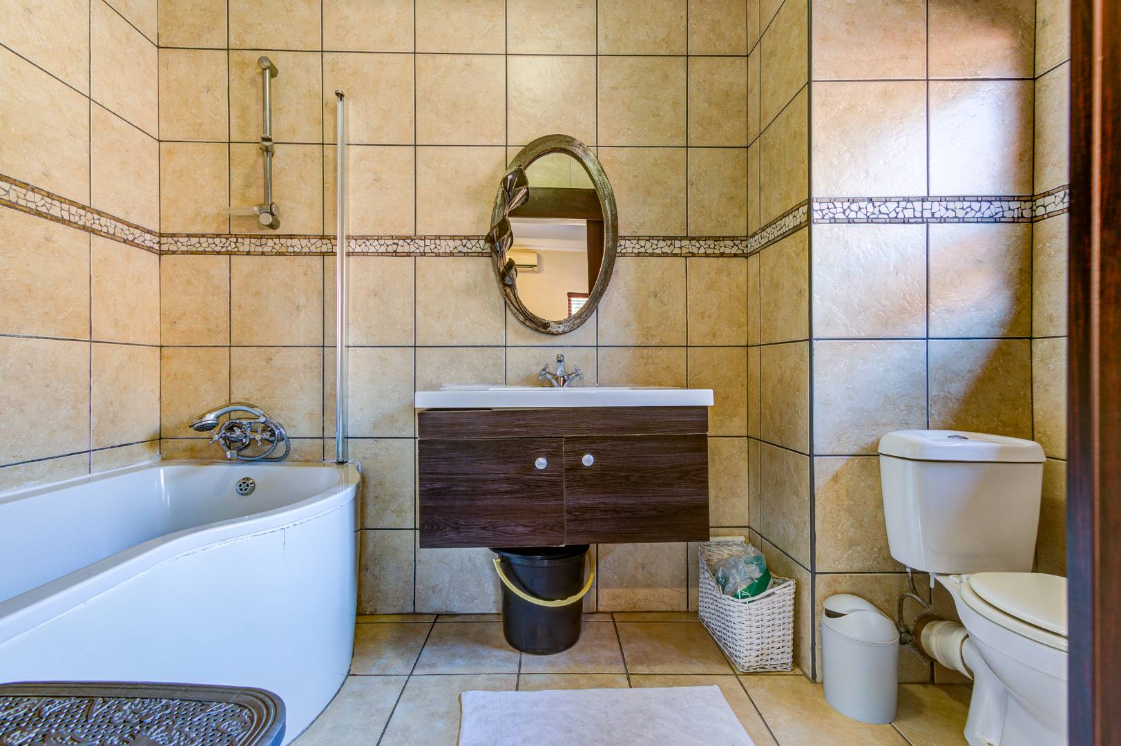 - Luxurious laminated main bedroom with air-conditioning, access to pool area, and a full en-suite bathroom featuring corner bath, shower, and his & her basins