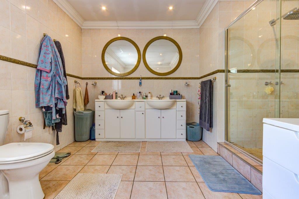 - Luxurious laminated main bedroom with air-conditioning, access to pool area, and a full en-suite bathroom featuring corner bath, shower, and his & her basins