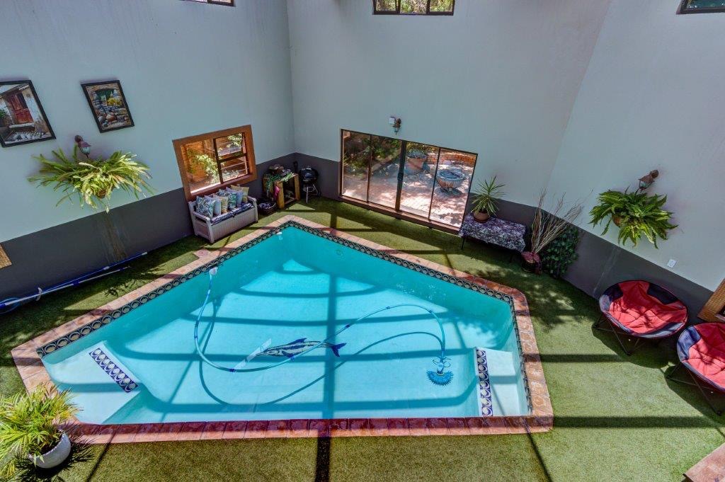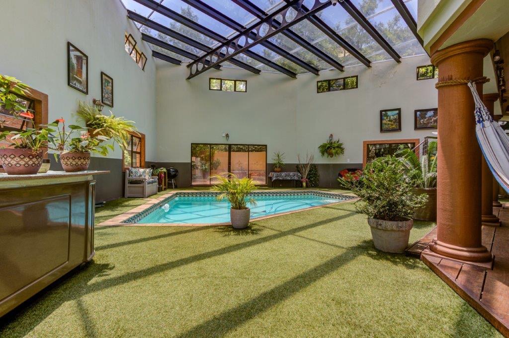 - Elegant tiled lounge with doors opening onto the patio and indoor pool area