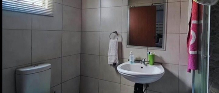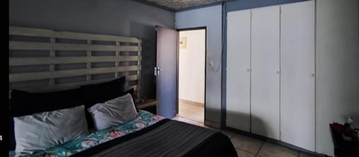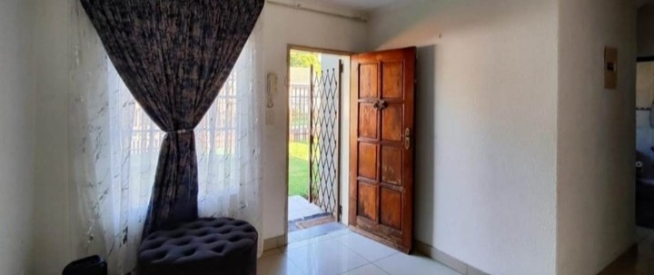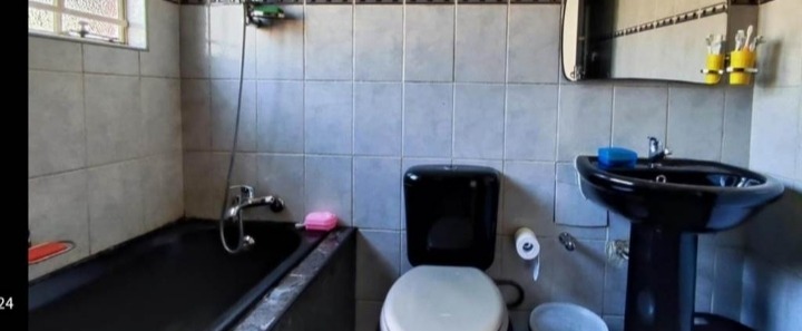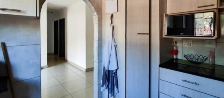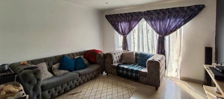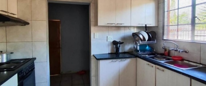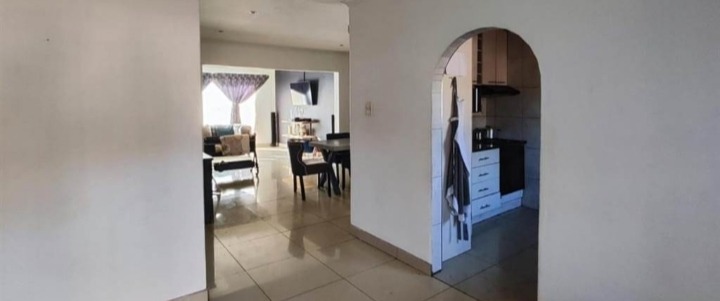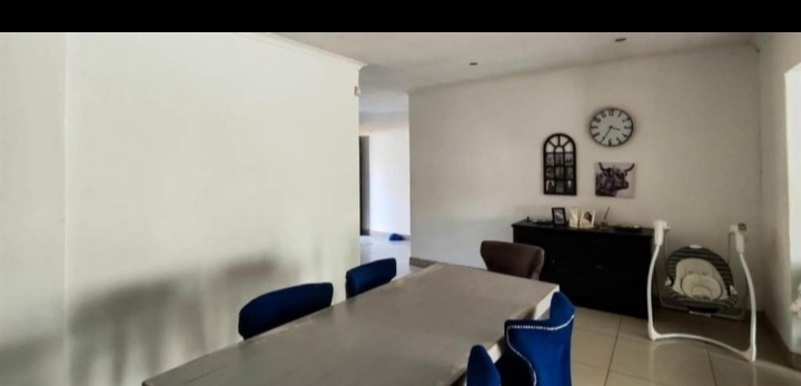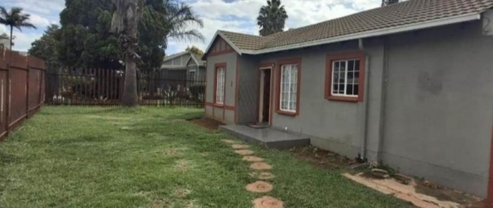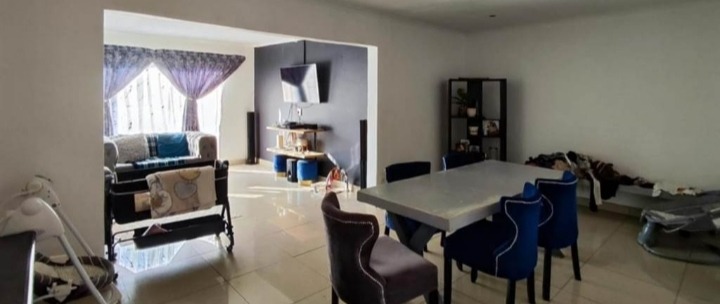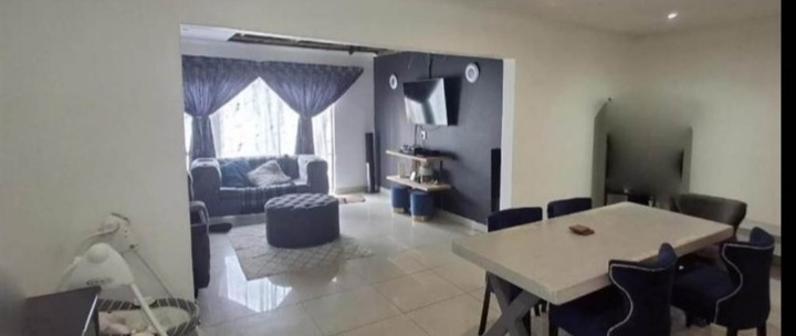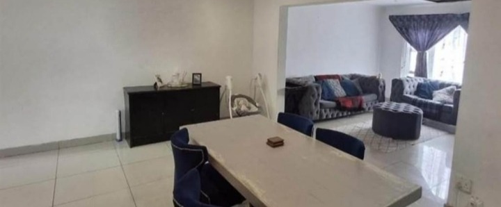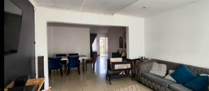 Discover this inviting 4-bedroom, 2-bathroom family home located in the desirable Terenure suburb of Kempton Park, South Africa. This residence offers a modern grey exterior with distinctive trim, a tiled roof, and a large, fenced grassy yard, providing excellent outdoor space. Inside, the open-plan living and dining area features tiled flooring and abundant natural light, creating a welcoming atmosphere. The contemporary kitchen is equipped with white cabinets, black countertops, a tiled backsplash, and a built-in stove and microwave. With two parking spaces and a security gate, this property combines comfort with practicality in a convenient location.