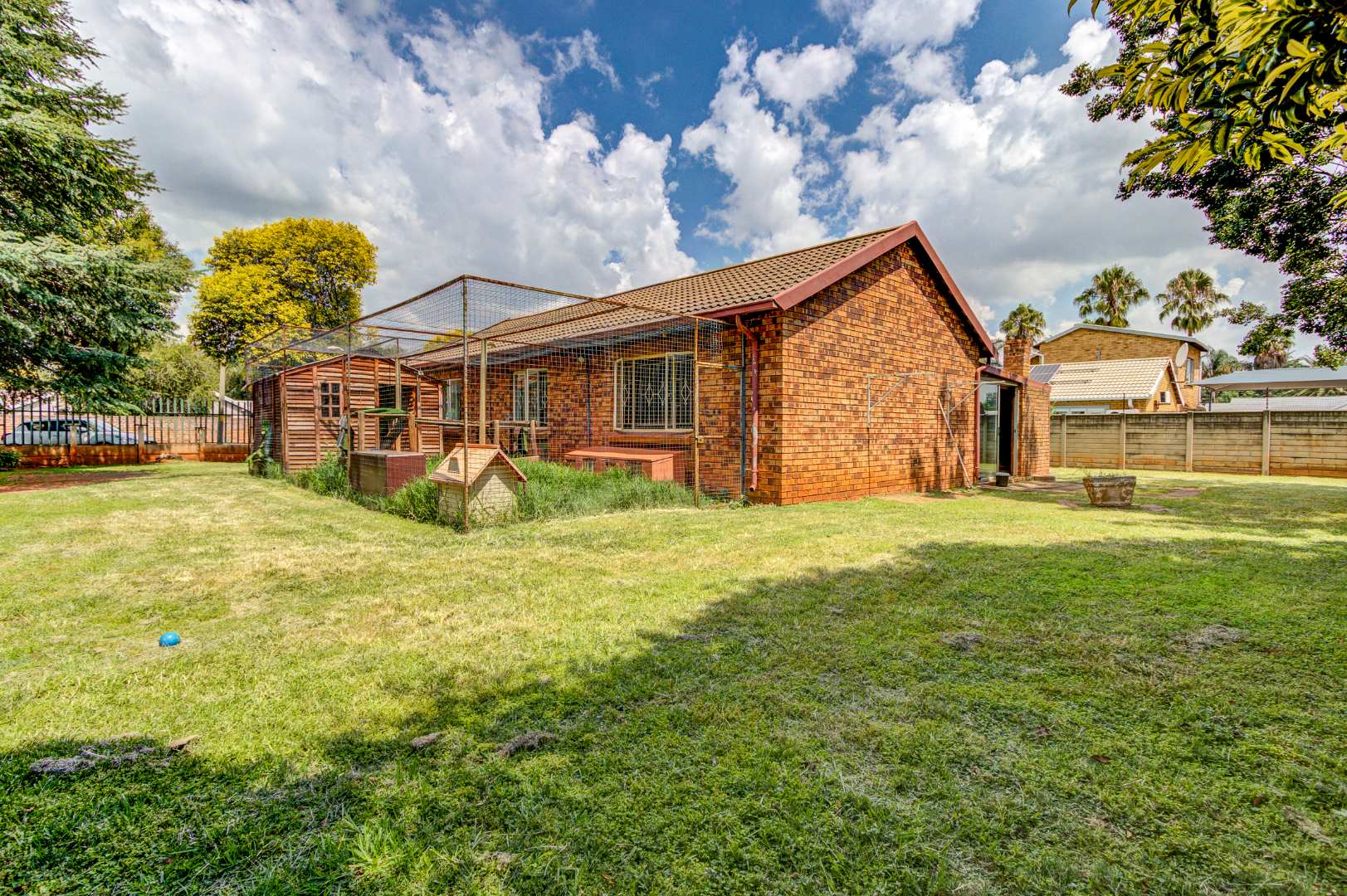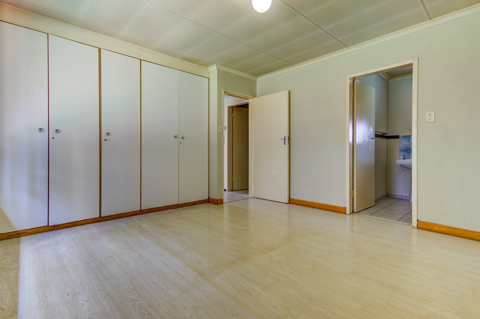 There are 3 well-sized bedrooms with built-in cupboards and 2 full bathrooms. One bathroom includes a bath, while the main bedroom offers an en-suite bathroom with a shower.