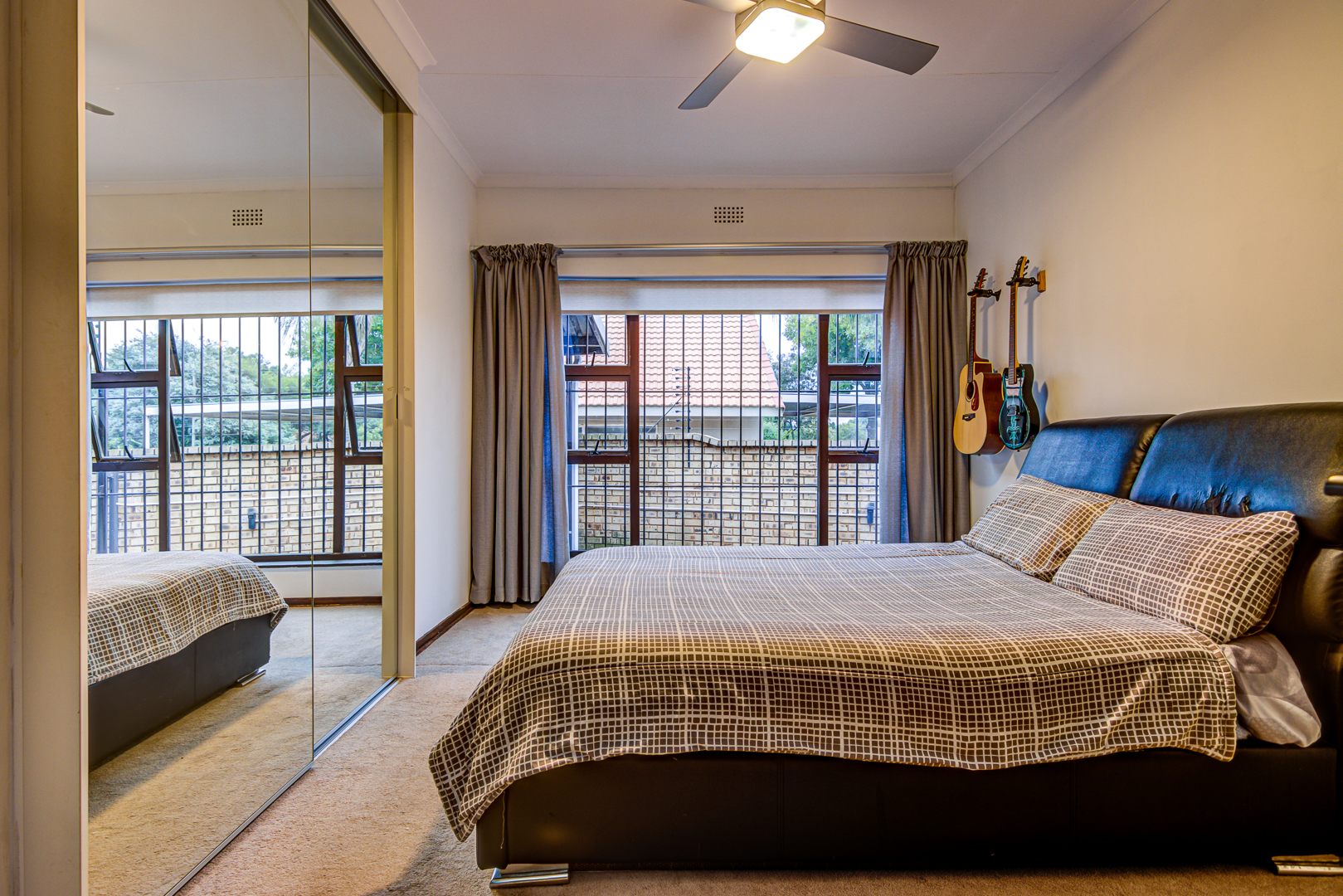 - Bedroom 2: Carpeted with built-in cupboards (mirror doors) and ceiling fan