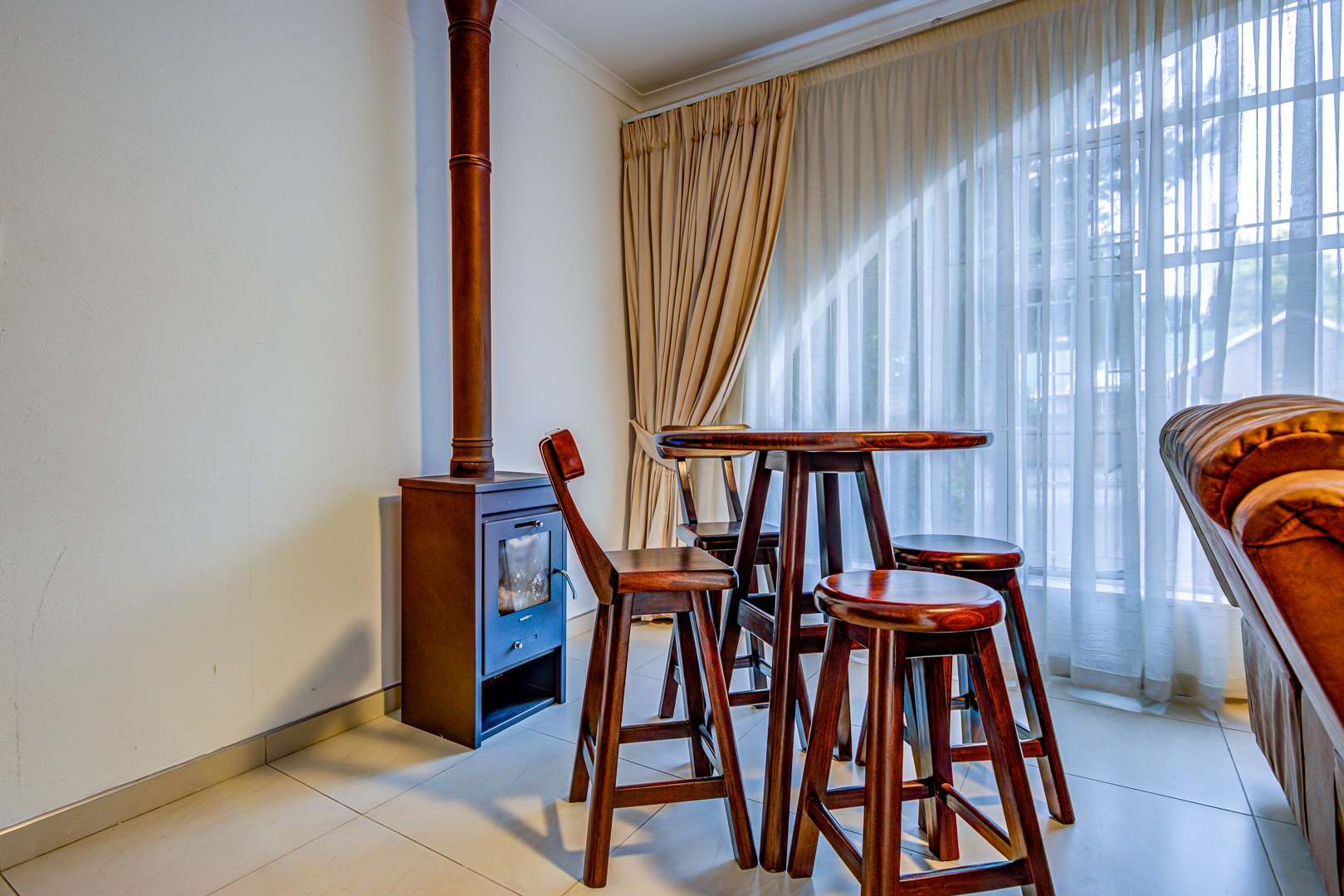 - Spacious tiled family room with fireplace and sliding doors opening onto the garden