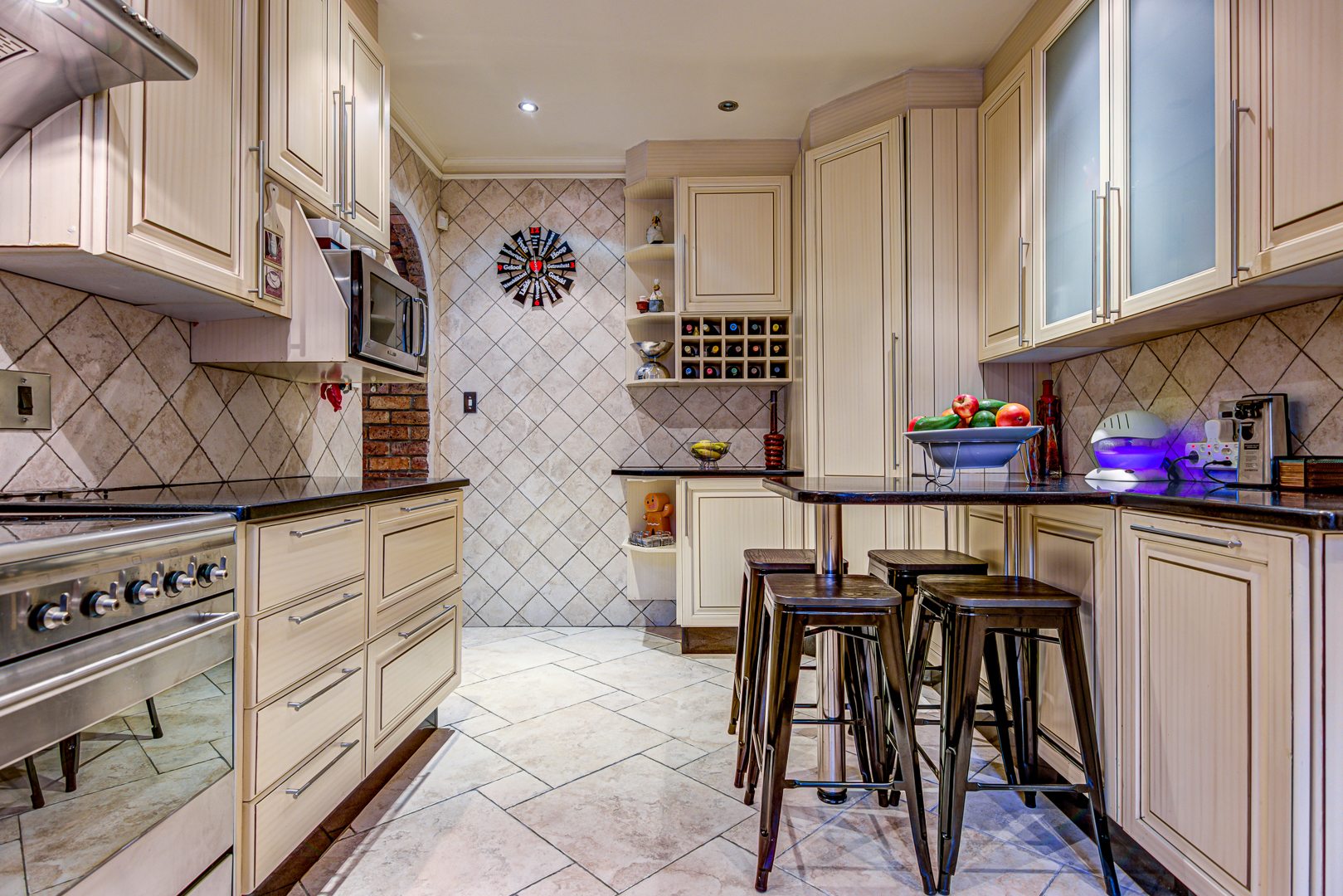 - Modern tiled kitchen with granite countertops, glass hob, pantry