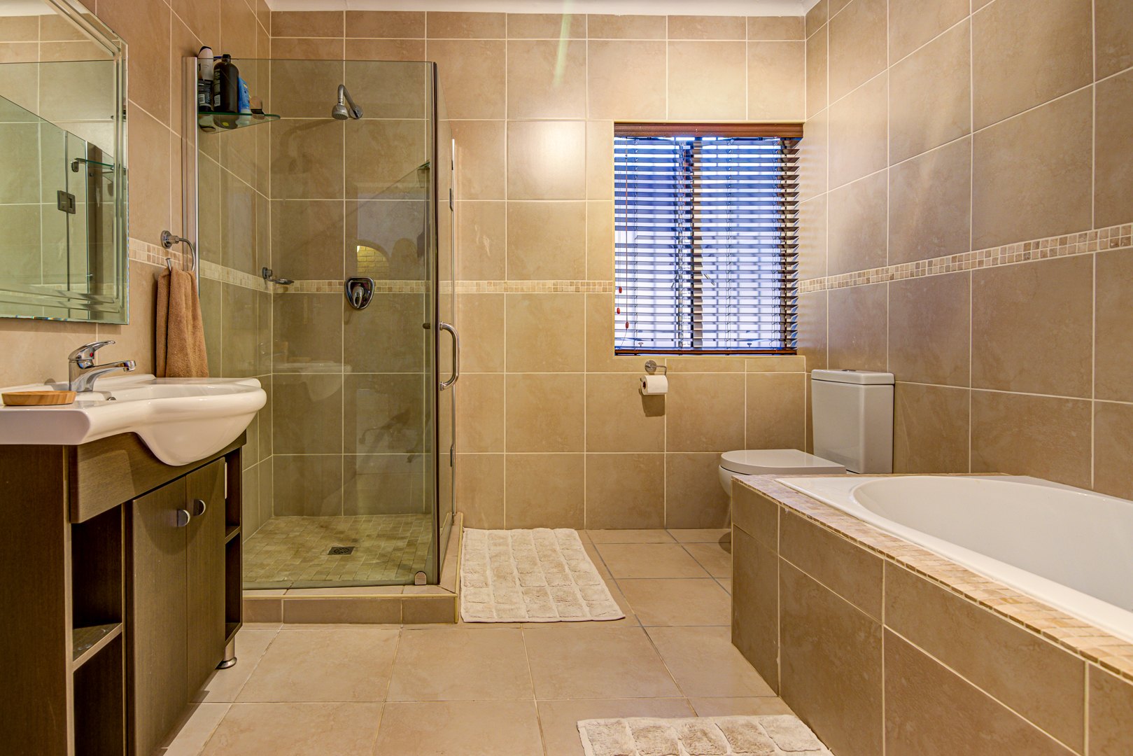 - Bathroom with bath, shower, toilet, and basin