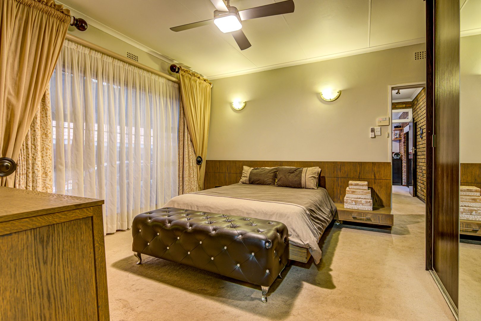 - Main bedroom: Large and carpeted, with blinds, ceiling fan, and mirrored sliding doors