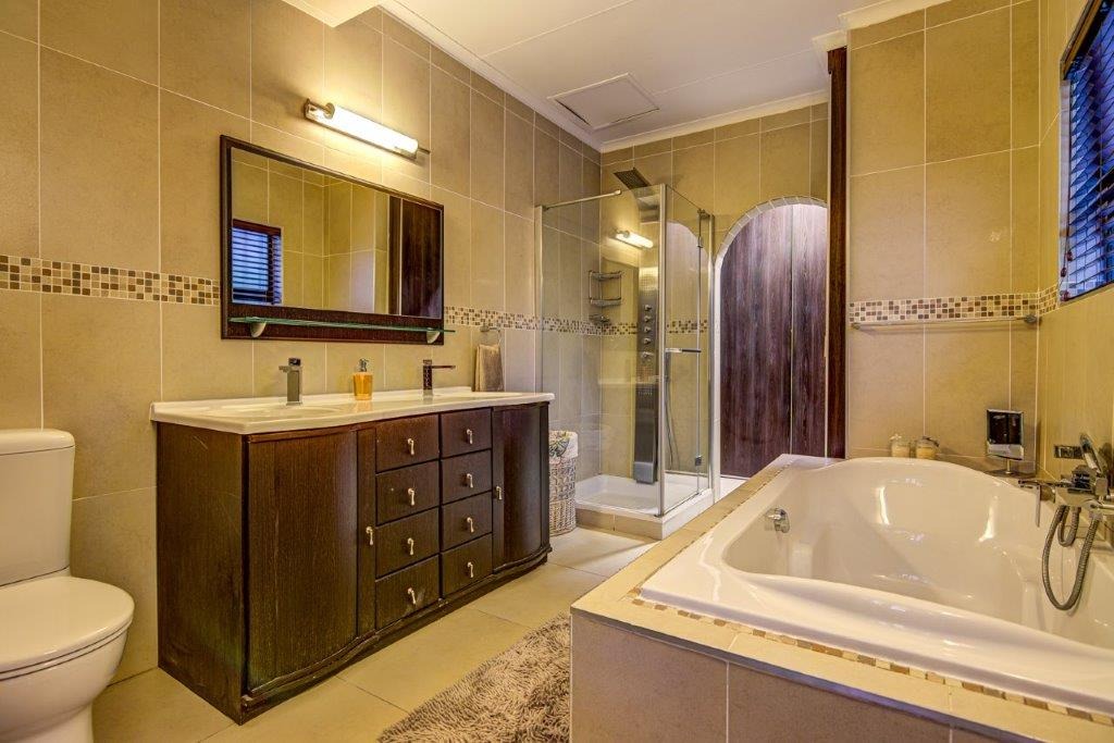 Full en-suite bathroom with bath, shower, and his-and-her basins