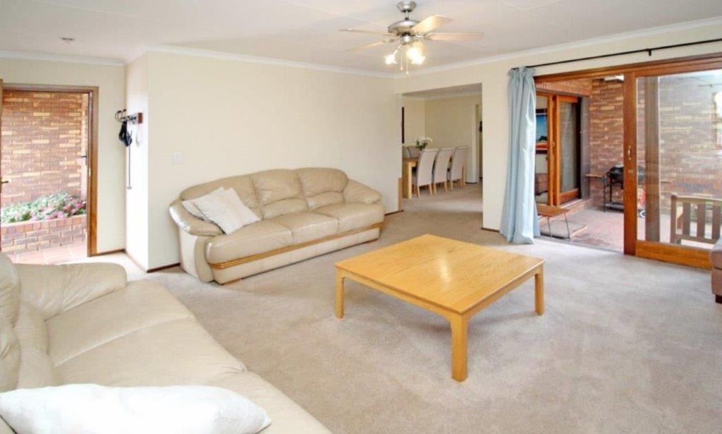 This lovely property offers true coziness with a large carpeted lounge and separate dining room, both opens up to a covered louvred roof patio. A large kitchen with hob, under counter oven and space for a dishwasher. Separate laundry and scullery. 3 Bedrooms, all carpeted with a large main bedroom with lots of built-in cupboards. 2 Tiled bathrooms (one en-suite) with bath and shower, the other with bath only. Double garage and small garden with manual sprinkler system. 2 Small dogs allowed.