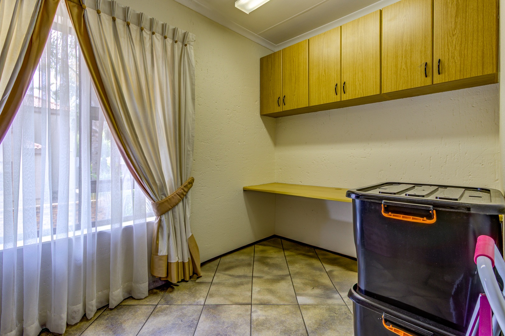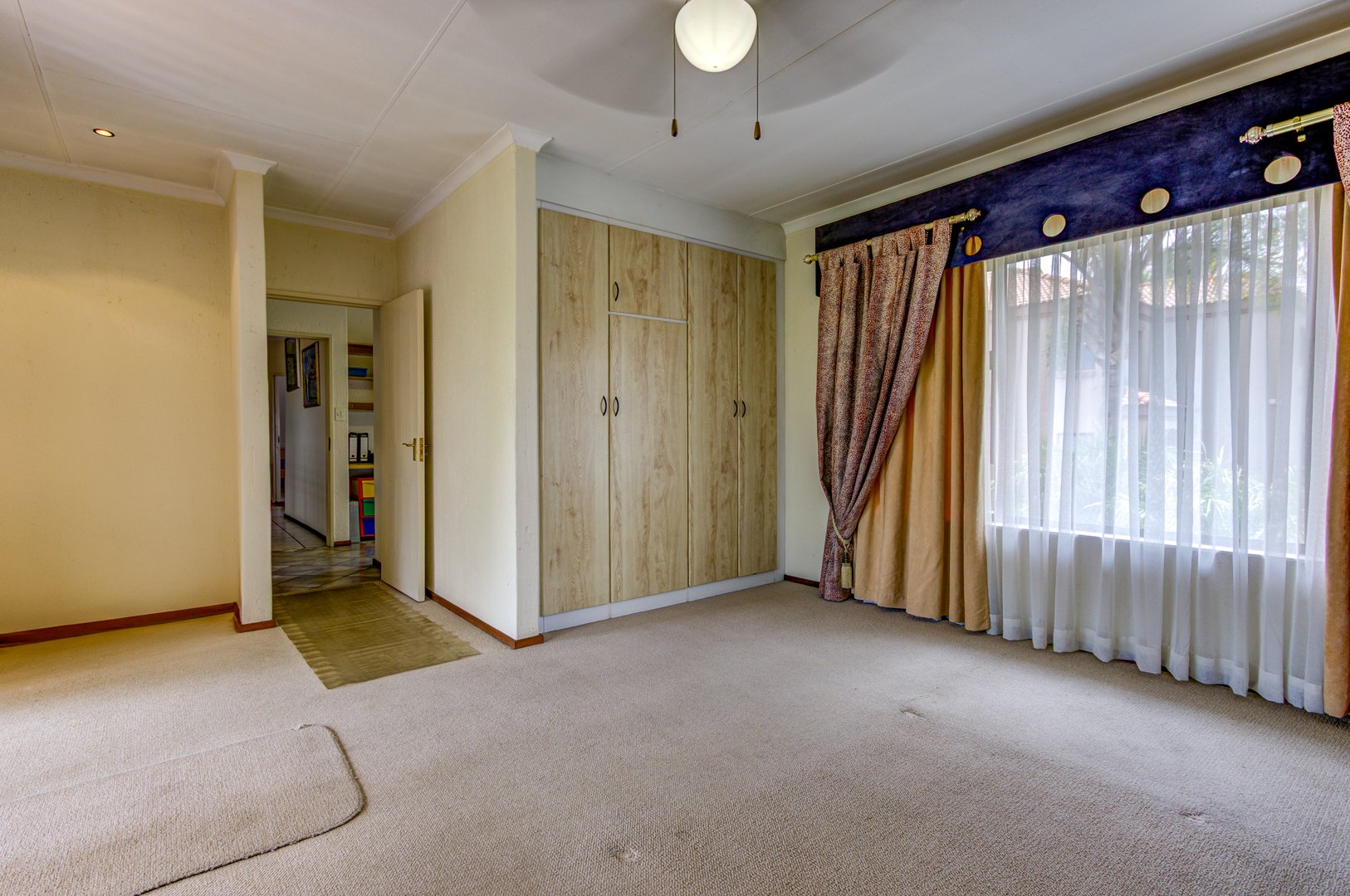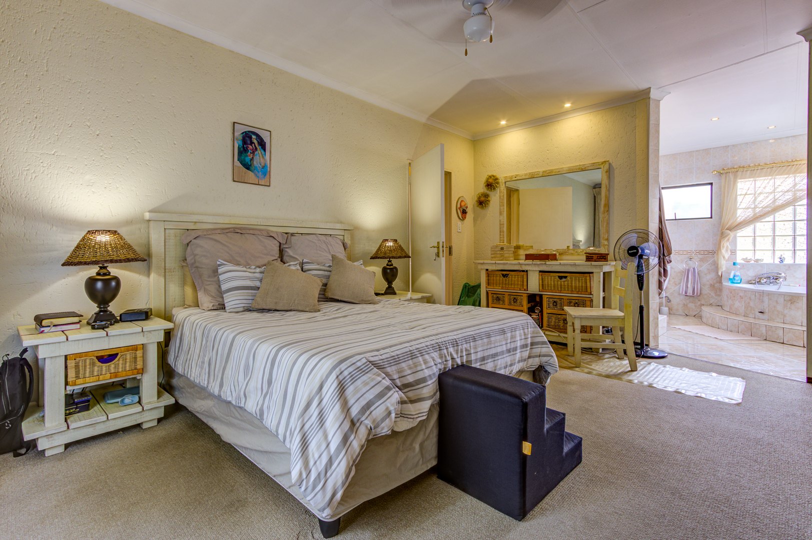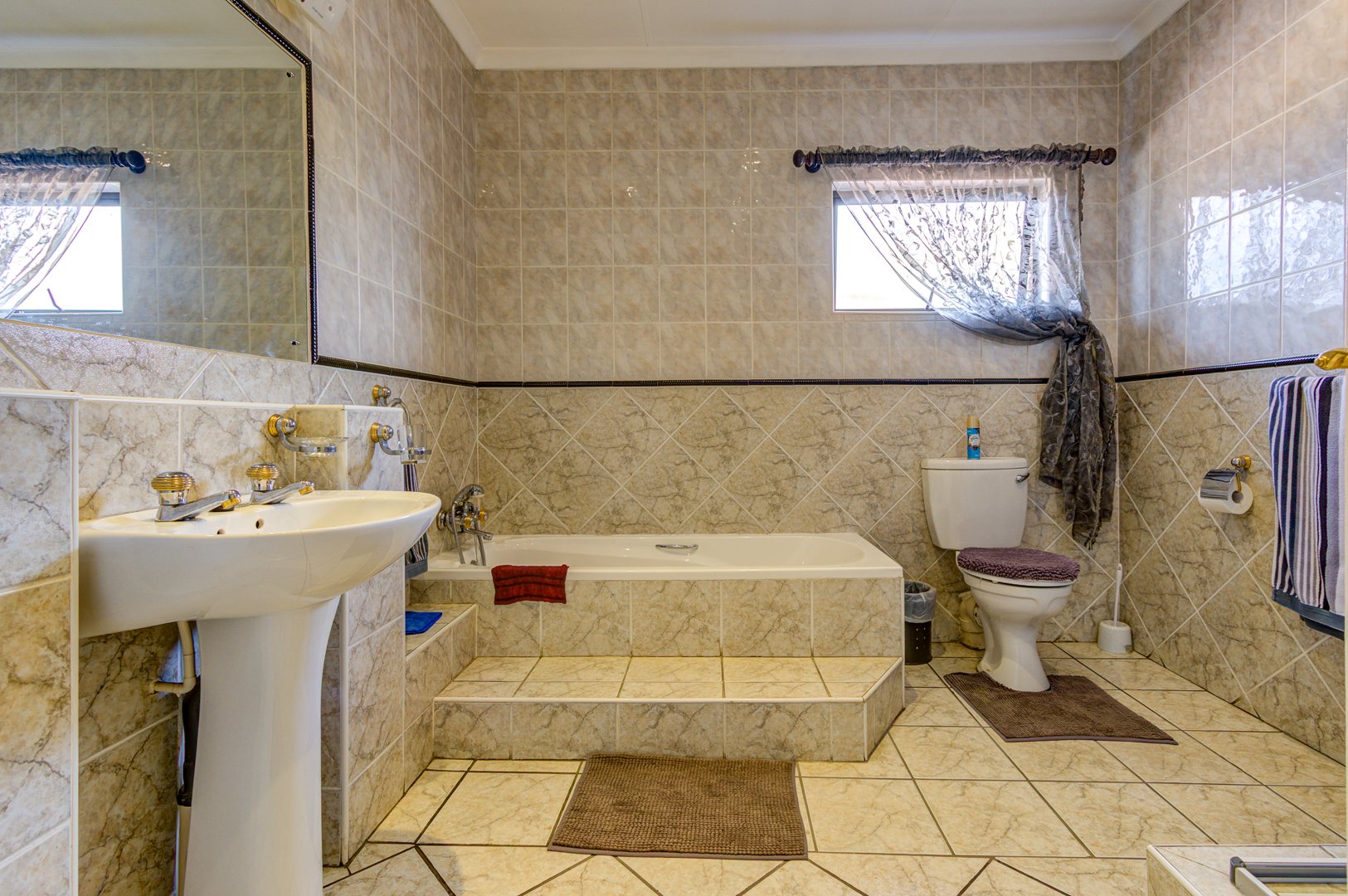 Upstairs you will find 4 large carpeted bedrooms all with ceiling fans and a balcony. a tiled study room with built-in shelves. 2 Fully tiled bathrooms, both with bath and shower and main en-suite has corner bath with his-and-hers (double) basin. 4 Garages with automated wooden doors. Large Marbelite pool. Tiled servants room with en-suite bathroom. Extras: Store room, 5kva inverter, Aluminium window frames, 24hour guards/ patrol. Close to schools and all amenities.