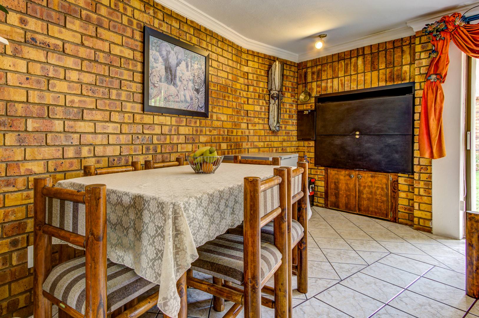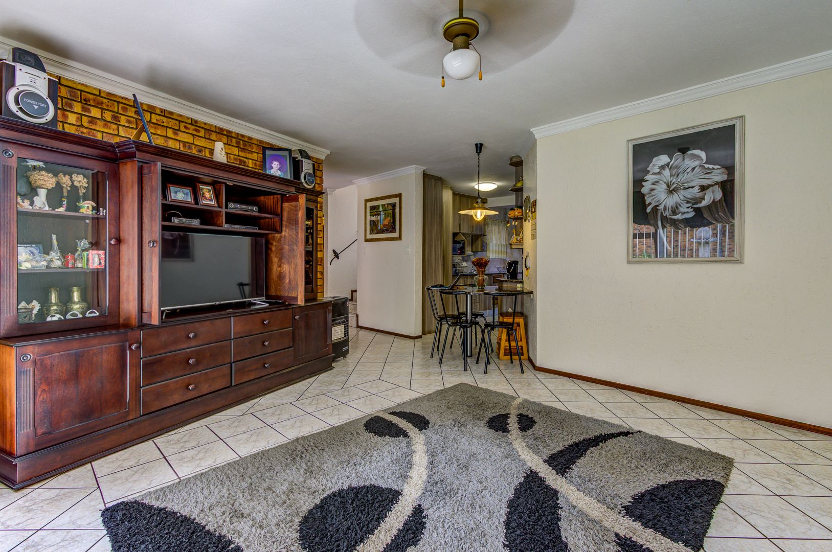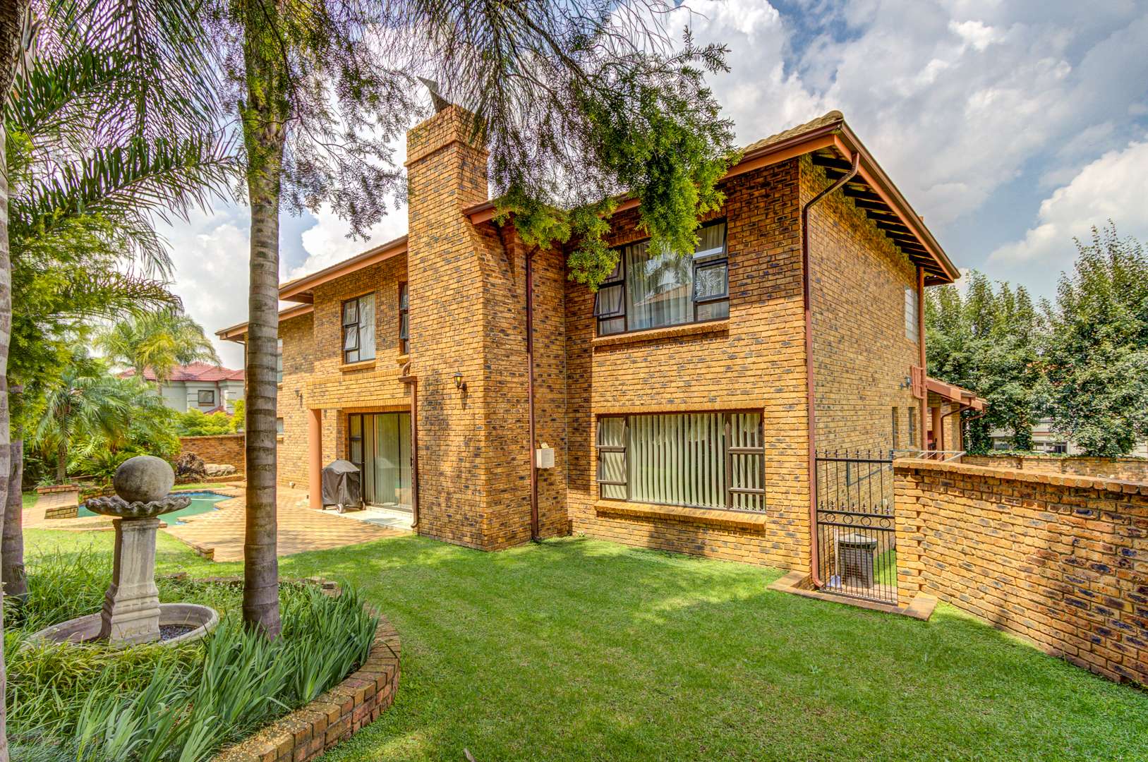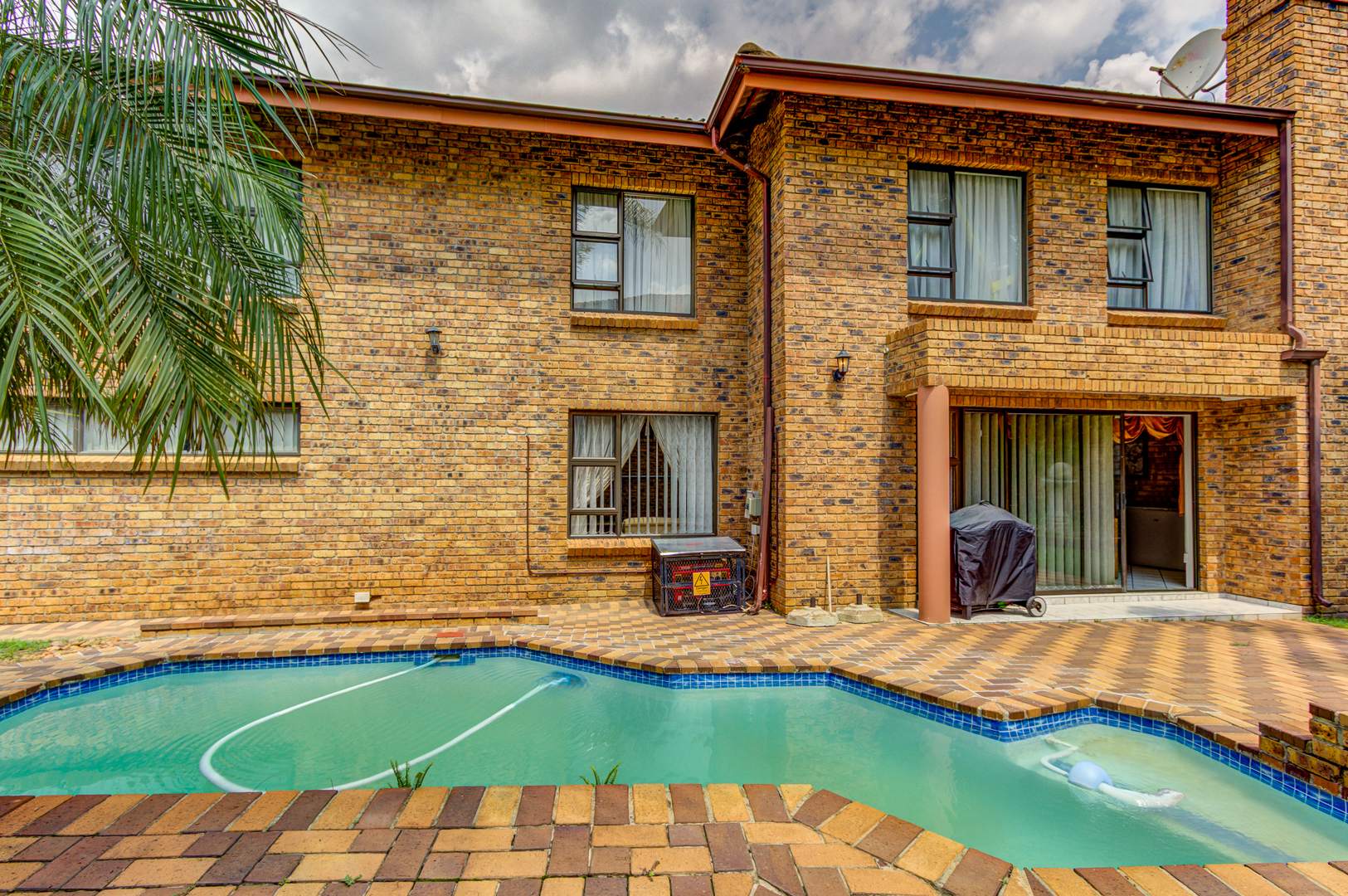 This double storey house consists of the following: as you enter this house, you are overwhelmed with space. Large tiled entrance leading to a carpeted lounge. A guest bathroom to serve your guests. A large tiled family room overlooking the open plan kitchen. Large modern kitchen with Granite tops, lots of built-in cupboards, breakfast counter and a large scullery to fit 3 appliances. Conveniently located in a large entertainment area with a built-in braai and bar counter with shelves. This leads to the sparkling blue pool and garden.