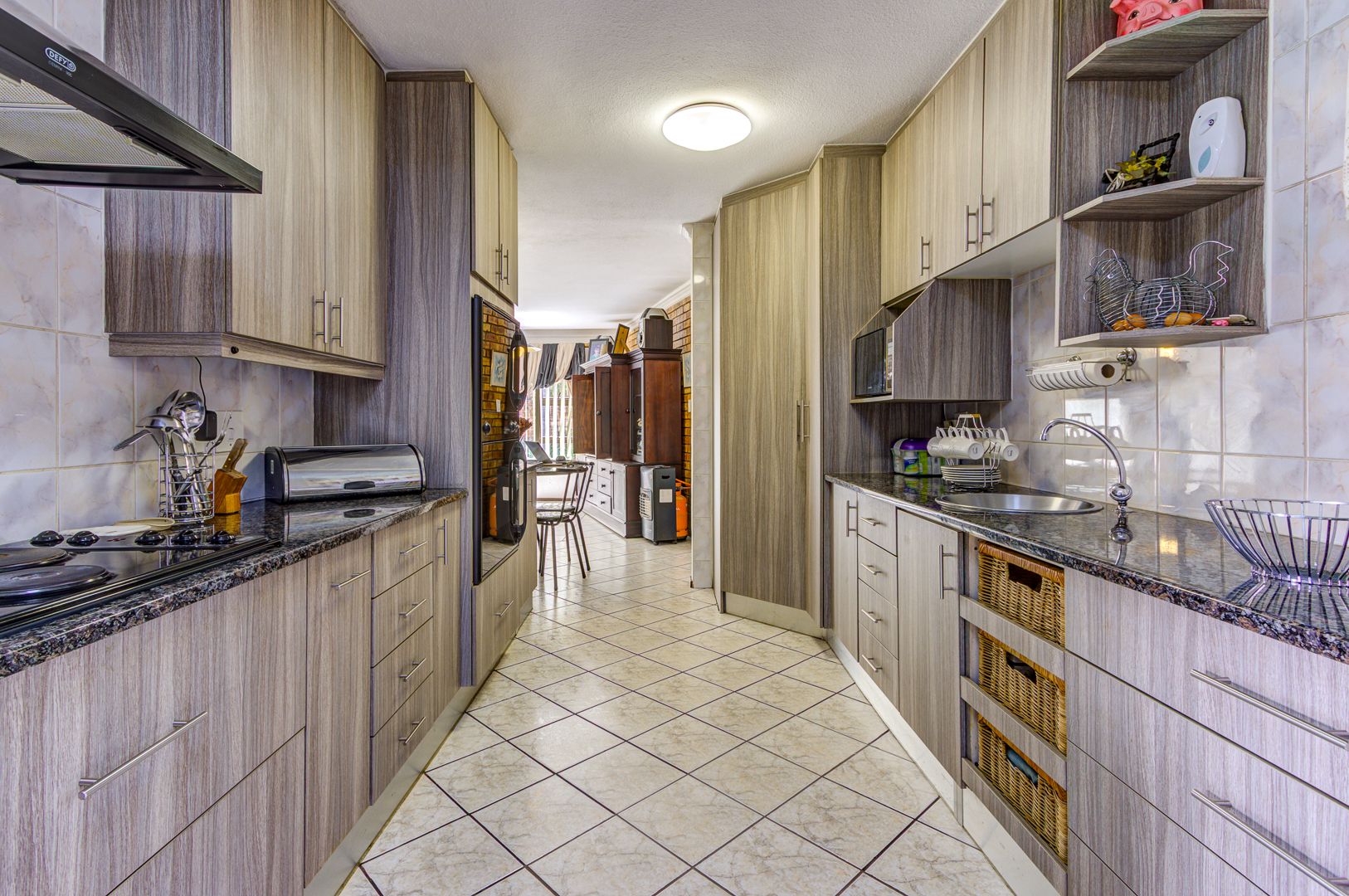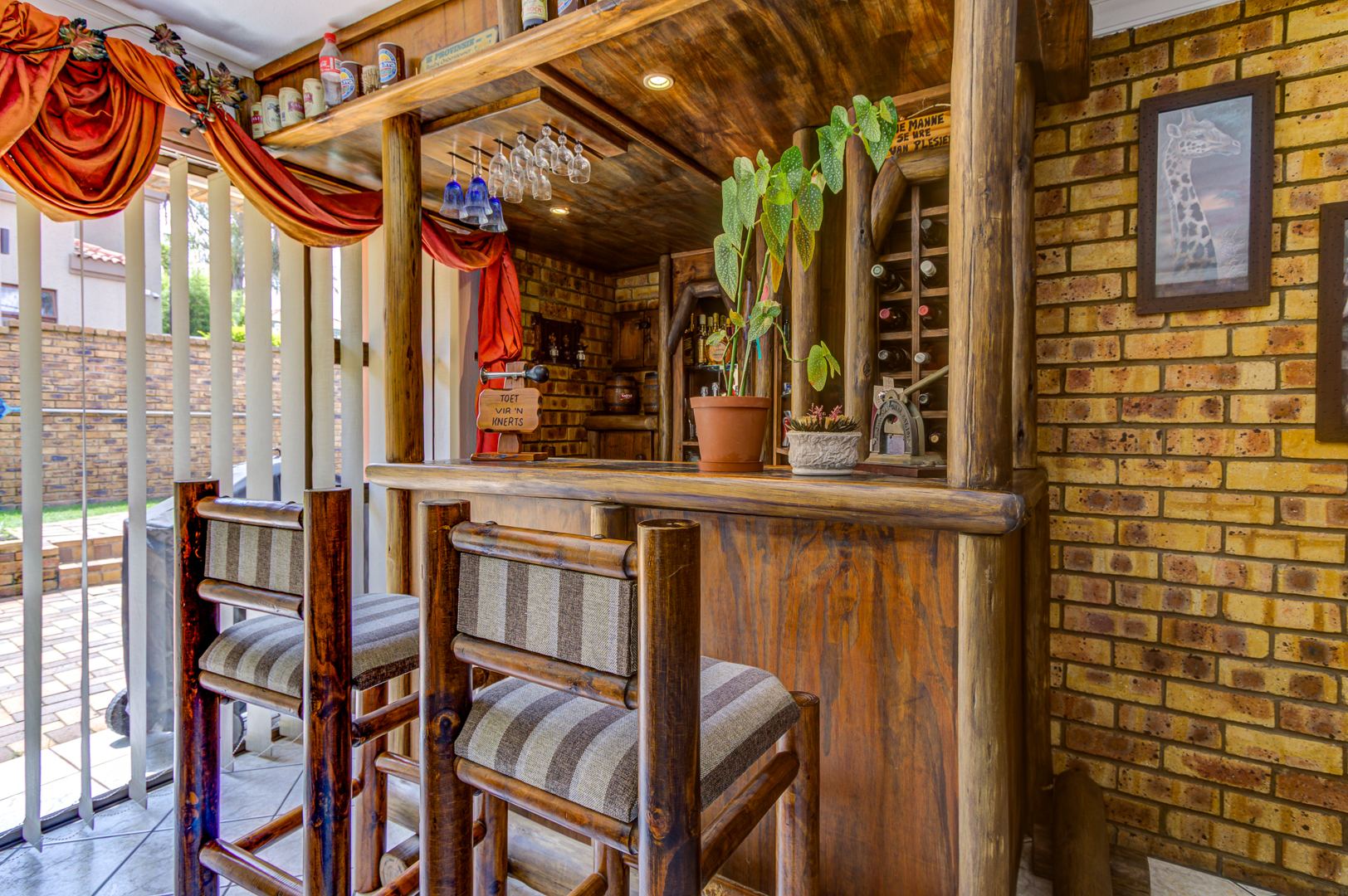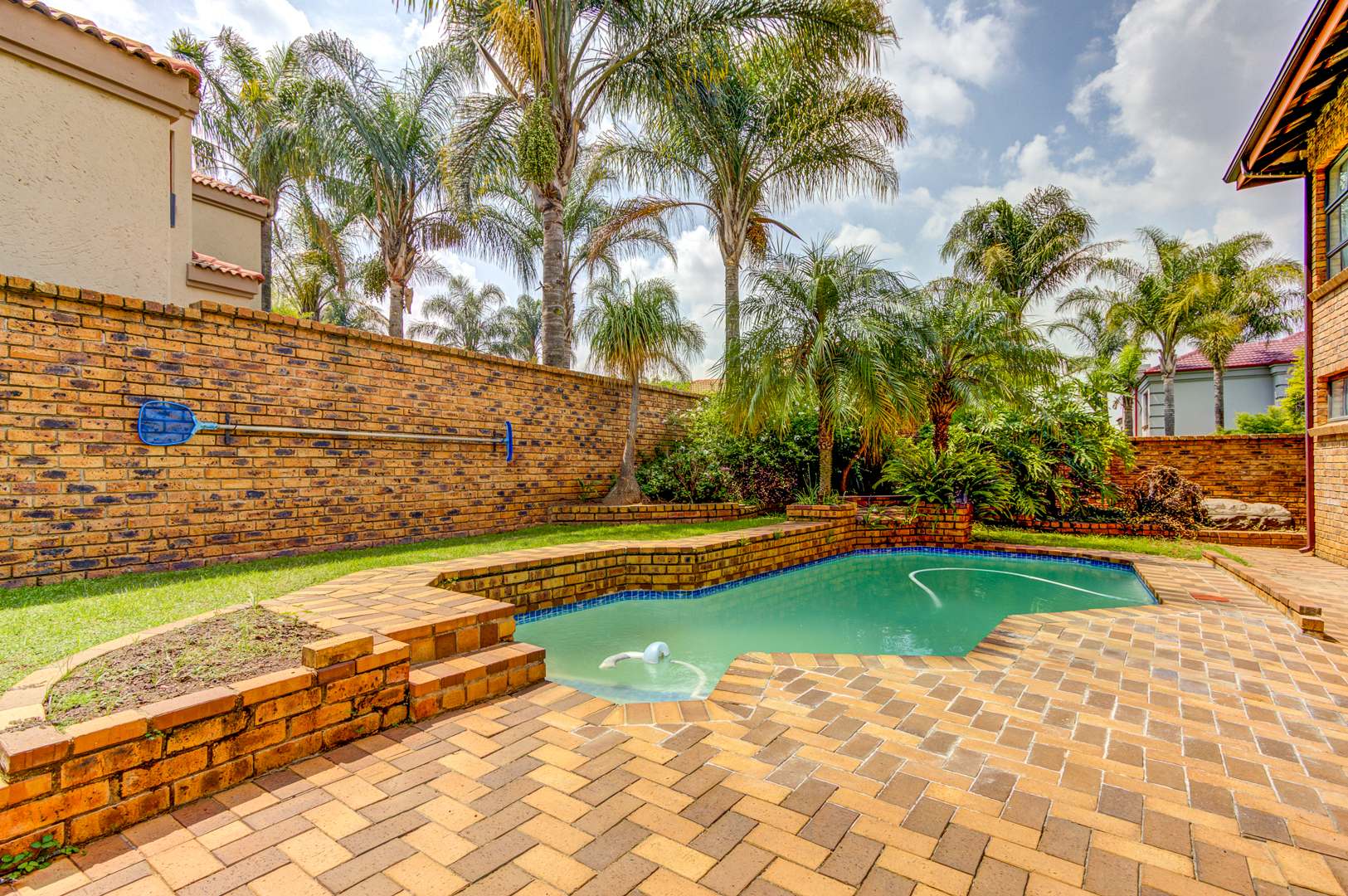 This double storey house consists of the following: as you enter this house, you are overwhelmed with space. Large tiled entrance leading to a carpeted lounge. A guest bathroom to serve your guests. A large tiled family room overlooking the open plan kitchen. Large modern kitchen with Granite tops, lots of built-in cupboards, breakfast counter and a large scullery to fit 3 appliances. Conveniently located in a large entertainment area with a built-in braai and bar counter with shelves. This leads to the sparkling blue pool and garden.