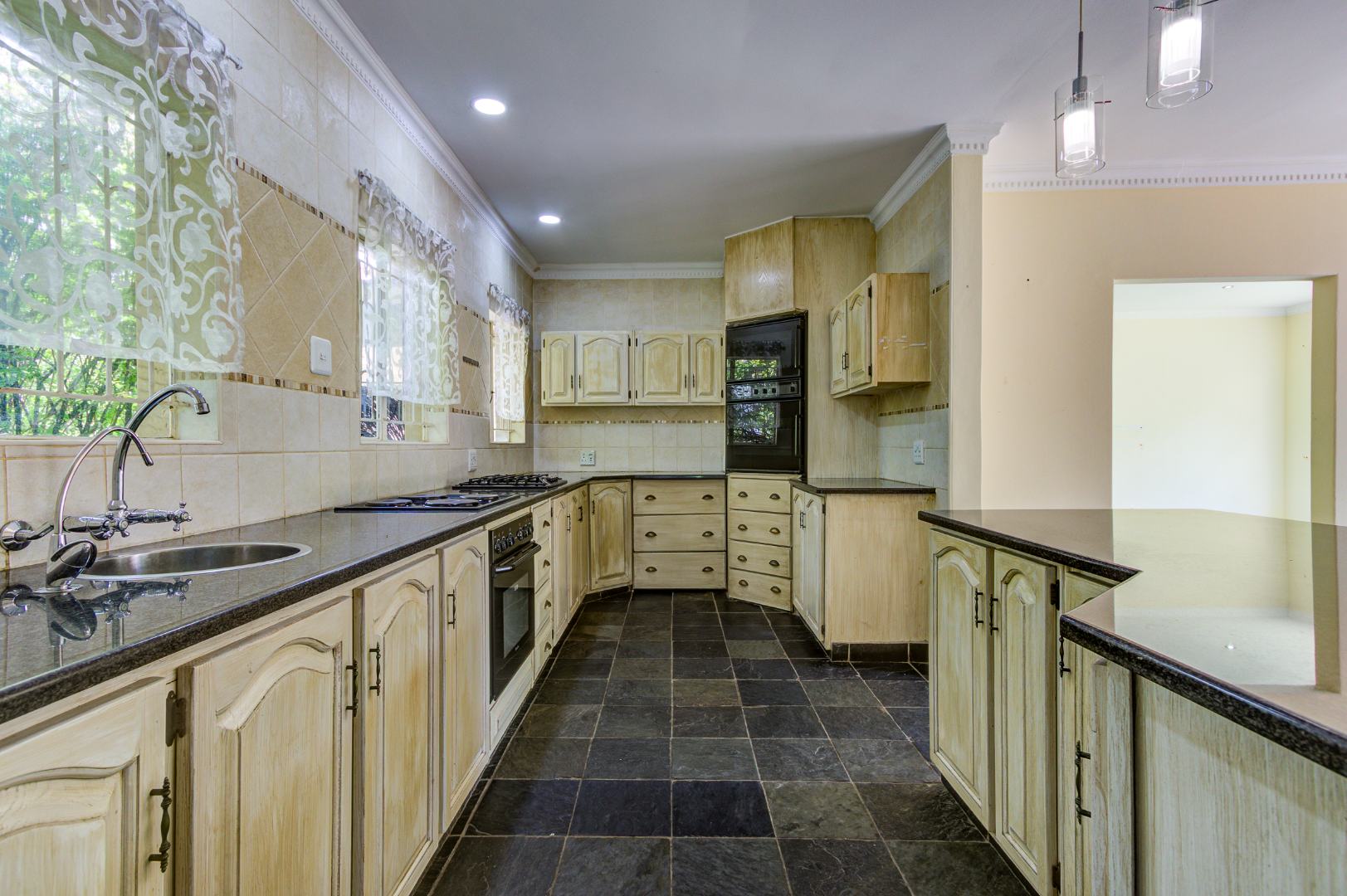 The well-sized kitchen boasts ample granite counter space, light cabinetry, a built-in double oven, gas hob, standard hob and undercounter oven and plenty of natural light. A separate scullery combined laundry adds everyday convenience.