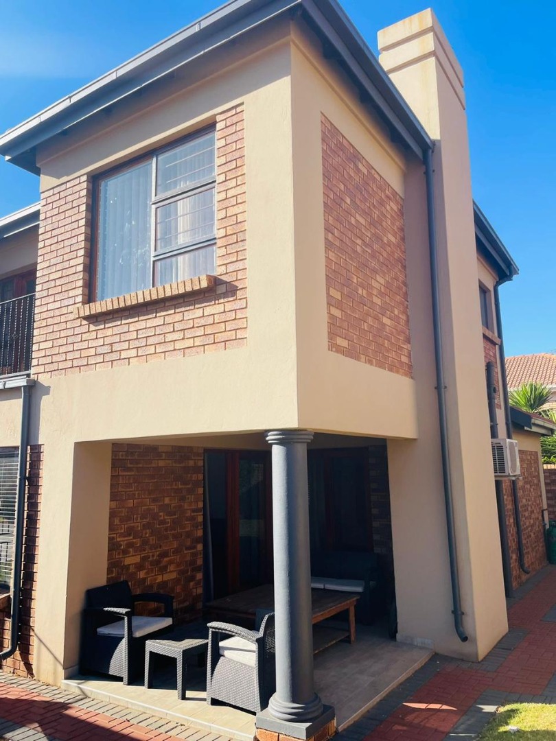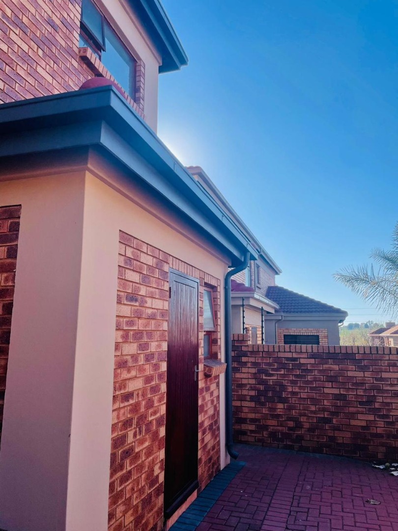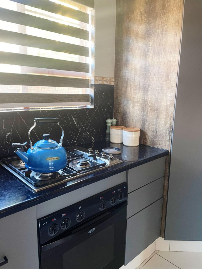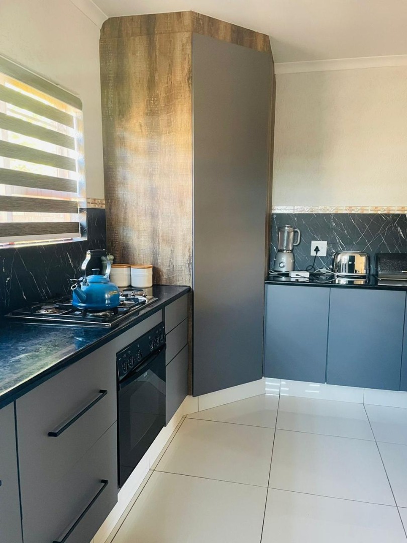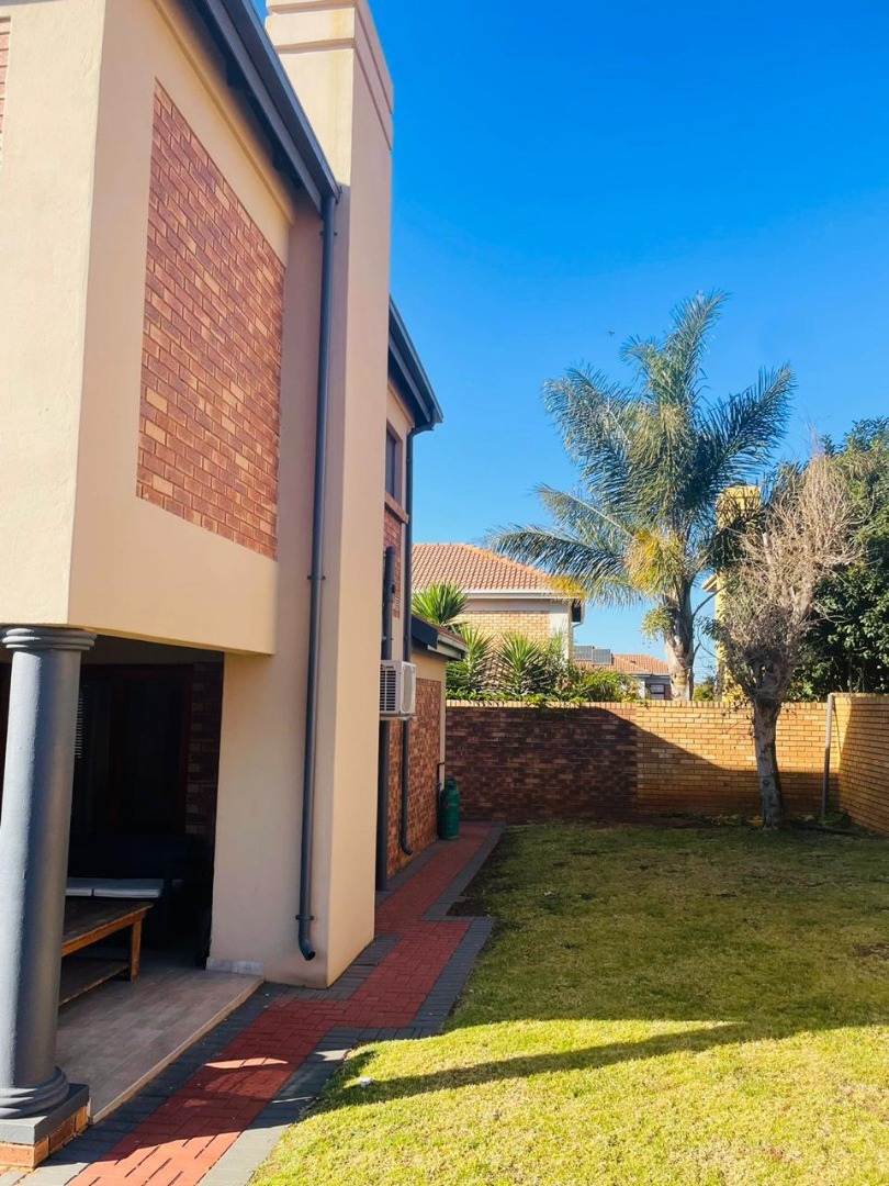 Discover this modern four-bedroom, three-bathroom residence located in the desirable Van Riebeeck Park, Kempton Park. The property immediately impresses with its striking kerb appeal, featuring a multi-story design, a prominent entrance with decorative columns, and a well-maintained exterior combining brick and painted plaster. Two double garages and a paved driveway offer ample parking and storage, while a balcony provides additional outdoor living space. Step inside to an interior designed for contemporary living. The heart of the home is a sleek, open-plan kitchen boasting dark grey and wood-textured cabinetry, black countertops, and a stylish marble-effect backsplash. Integrated appliances, including a gas hob and oven, complement the modern aesthetic. An elegant breakfast bar and a dining area with a glass table and velvet chairs create an inviting space for meals and entertaining. The bright living area features high ceilings, large windows, and a combination of tiled and carpeted flooring, ensuring comfort and style. Accommodation includes four spacious bedrooms and three bathrooms, with one en-suite, providing ample comfort for the entire family. Outdoors, a covered patio extends to a private, well-maintained grassy backyard with a paved pathway, perfect for relaxation or small gatherings. The property benefits from established landscaping and visible security features such as burglar bars and electric fencing, enhancing peace of mind. With an erf size of 2392 sqm, this home offers a blend of modern design and practical living. Key Features: * Modern multi-story residence * Four bedrooms, three bathrooms (one en-suite) * Sleek, open-plan kitchen with integrated appliances * Two double garages and paved driveway * Covered outdoor patio and private backyard * Balcony for additional outdoor enjoyment * Visible security features including electric fencing * Contemporary finishes throughout